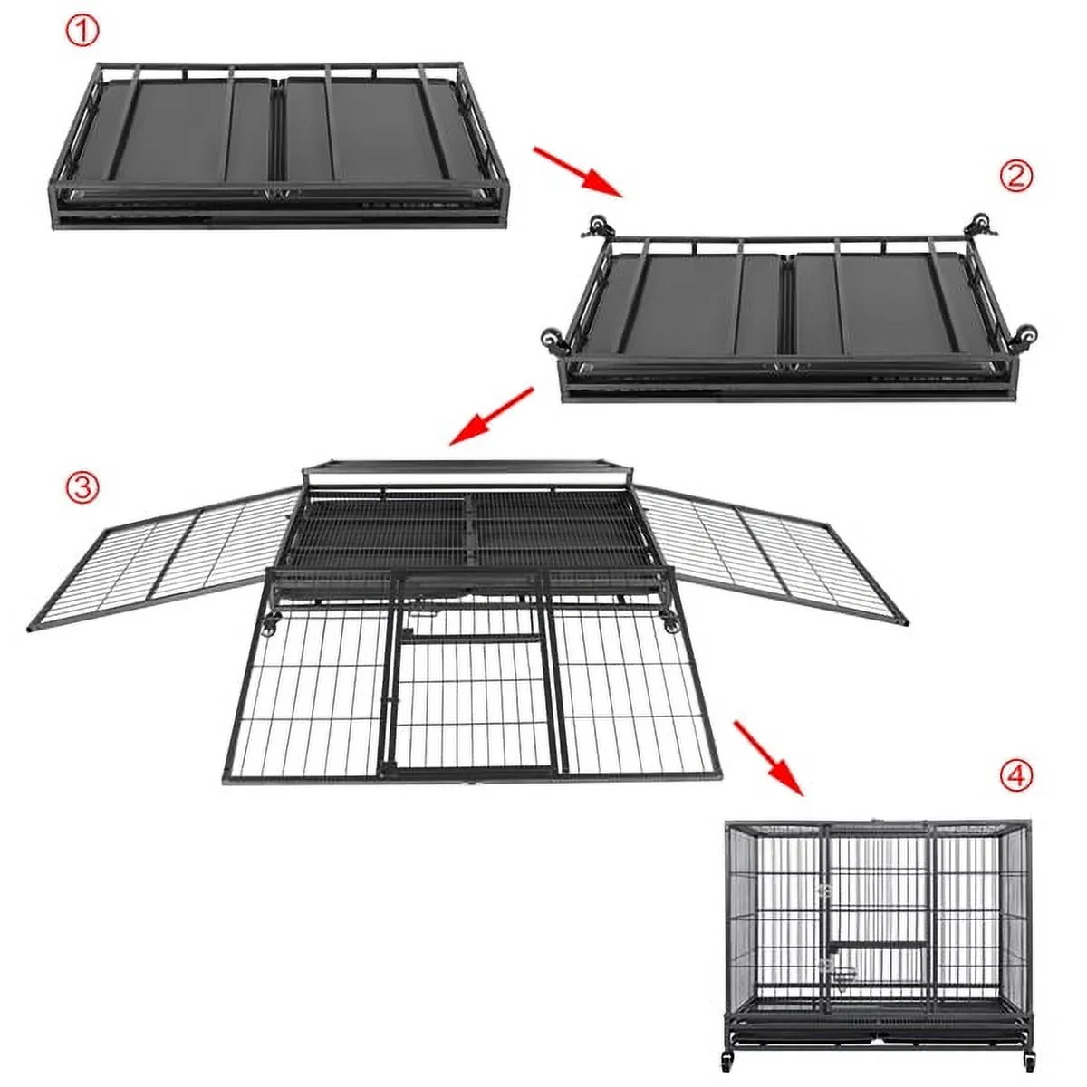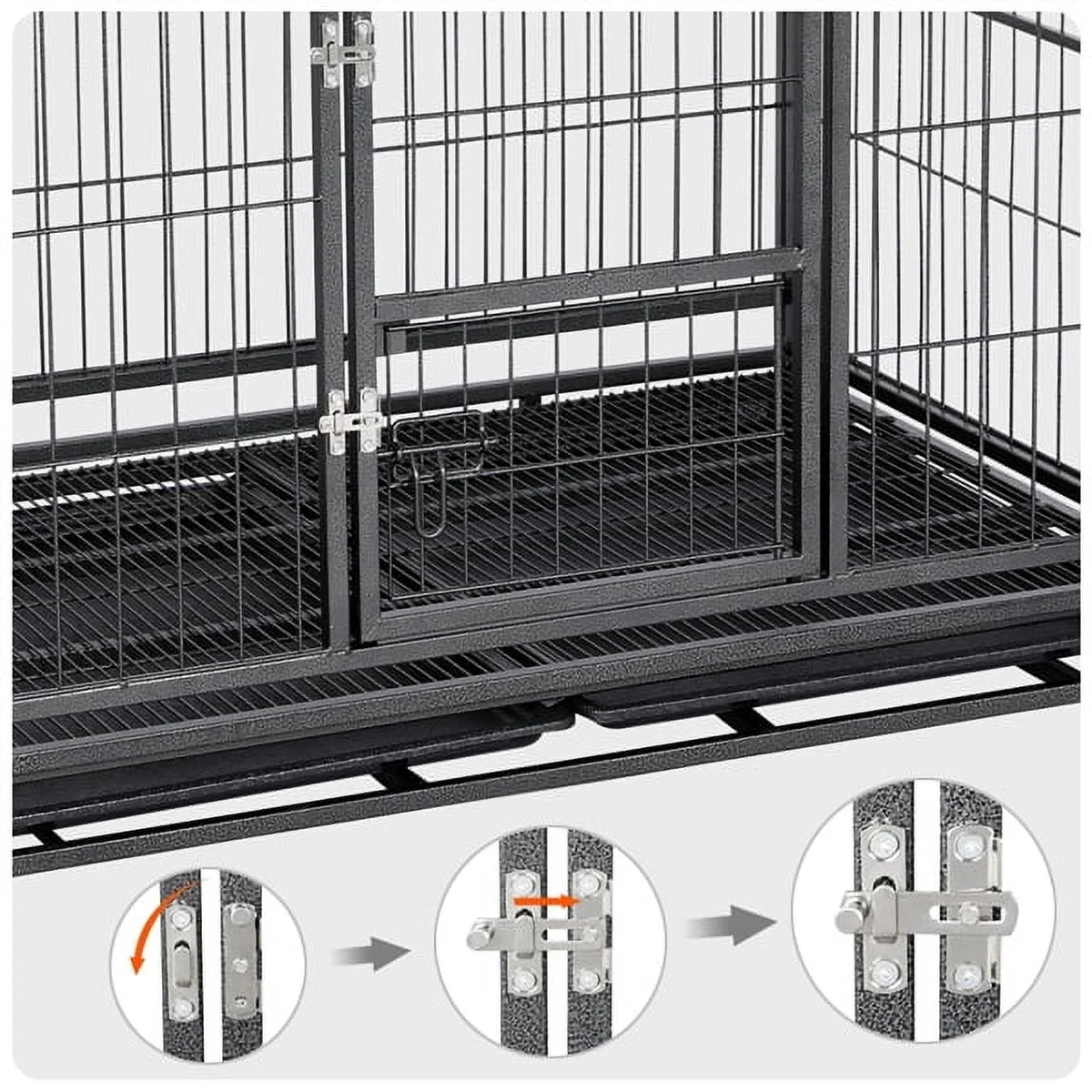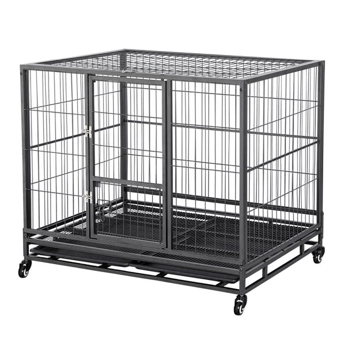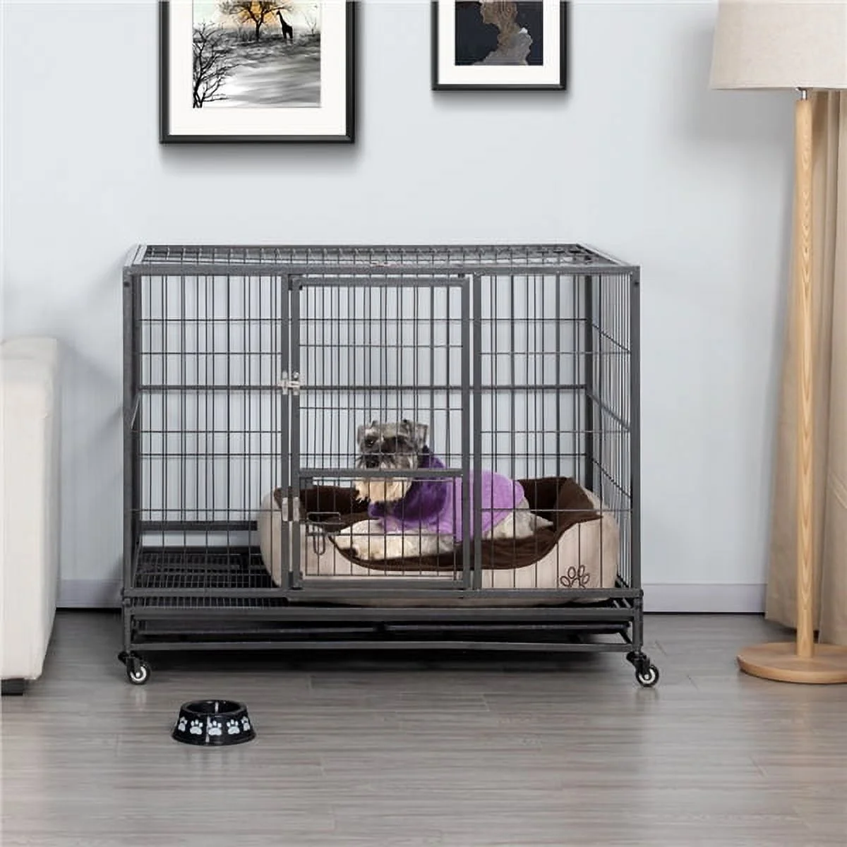 *Features: Guaranteed durability: Our robust dog crate is constructed of quality metal frame covered with non-toxic hammertone paint and durable ABS litter pan. Rust-resistance and solid construction render this dog cage strong and safe for your pets to use. Double door design: The deluxe dog crate has a side-opening door and a flip-up top, which allows for easy entry in virtually any location. Good mobility: This large dog crate features four 360-degree industrial casters to guarantee the smooth, convenient and effortless rolling, 2 casters with brakes makes it easy to lock the crate in place. Spacious for large dog: Since comfort is always key,dog cage measures 110cm/43 inches long, 28.7 inches wide, and 35 inches high, providing adequate space for medium and large dogs to stand up in, stretch out and lay down in as comfy as they can be. Safe latching system: We applied a 2-step lock to avoid your little talents opening the doors, which can effectively secure your pets when you can’t be there to supervise them. Extra feeding door: A small built-in door on the door that can be opened separately renders convenience for feeding. Make cleaning a breeze: Two separated slide-out pans beneath the cage can be removed and easily washed with water and mild cleanser; the grate between pets and pans prevents pets from walking/lying directly on the litter pans, ensuring your pets’ hygiene and the tidiness of the crate. Simple assembly required: This dog cage is delivered in a flat package. It only required a few minutes of easy assembly under the illustrated manual and a sturdy metal dog cage is ready for use! Necessary hardware and tools are included. Foldable design: Our dog crate can fold down into a compact size for storing in slim and narrow areas when not in use, and of course, sets up within seconds for easy use. Suitable dog breeds: Our large dog cage is recommended for large dog like German Shepherd, Golden Retriever, Rottweiler, German Shorthaired Pointer, Alaskan Malamute and medium dogs such as Labrador Retriever, Bulldog, Poodle, Siberian Husky, Australian Shepherd, Shiba Inu.