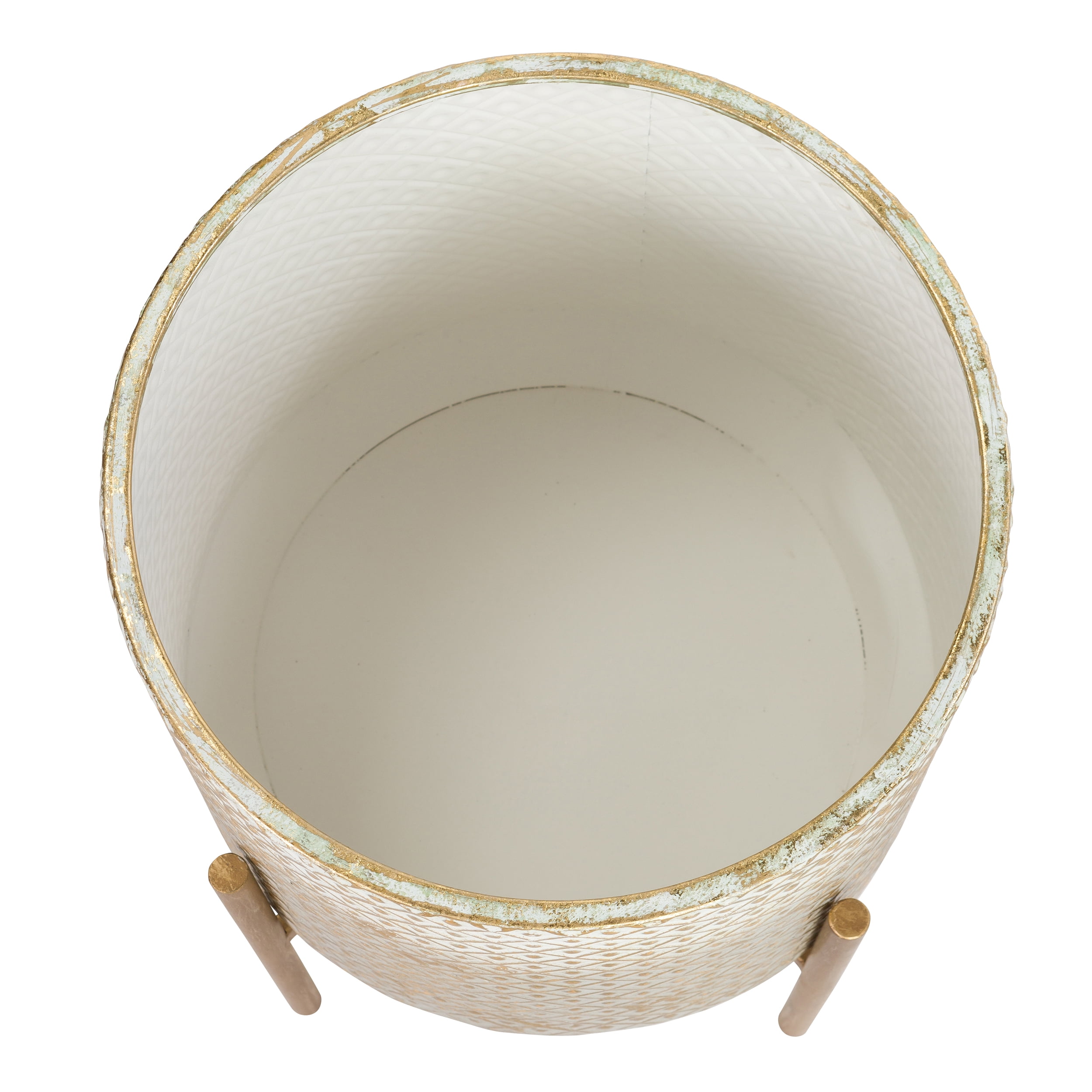 Set of 2 metal planters for plants 20.5″ x 13.5″ & 16.5″ x 11.75″ Bronze aged finish Crosshatch design Metal stand included Aspire Home Accents Traditional and modern style Bronze dotted embellishments Bronze, taupe, and white colors