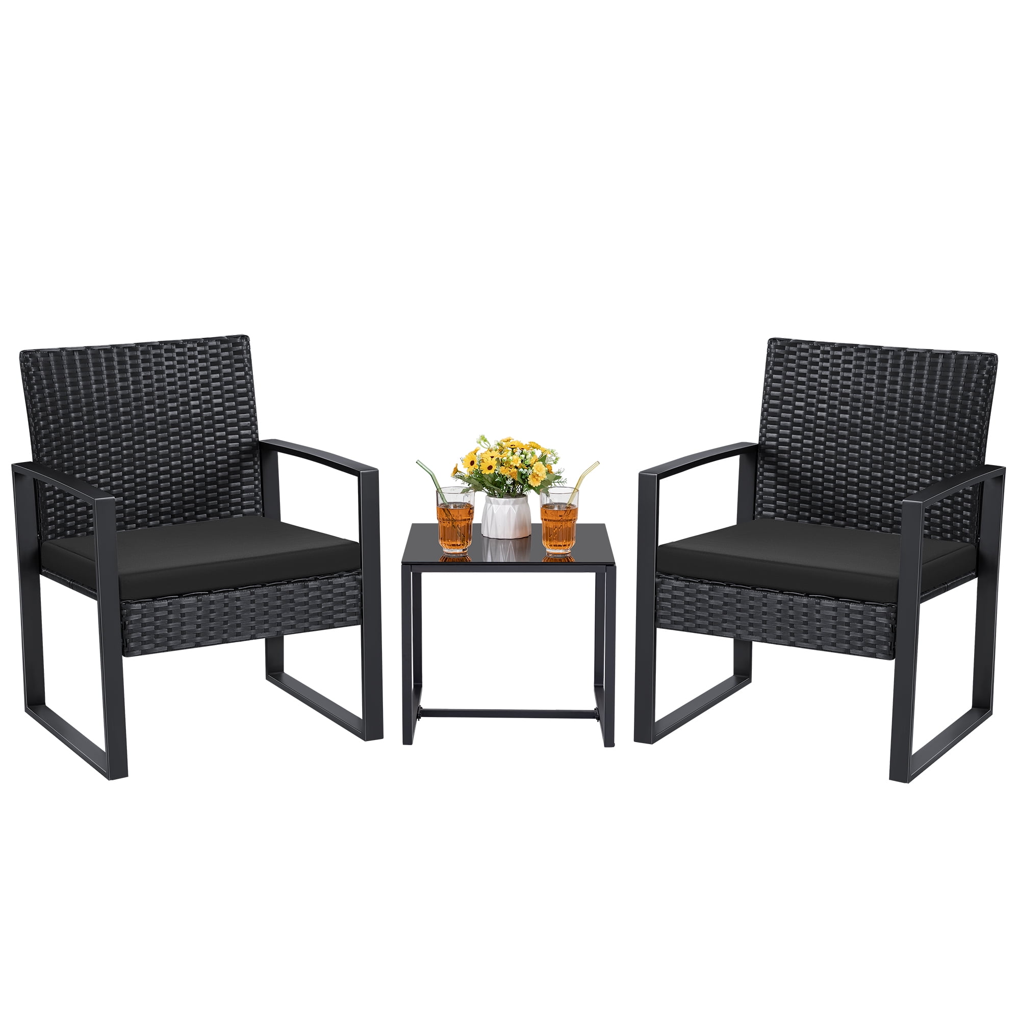 Lacoo 3 Pieces Outdoor Bistro Chair Set PE Rattan Patio Conversation Set of 2 with Cushion and Coffee Table, Black