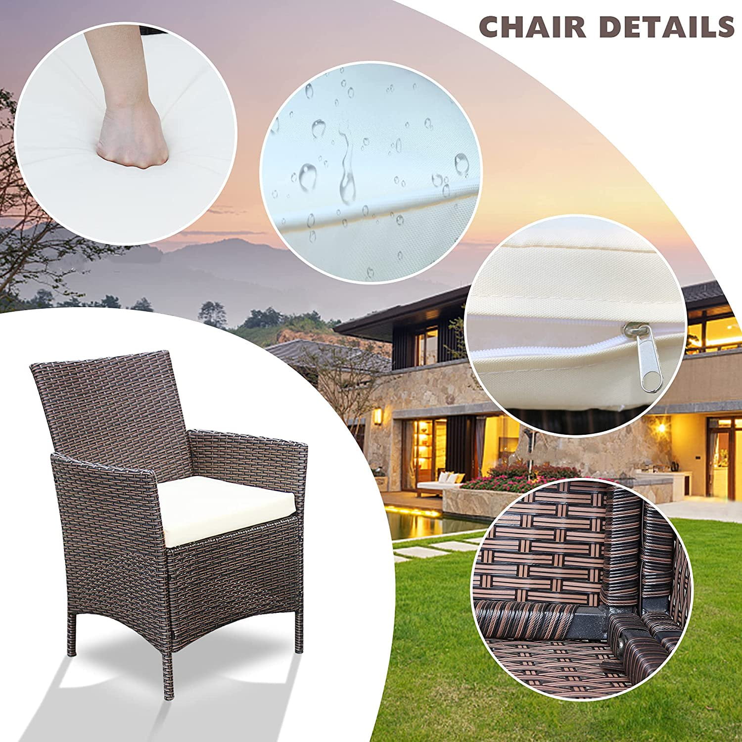 Rattan Material: PE Rattan Color: Brown Frame: Steel Cushion: Beige polyester fabric and sponge padded Weight capacity: 250 pounds Easy assembly: yes Package Dimensions: 30.7 x 15.7 x 21.1 Armchair: 18.1 inch (W) x 34.1 inch (H) Table: 15.7 inch (W) x 15.7 inch (D) X 17.7 inch (H) Tempered glass top: 15.7 inches (W) x 15.7 inches (L) Cushion for armchair: 18.1 inch (W) x 18.1 inch (L) The item will be delivered in one cartons which may arrive at different days. Please wait for 3-7 days. Thank you for your comprehension. The cushions are not water proof enough to withstand the rainy or snowy days, please cover it with a cover to prolong the lifespan when leave them outside. In order to extend the service life, please do not use the washing machine to wash the cushion cover. For customer support, questions and concerns, please contact Customer Service below: Email [email protected]
