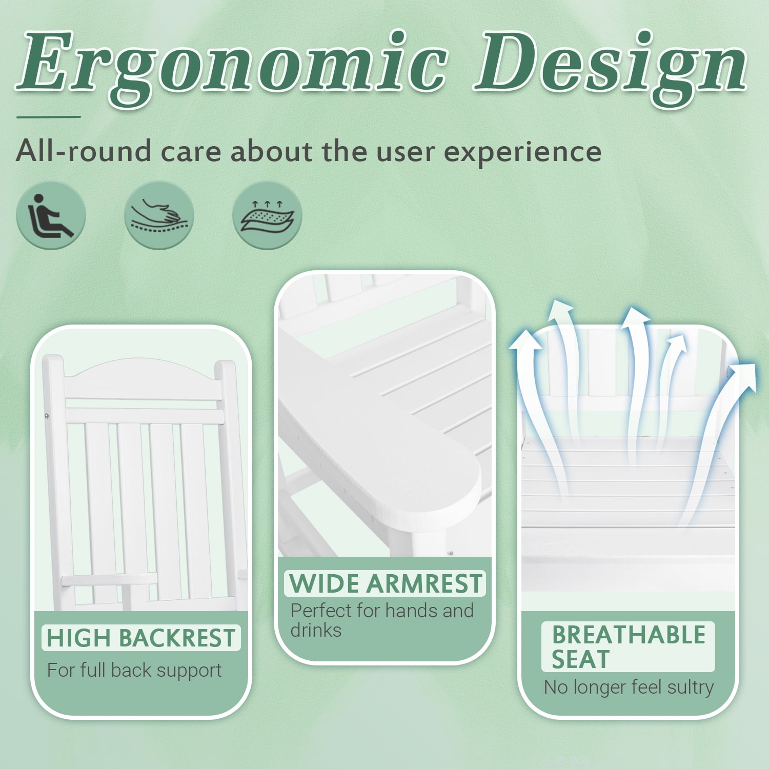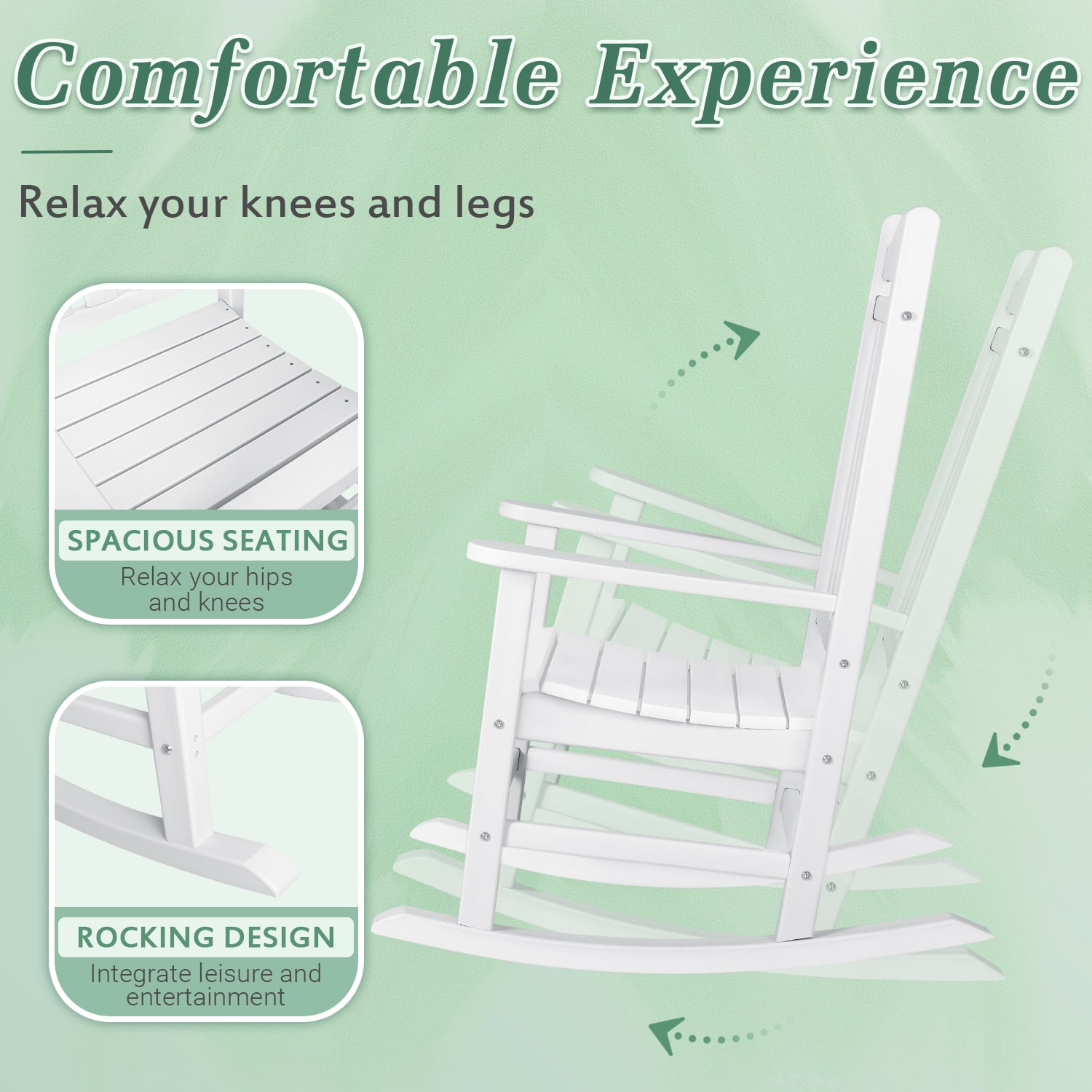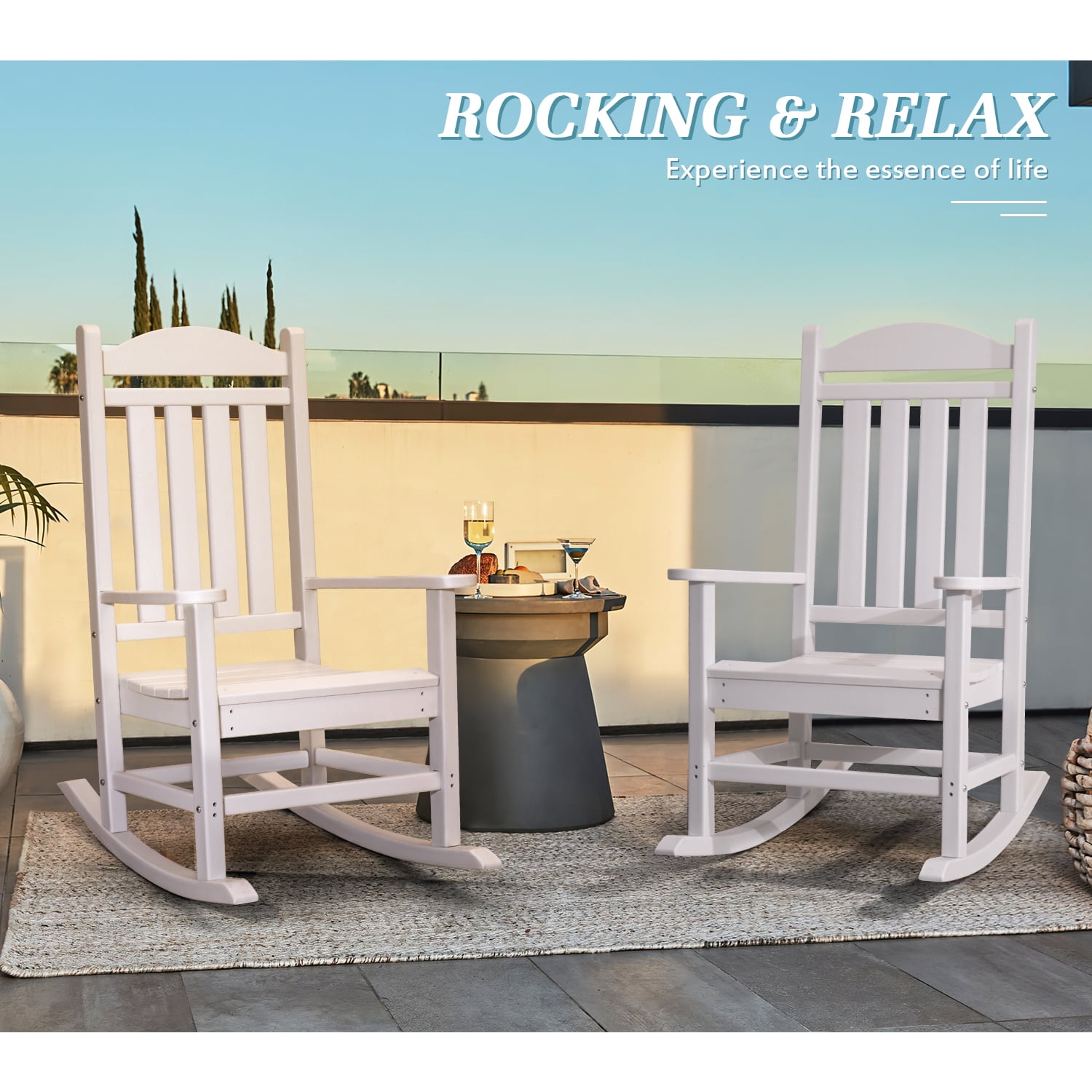 Are you still looking for a comfortable outdoor chair, then lacoo’s classic outdoor rocking chair definitely meets your requirements. The HDPE board makes him more durable, waterproof and UV resistant, the weight of the chair itself is enough to keep him from being blown away by strong winds and can withstand all kinds of weather outdoors. The slatted design allows for ventilation, the rocking structure at the bottom and the high back allow you to completely relax and immerse yourself in the chair for a holiday. The imitation wood grain design makes it easy to integrate into various scenes, and the classic black and white makes it very suitable for swimming pools, balconies, gardens, and porches. It is also suitable for indoor use. You can place it in the living room or bedroom, and swing slowly while reading and reading newspapers to relax your body and mind.