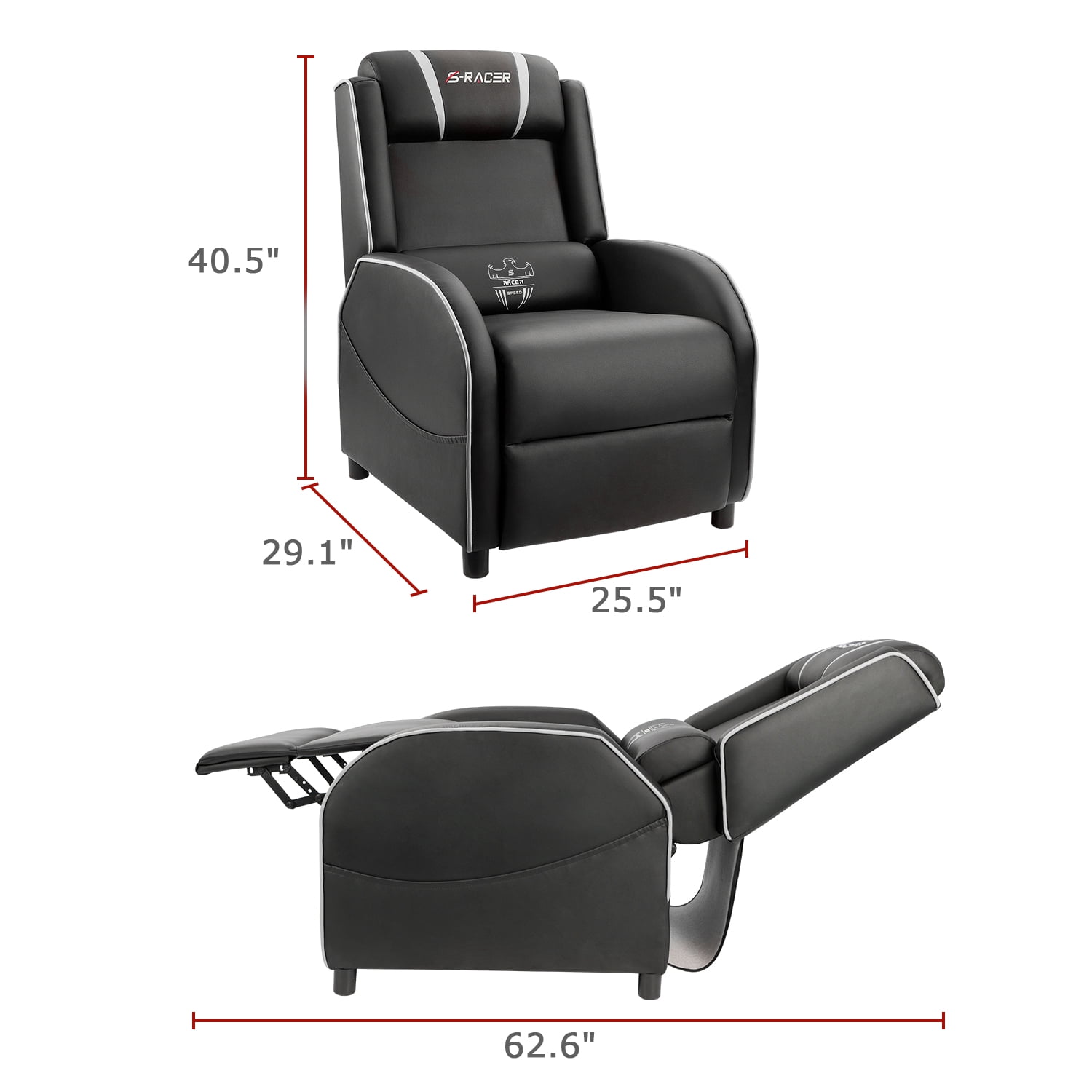 Lacoo Gaming Massage Recliner Chair with PU Leather Designed by a professional design team Latest recliner designed for gaming Modern headrest and lumbar support More suitable for long time gaming Adjustable footrest and back Extra side bag Available in multiple colors: Black/Blue, Black/Purple, Black/Red, Black/Gray and Black/White Minimal assembly required 1-Year limited warranty Seat height: 17.7″ Assembled product dimensions:34″W x 25.1″D x 41.5″H Assembled product weight: 63 LBS Arrives in one box Note: For customer support, questions and concerns, please contact Customer Service Email: [email protected]