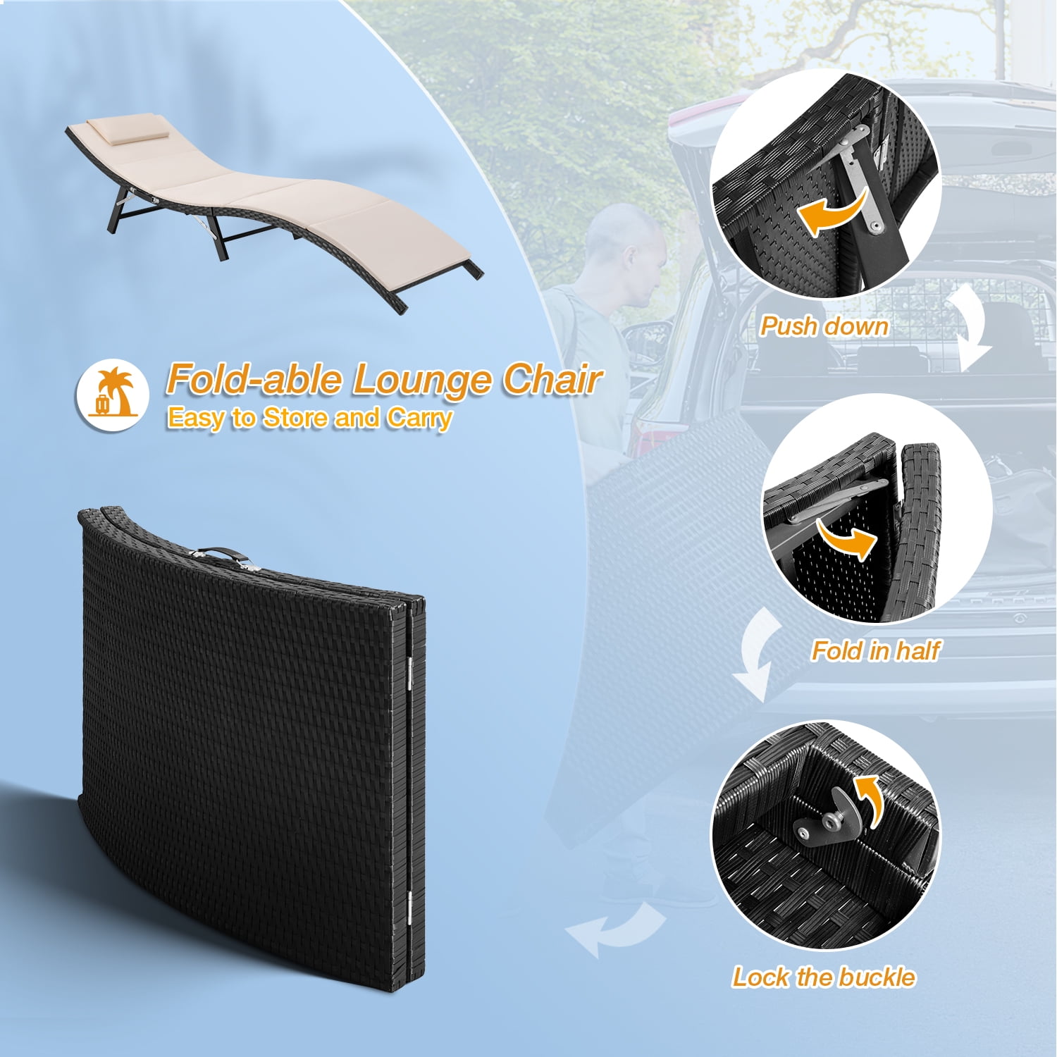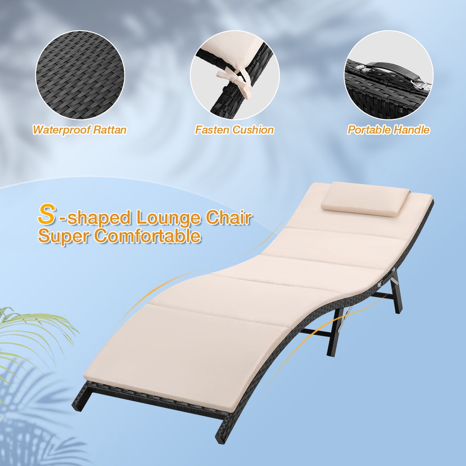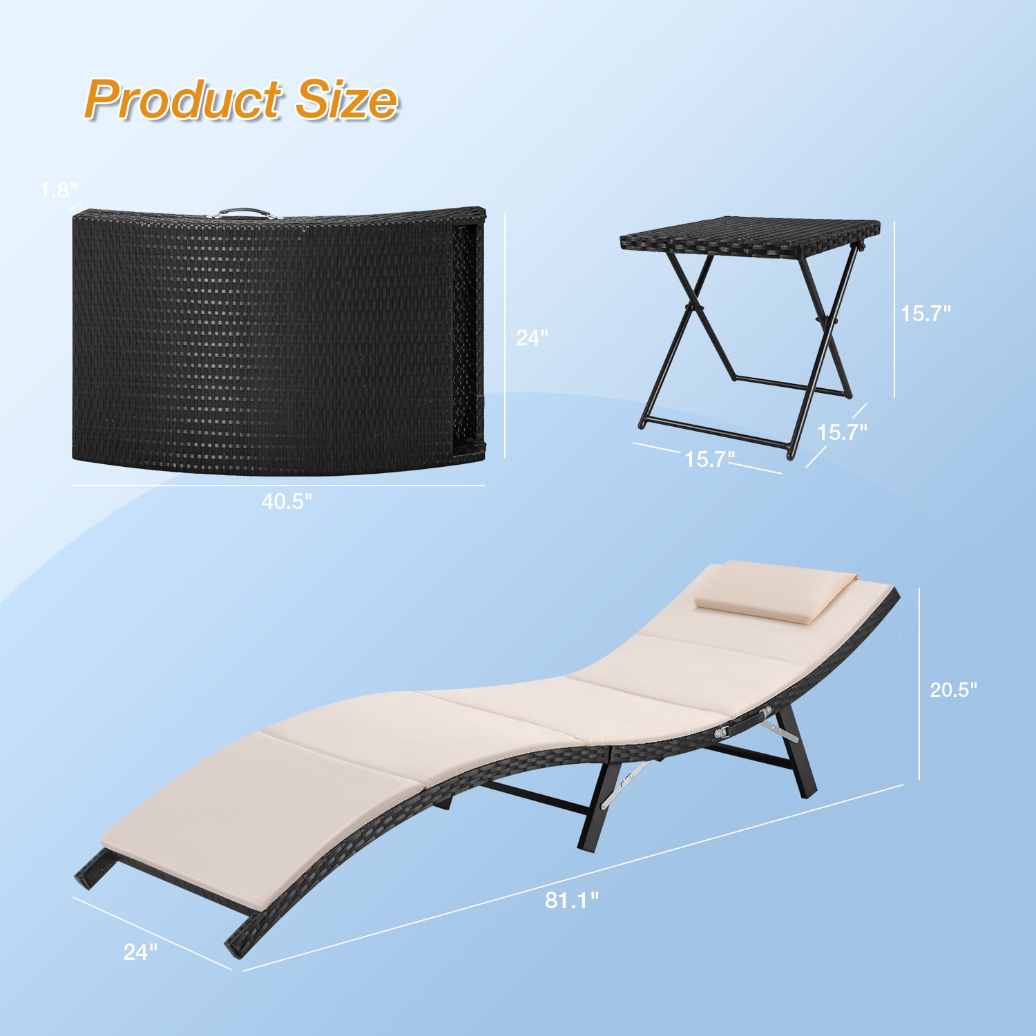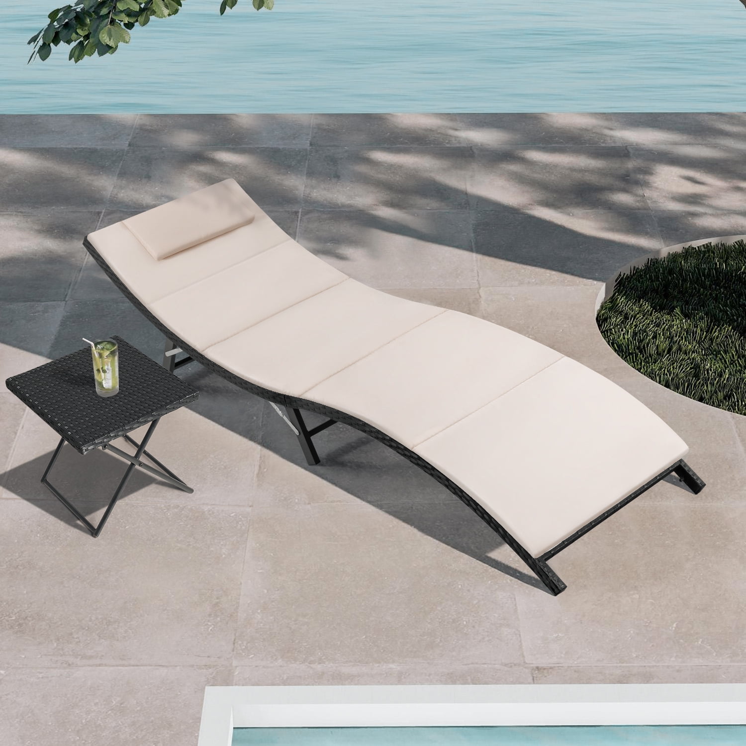 Features: All-weather Resistant: This patio lounge chair is durable enough to withstand rain wind and exposure to the sun for year-round use. Made of all-weather resistant PE Rattan and rust-resistant steel frame, featuring sturdy construction and durable use. Folding Design: You can put this pool lounge chair in a corner with a folding form or take it out for rest after swimming or traveling. The outdoor chair is easy to store or carry with its folding form. Very convenient to enjoy warm sunshine at the pool or beach. High-Quality Material: Full padded and cushion offer you a comfortable experience. The breathable fabric brings you a cool feeling. You can remove the cushion from the lounge chaise on hot summer days or add the cushion to this pool furniture for winter use. Multi-functional Use: With a side table, you can have a drink or just read a best seller in your yard. Perfect for pool, balcony, garden, sandy beach, outdoor recreation place, and other suitable places. Give people a good sense of visual design. Specifications: Wicker Material: PE Rattan Rattan Color: Black Cushion: Beige polyester fabric and sponge padded Spreading chaise lounge: 81.1″ L x 24″ W x 20.5″ H Folding chaise lounge: 40.5″ L x 1.8″ W x 24″ H Table: 15.7″ L x 15.7″ W x 15.7″ H Chair weight capacity: 350 LB No assembly required Arrives in one box Package dimension: 40″ L x 12″ W x 24″ H; Weight:49 lbs