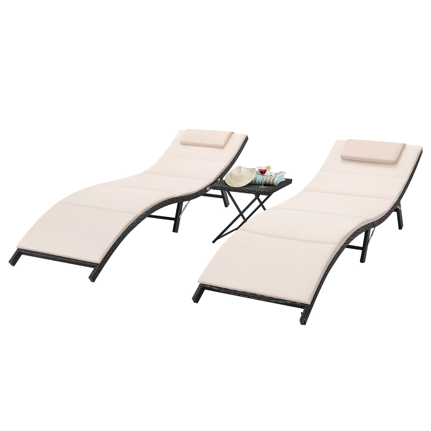 Lacoo 3Pieces Outdoor Chaise Lounge Chair Sets, Multicolor, pool lounge chairs Rattan chair set includes two lounge chairs and a matching table, and cushions are also included. The outdoor chaise lounges are made of PE rattan and solid steel frame, which is suitable for all-weather and it is easy to clean. The cushions are made of a high-density sponge and it will not sink easily. In addition, the outdoor chair is easy to store or carry with its folding form, which can facilitate you to adjust to a position you like. So it is very convenient for you to enjoy warm sunshine at the pool or beach.