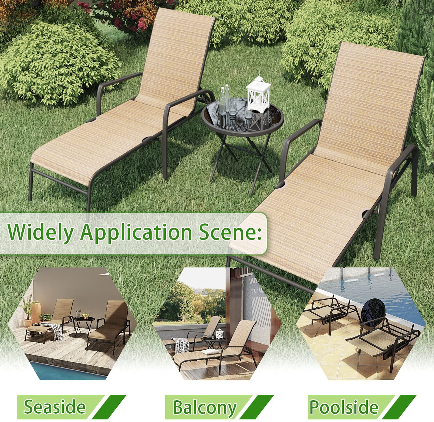 Lacoo Patio Lounge Chaise Chair Set of 3 Recline Adjustable Backrest Textlene Outdoor Furniture Bistro Set with Table, Beige