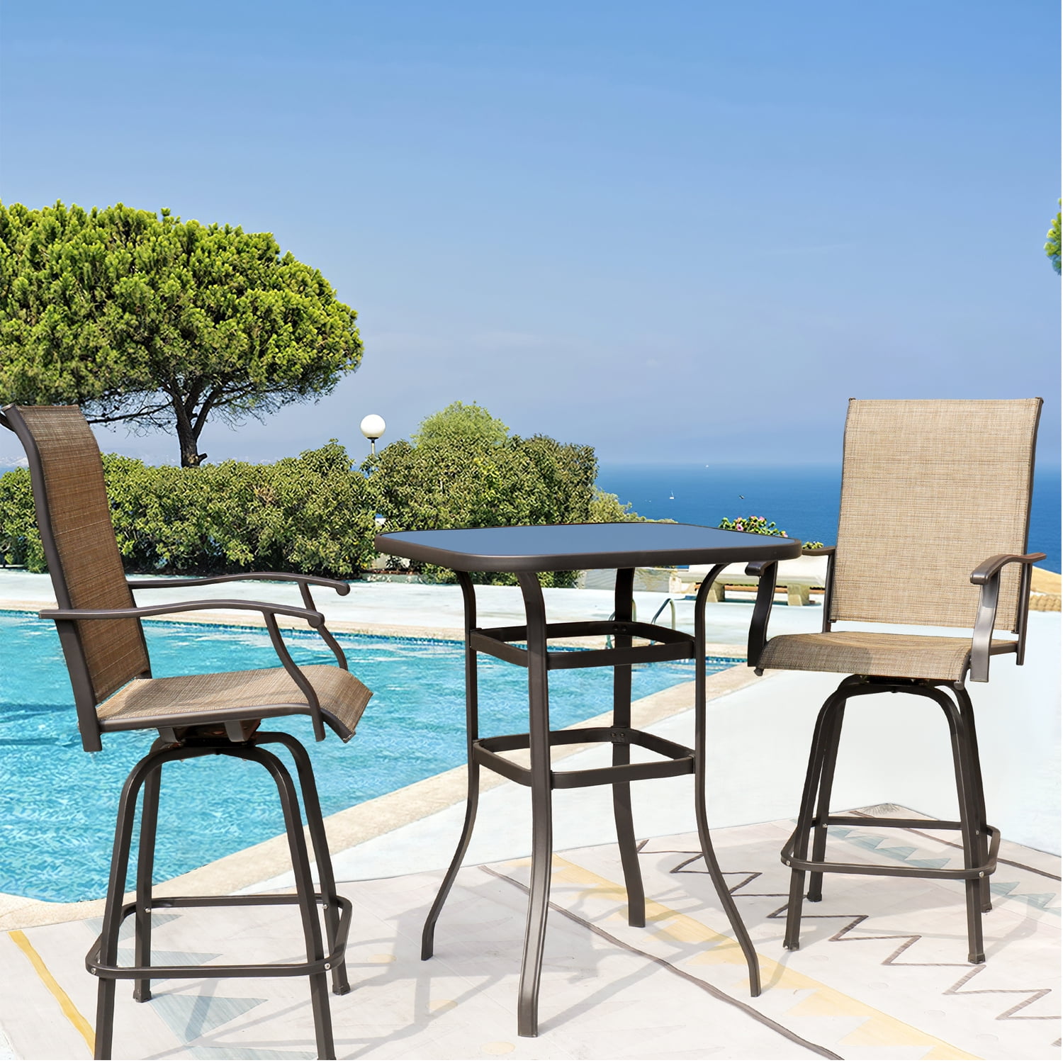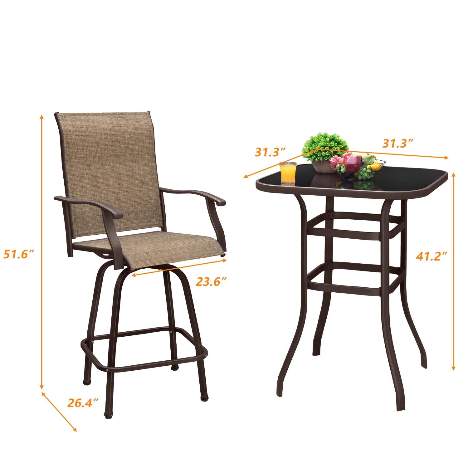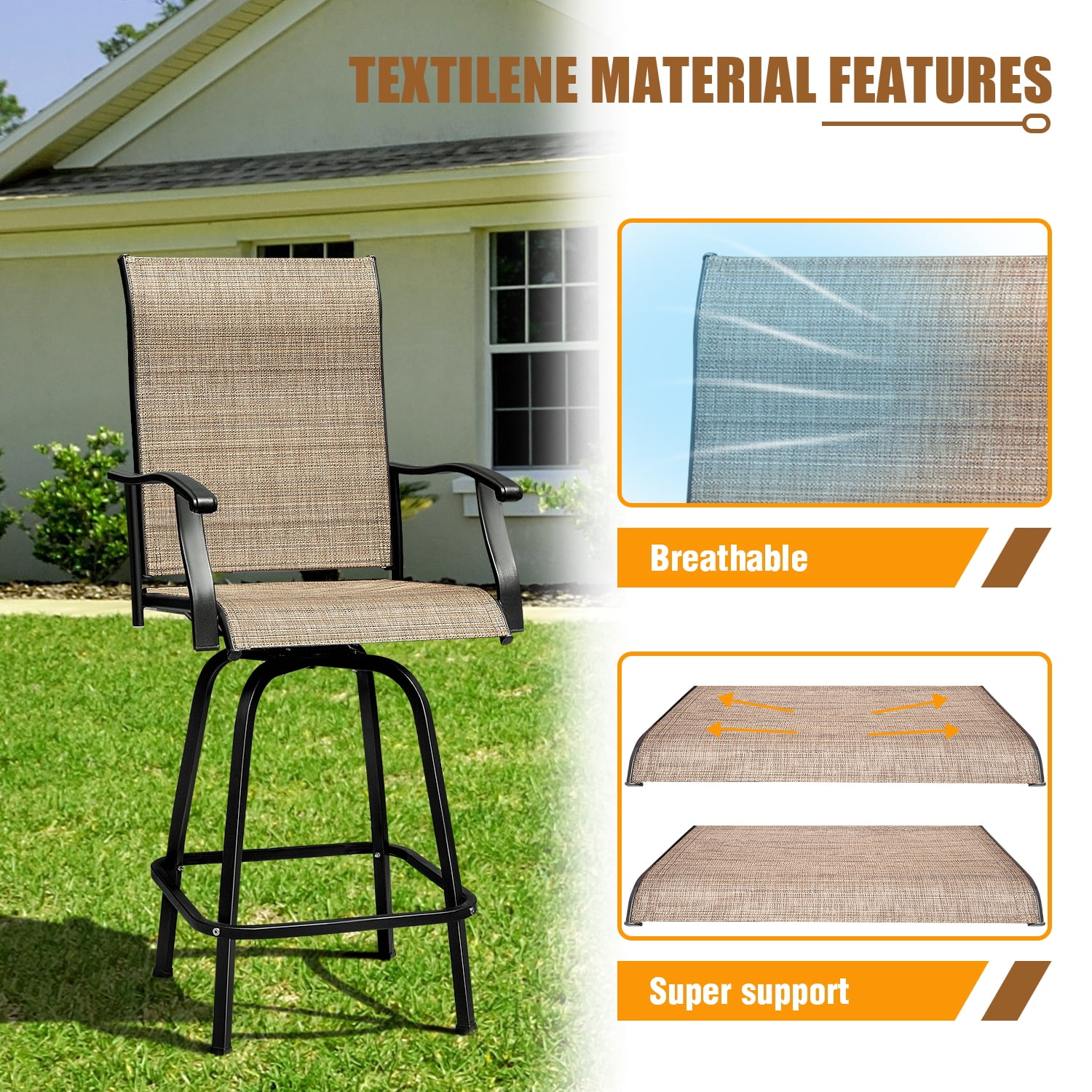Key Feature: Ergonomic design: The curved armrest and ergonomic backrest help you relax your body. You can suspend your feet or rest them on a metal bar as needed. Ventilation design: The backrest and seat are made of textile mesh. With good air permeability and easy cleaning, so that you will not feel hot in summer. Durable material: With a metal frame and breathable fabric, Each chair can hold 300 pounds.The table can bear a weight of 130-200 pounds. Applicable to many places: This product is suitable for many places, you can enjoy it at your garden, backyard, patio and so on. 360-degree swivel design: The chair have 360-degree swivel function which is convenient for you to rotate to any direction without movement. Specifics: About chair: Package Dimensions: 26″ x 15″ x 26″(L x W x H) Inches Product Dimensions: 23.6″ x 26.4″ x 51.6″(L x W x H) Inches Maximum Weight Capacity: 300 LBS Carton Weight: 49.36 LBS 1 year limited warranty Color: Tan About tea table: Package Dimensions: 36″ x 33″ x 4″(L x W x H) Inches Product Dimensions: 31.3″ x 31.3″ x 41.2″(L x W x H) Inches Weight Capacity: 130-200 LBS Carton Weight: 37.68 LBS 1 year limited warranty Color: Tan Carton include: 2 X A brand new chairs 1 X A brand new tea table 1 X A clear installation instruction 2 X A complete installation tool package Note This item will be delivered in two cartons, including two chairs and a tea table. It may arrive at different days. Please wait for 3-7 days. Thanks for your comprehension. For customer support, questions and concerns, please contact Customer Service below: Email [email protected]