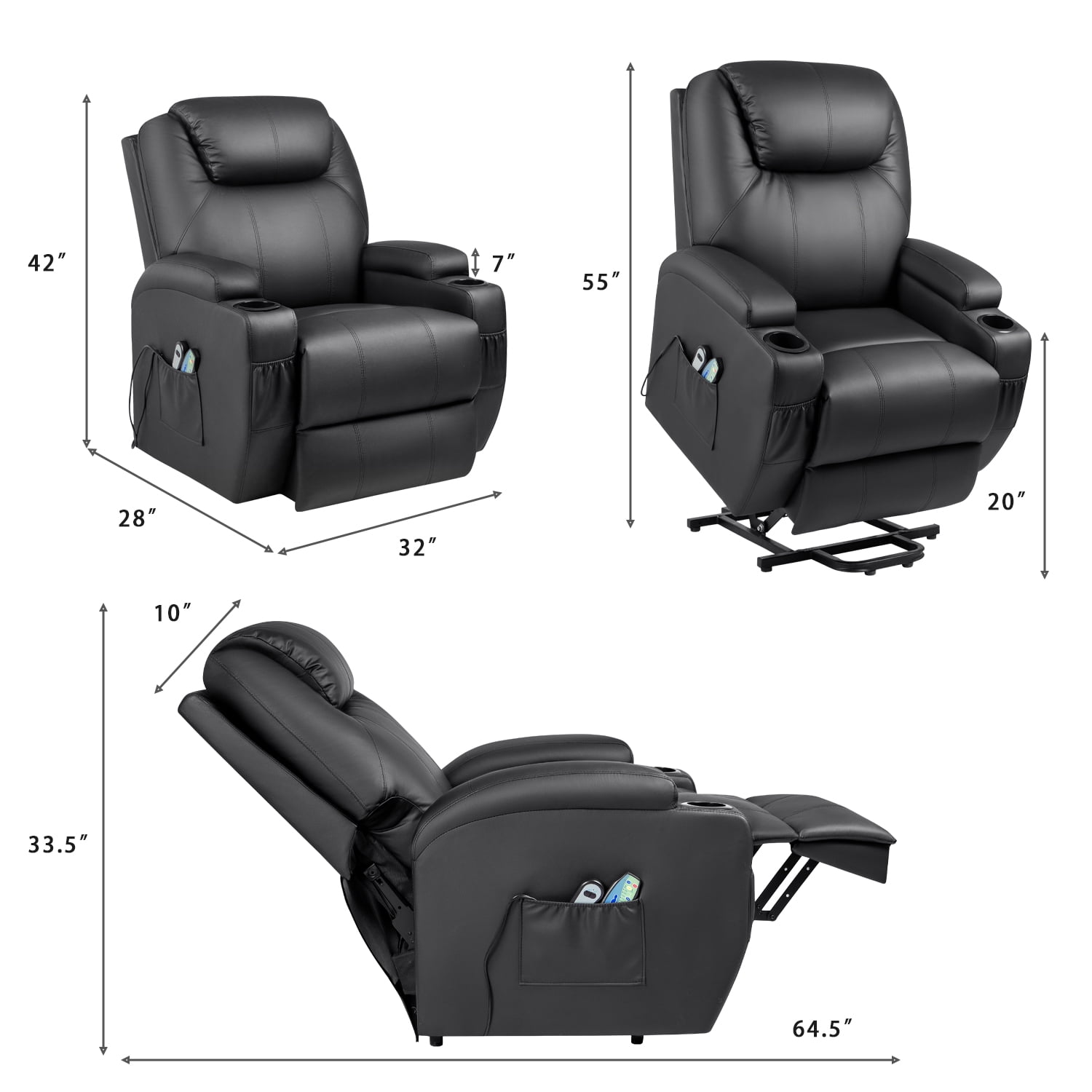 Features: Wired Remote Control: The Lacoo Recliner comes with power supply, controlled by wired remote control for ease of use. Reclining Function & Power Lift: While using reclining model, this sofa can be easily adjusted into several positions to meet different needs. It’s worth mentioning that the recliner is specially designed with power lift function, which aims to assist people like the elderly to easily stand up from the chair. Massage Feature & Heating Mode: The Lacoo Sofa Chair features with special massage function, targeting 4 available stress parts (Backrest, Lumbar, Thigh & Legs) at your choice. There are 5 vibration modes and 2 massage intensities for you to customize the most comfortable sofa. Additional heating mode provides extra warm feeling even in cold winter. Ergonomic Design with Comfort: Distinctive design according to the principle of human body engineering, can perfectly fit your body with full support. Wide backrest & seat cushion with thick foam, padded armrest, plus adjustable thick footrest are all ideal for a zero gravity experience, to bring you ultimate feeling of comfort. High-quality Material for Durability: The Lacoo Lift Sofa is fully upholstered by upgraded PU leather with soft tactile, which is also easy to clean and maintain. Made of solid steel, the base of chair ensures maximum stability, perfect for a long-term use. It can always offer strong support whether you are sitting, relaxing, or lounging. Convenient to Use with Practicality: This chair is equipped with four storage pockets on both two sides and two cup holders on each armrest, which are designed for a convenient daily use and help to keep remotes and other small things close to you. Specifications: Easily assembly required 1-Year limited warranty Seat height: 20. 5″H Seat dimensions: 20″W x 23″D Back dimensions: 29. 6″W x 26. 4″H Maximum capacity: 300 LBS Arrives in one box Package dimensions: 29″L x 27″W x 21″H; Weight: 121 LBS Notes: For customer support, questions and concerns, please contact Customer Service below. Email [email protected] Site to Store Pickup Note: This item is one large box that may not fit in a standard-sized vehicle. Please make sure you have a large car or truck for store pickup.