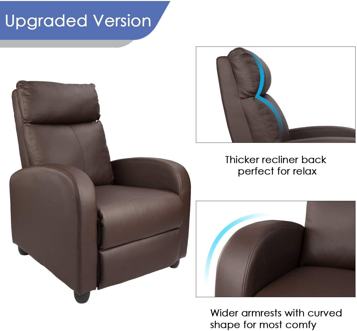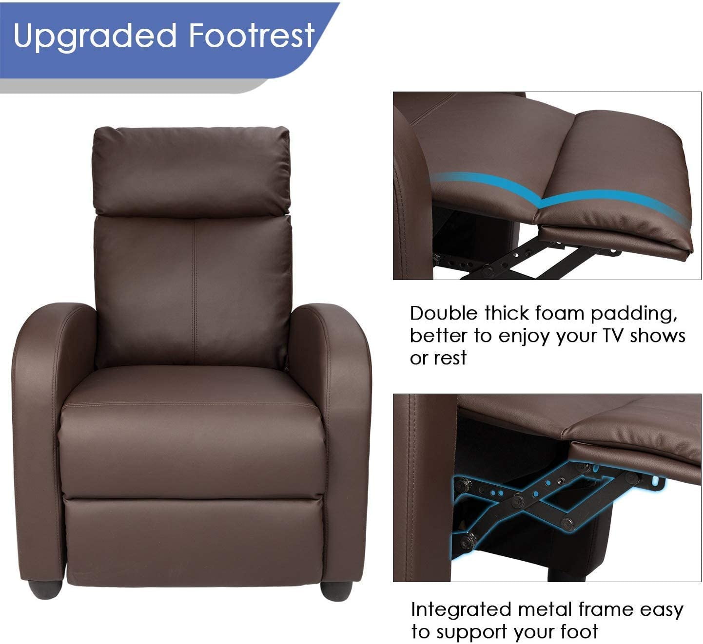 Lacoo PU Leather and HighDensity Foam Single Recliner, Black Premium Comfort: Upgraded materials, including PU leather and highdensity foam, ensure maximum comfort for your leisure time Sleek Modern Design: The pushback recliner features a popup footrest, allowing for easy reclining and relaxation Floor Protection: Equipped with four plastic foot pads that prevent floor scratching, maintaining the integrity of your surfaces Sturdy Support: Designed to support up to 250 lbs, providing a reliable seating option for users Stylish Addition: This modern recliner seamlessly fits into various decor styles, enhancing any living space with its contemporary look