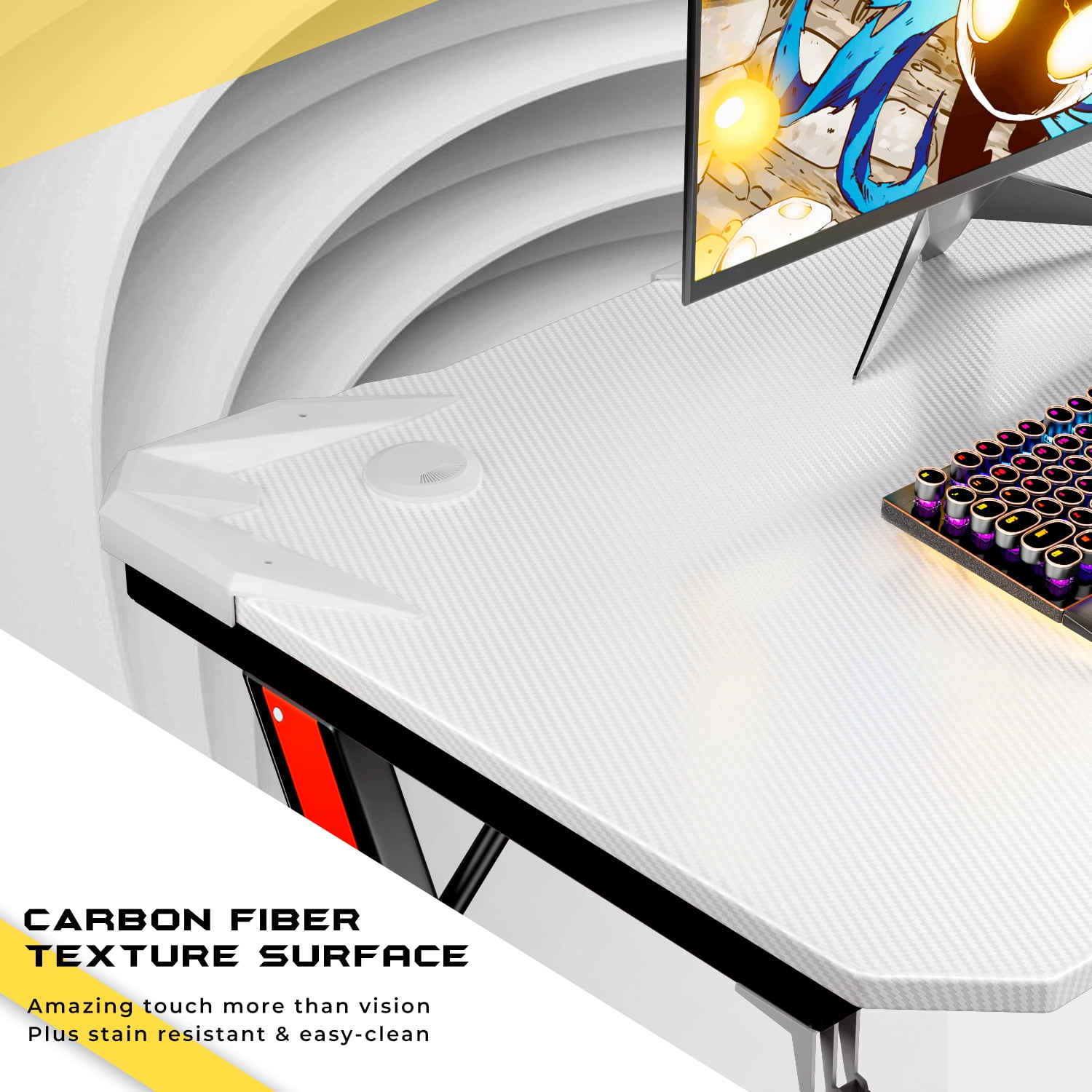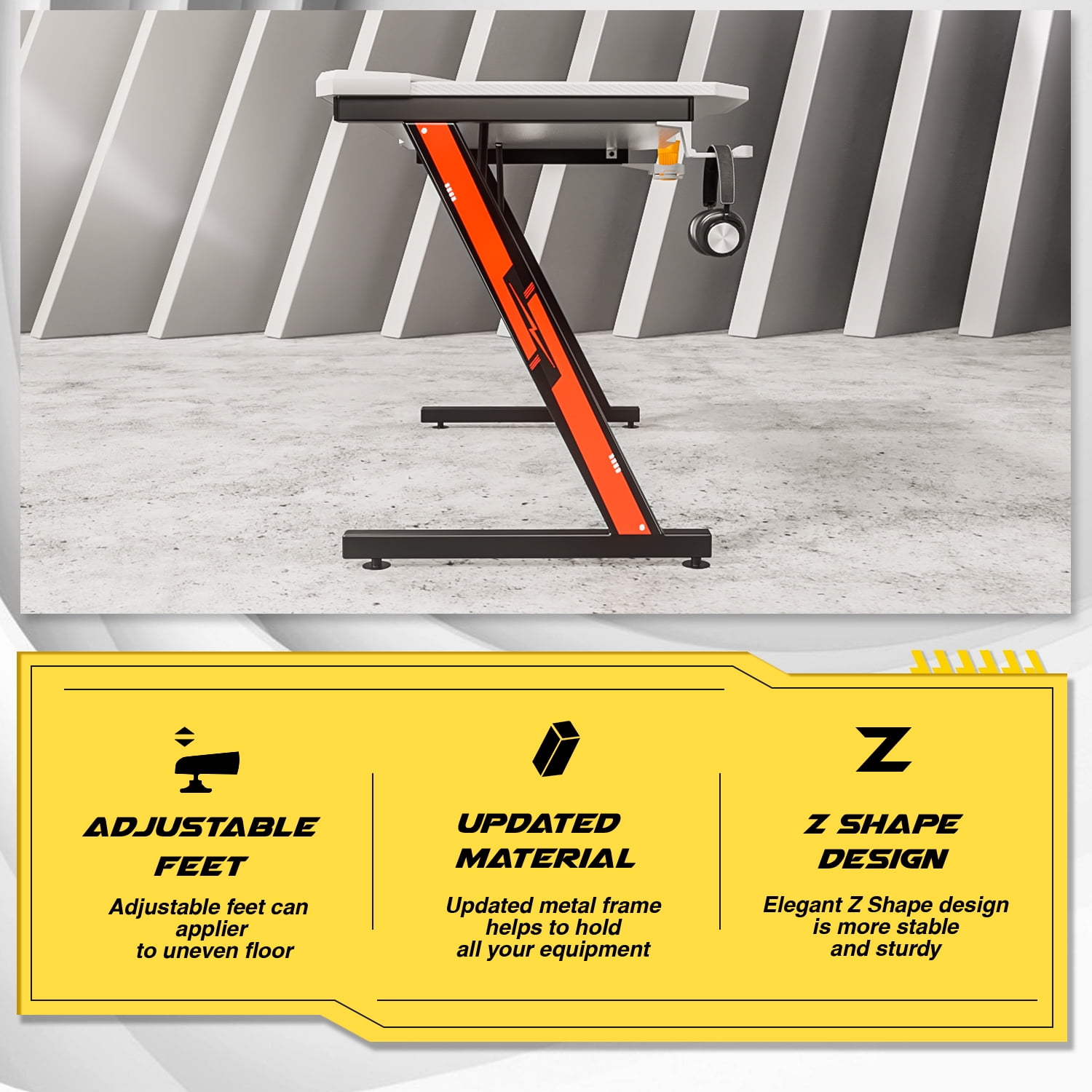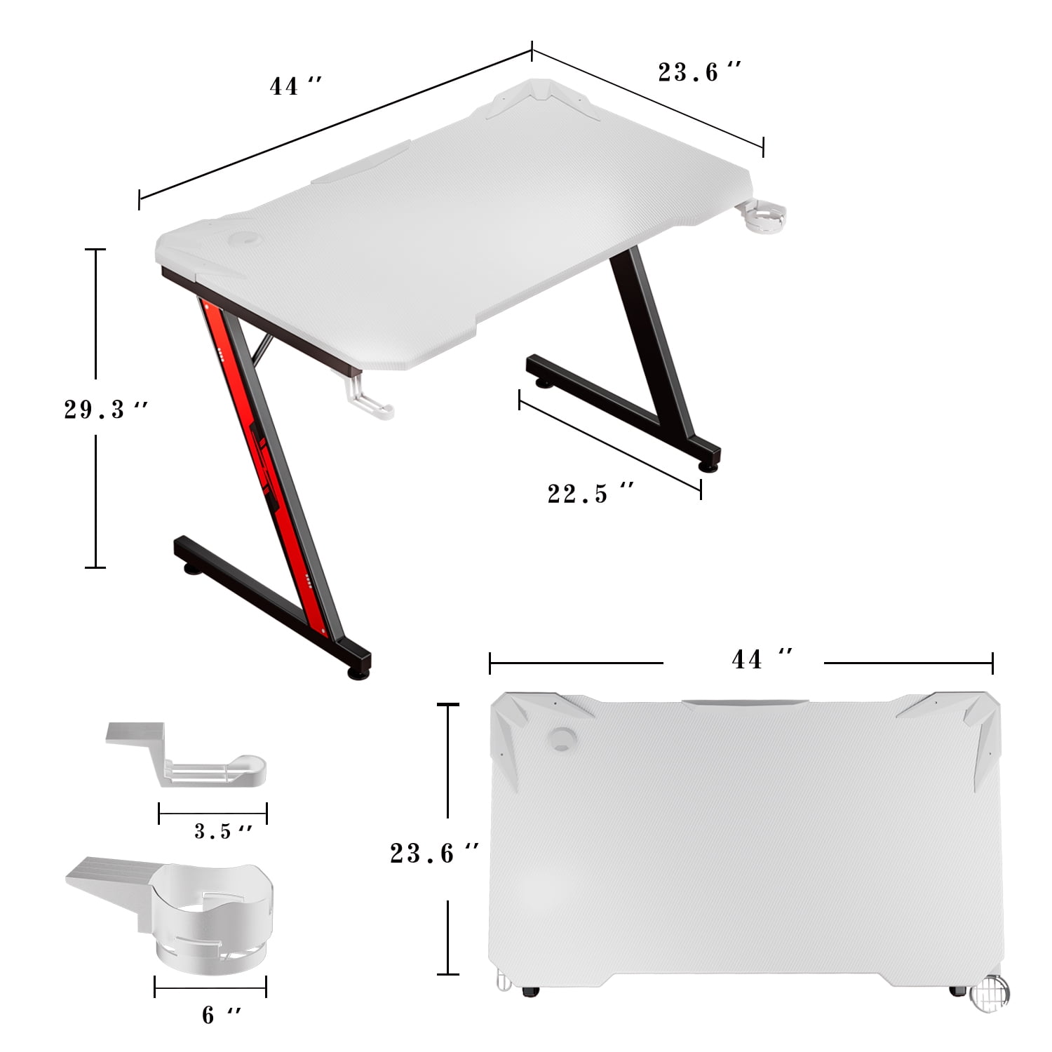 Large Gaming Surface: This gaming computer desk has a generous game surface which is perfect for gamers. The carbon fiber desktop is stain and scratch-resistant, and easy to wipe clean. The contoured desktop allows you to sit close and supports your wrists and forearms. Sturdy Construction: The steel material and Z-Shaped frame ensure durability and stability. Meanwhile, the metal legs can support all your personal gaming objects on the desktop to satisfy all your daily needs. Gaming Style: The unique gaming style desk is designed to create an immersive gaming experience for every game player. It will blend in your game room with its cool appearance and it will keep you feeling comfortable and supported while playing. Gamer-Friendly Design: The desk comes with a cup holder and a headphone hook which provides you a more convenient gaming and working environment. Modern Design: Modern design with Z shape metal frame gaming desk is a beautiful view in your home. Easy to Assemble: It’s easy to put the gaming desk together. Tools and instructions needed are included in the package. You can set it up in 20-30minutes. Measurement: Package Dimension: 46.46′ W x 28.94′ D x 3.94′ H Desktop Dimension: 44′ W x 23.6′ D x 29.3′ H Max Capacity: 220 lbs. Item Weight: 33 lbs. Color: White Item Including: Gaming desk x 1 Headset holder x 1 Water cup tray x 1 Instruction manual x 1 Tool package x 1