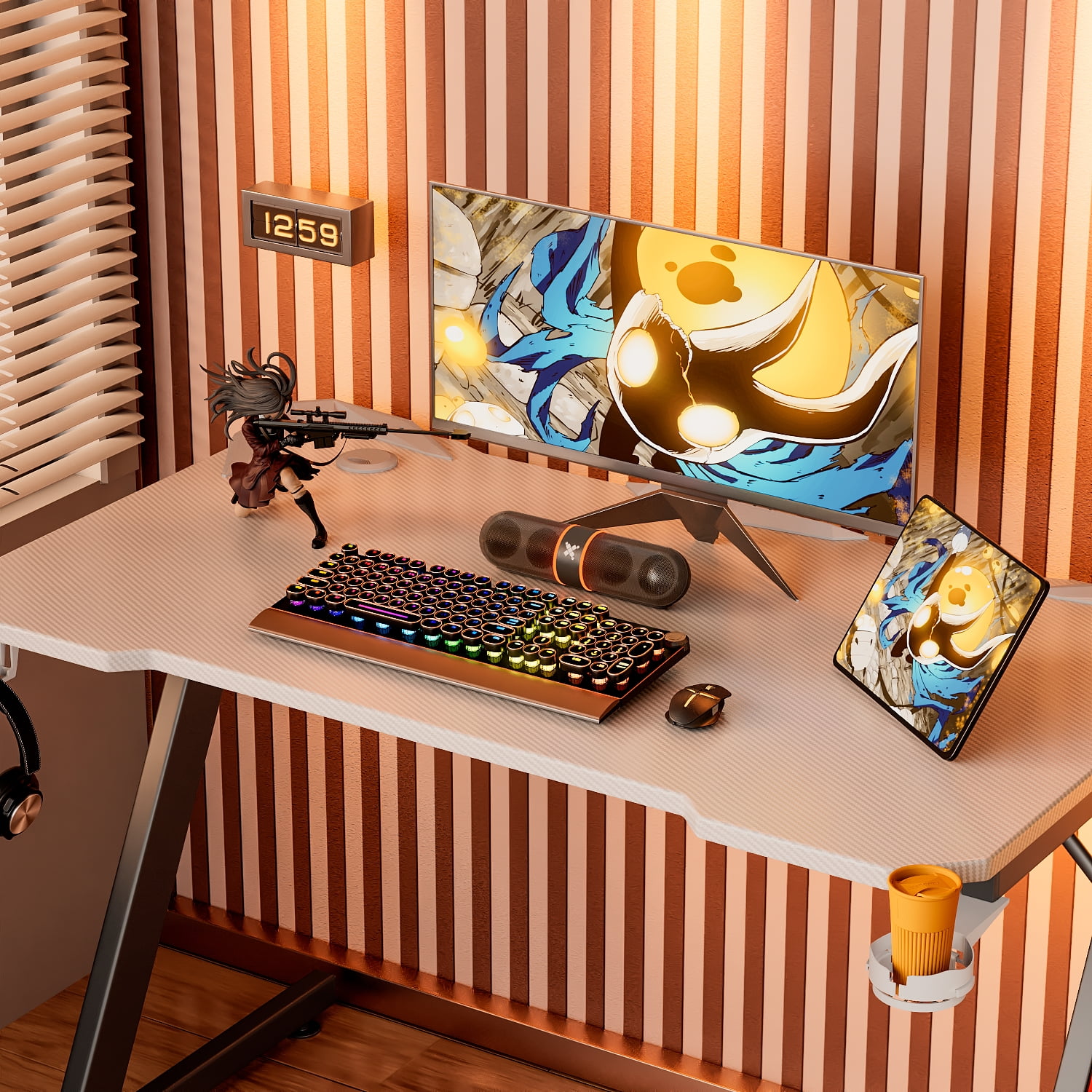 Merry Christmas! Still picking out a gaming desk. This gaming desk is a wonderful gift for you, for your family or your friends. Use it for Christmas to create a excellent mysterious gaming room just for fun. It’s even cooler with the racing chairs in the link below. Carbon fiber surface is comfortable to touch and easy to clean. A durable and stable metal frame will provide super stability. For gamers, the Z-shaped gaming desk can provide you with a more comfortable gaming environment. The desk is also equipped with a headphone holder and a water cup tray, which maximizes space on the table and allows you to navigate the game world. Enjoy your gaming time with this Wal new gaming desk.