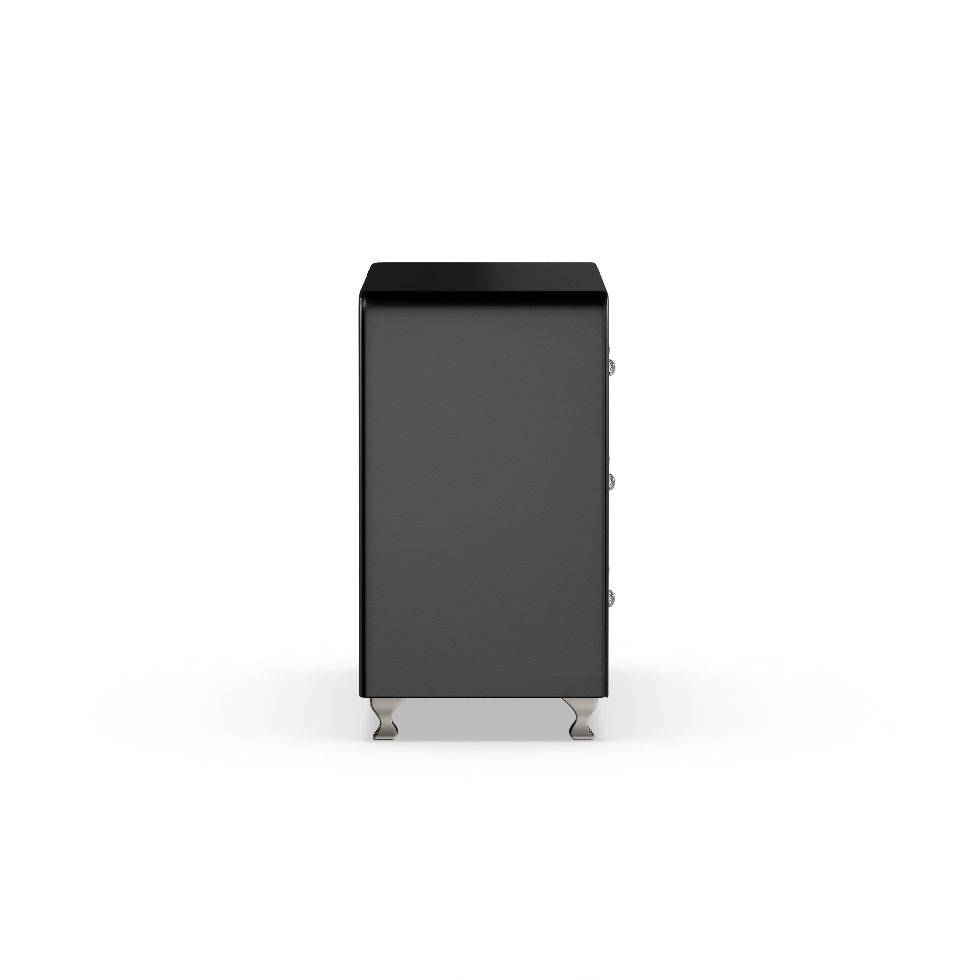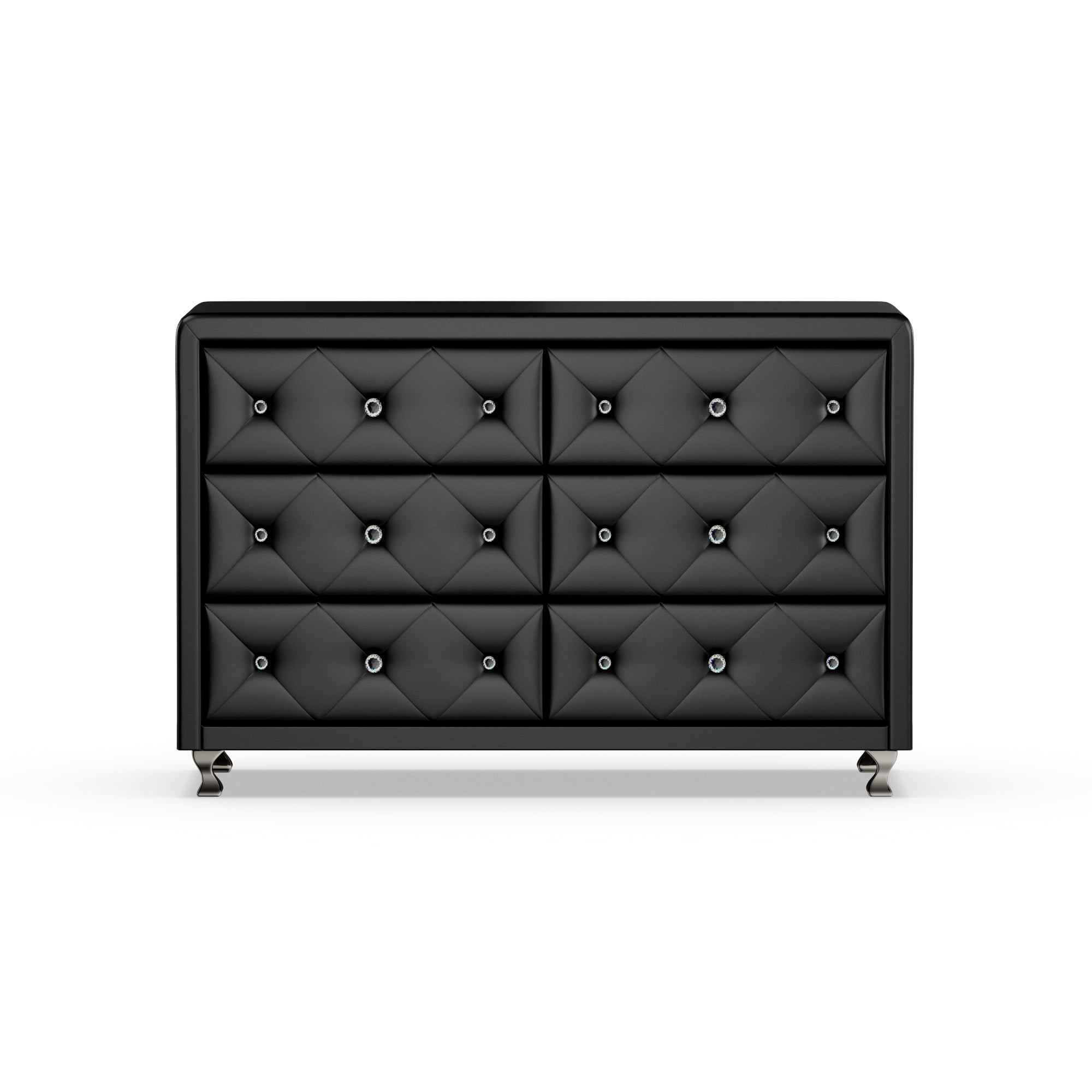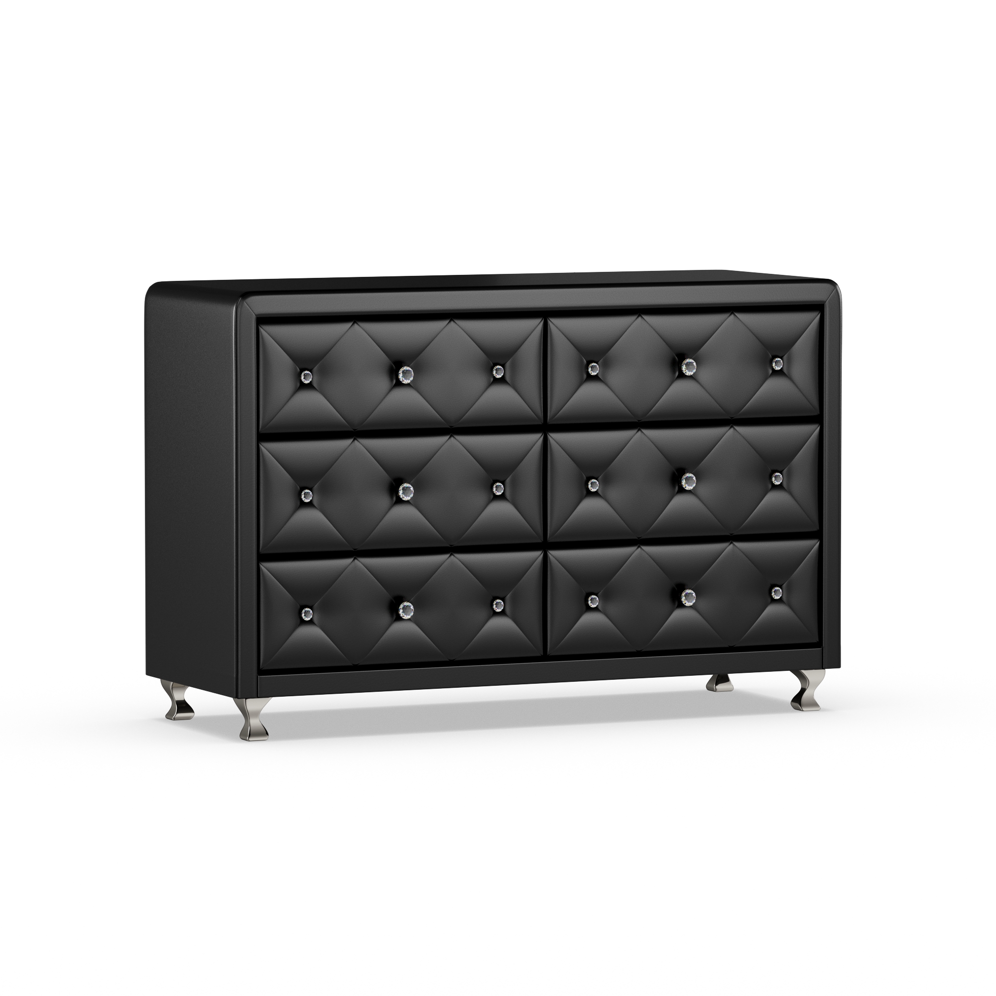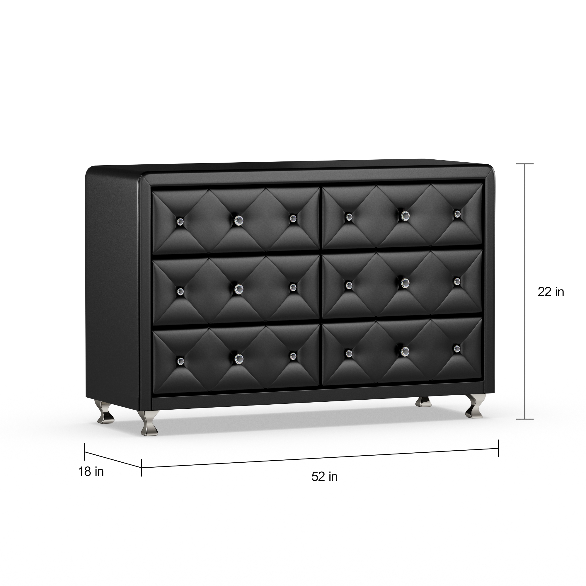 Crystallize your decorating vision with our Luminescence Wood Contemporary Upholstered Dresser. Sporting faux crystal buttons and drawer pulls plus chrome-plated steel legs, this bedroom-furniture piece positively shines. Black faux-leather padded exterior features soft-edged top corners for a contemporary, contoured appearance. Six drawers offer plenty of storage space. Wooden-frame construction provides outstanding durability.