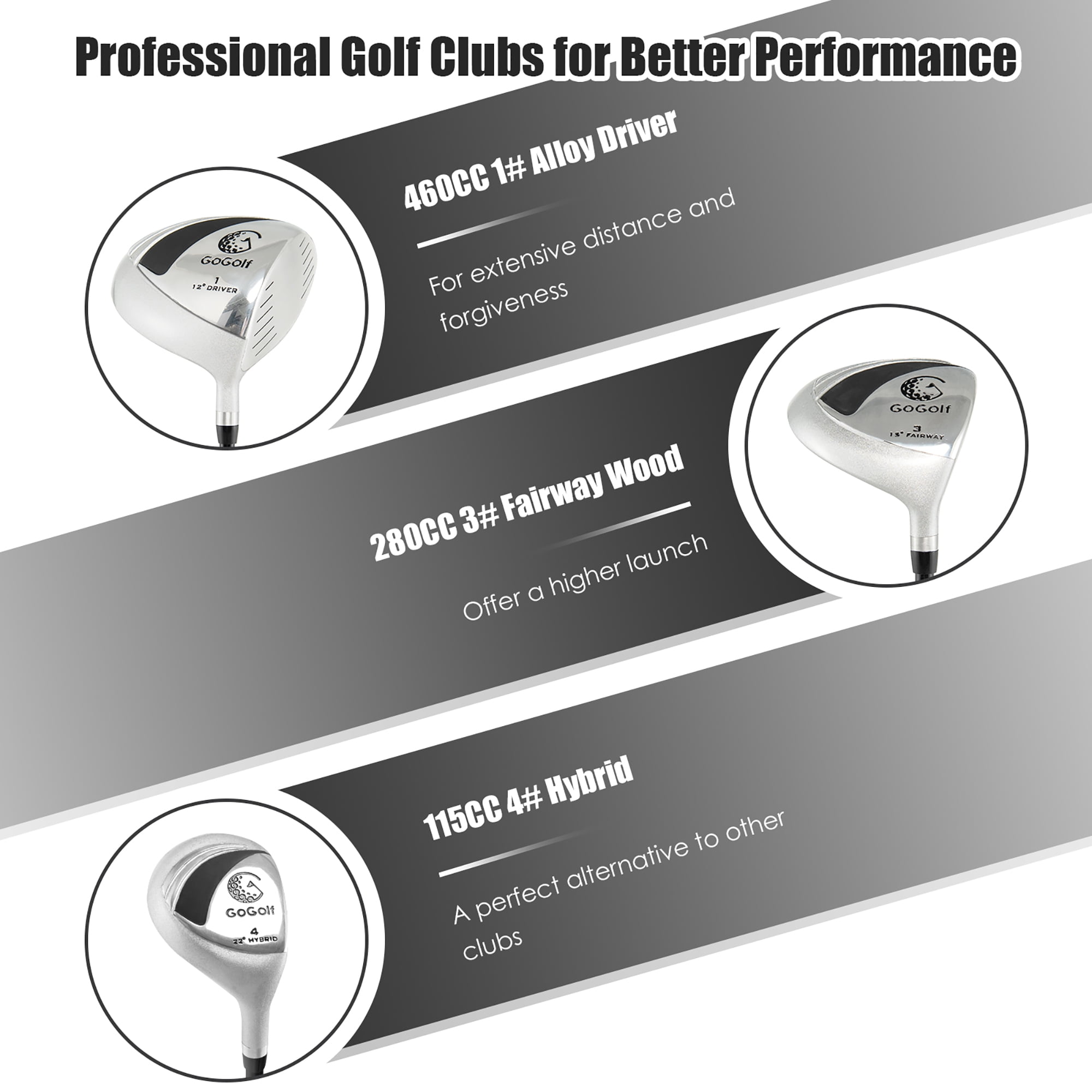 Professional & Complete Golf Set: The completed golf clubs set with premium components and advanced materials perfectly meets all your needs. This set includes aluminium driver, 3# fairway wood, 4# hybrid, 6#-9# irons, pitching wedge, putter and the lightweight stand bag. Besides, three extra covers well protect the driver and fairway woods. Premium 460cc Alloy Driver: 460cc Alloy driver offers you a large sweet spot for more forgiveness of off-center hits. Meanwhile, the driver features a more aerodynamic head shape, which allows for a high launch and longer distance and makes it easy to hit the ball away from the tee. 6#-9# Irons & Pitching Wedge: With the aim of delivering maximum accuracy, additional weight is placed on the head of irons for a better center of gravity. Certainly, it maintains the directionality of the shot, also making the ball close to the target straightly. Meanwhile, with the pitching wedge, you can easily hit the ball over the obstacles and deal with various complex hitting situations. Putter with Excellent Aiming Mechanism: Featuring very low weighting, the putter can be easily controlled for women. Meanwhile, the easy-to-use alignment offers a smooth stroke, and also keeps the putt on line and straight. Surely, the advanced toe and heel weighted design provides you with more accuracy. Ultra Lightweight Design for Women: Ultra light golf clubs set is perfect for women. The whole golf club set only weighs 12lbs, convenient and handy to carry for outdoor use. Additionally, the stand bag is equipped with straps so you can easily carry it like a backpack. When you’re playing golf, it can be stably placed on the ground for non-slipping feet.