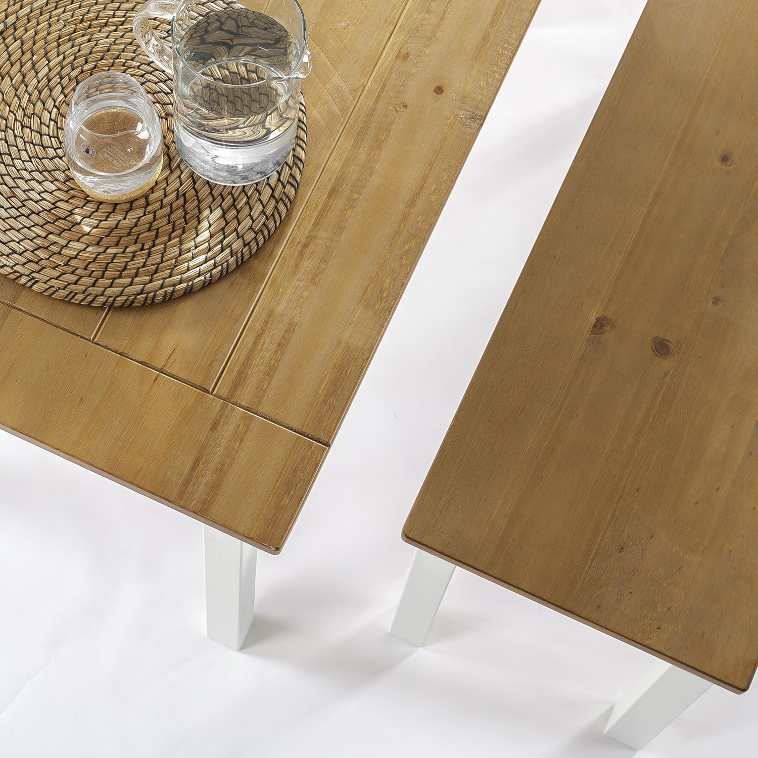 Lagom Becky 45” Wood Dining Table with two Benches, 3 Piece Dining Set FARMHOUSE CHARM FOR SMALL SPACES – Built with a timeless framework and two-tone finish, the Becky table and benches add a dose of rustic warmth to your small dining area or kitchen COZY SEATING FOR YOUR HOUSEHOLD – 45 inch table and 36 inch benches can seat 2 – 4 people comfortably BUILT STURDY – Solid wood table is engineered to support up to 100 lbs of evenly distributed weight EASY ASSEMBLY – All parts, tools and instructions are packed into one convenient box for setup that takes less than 30 minutes Durable solid wood Worry-free 1-year warranty; one piece table and two benches, come as 3 piece set