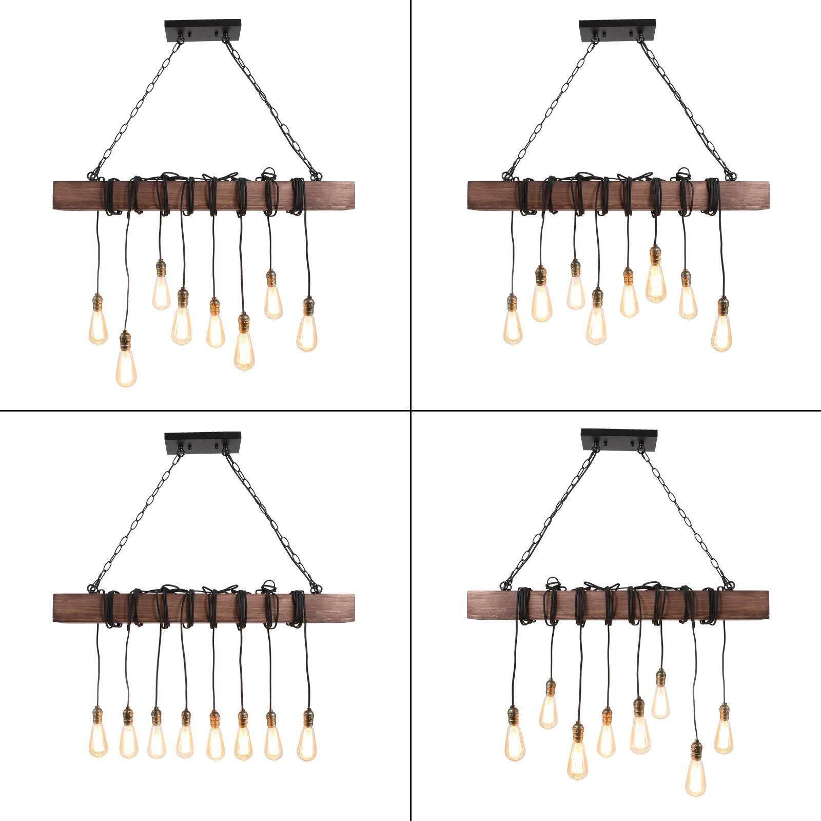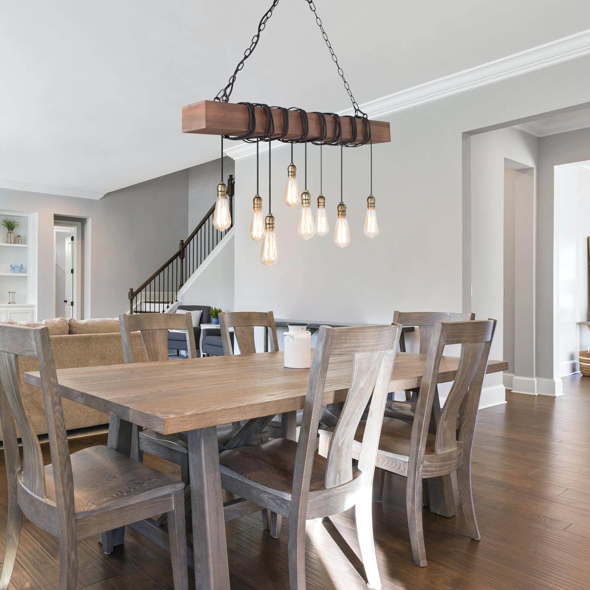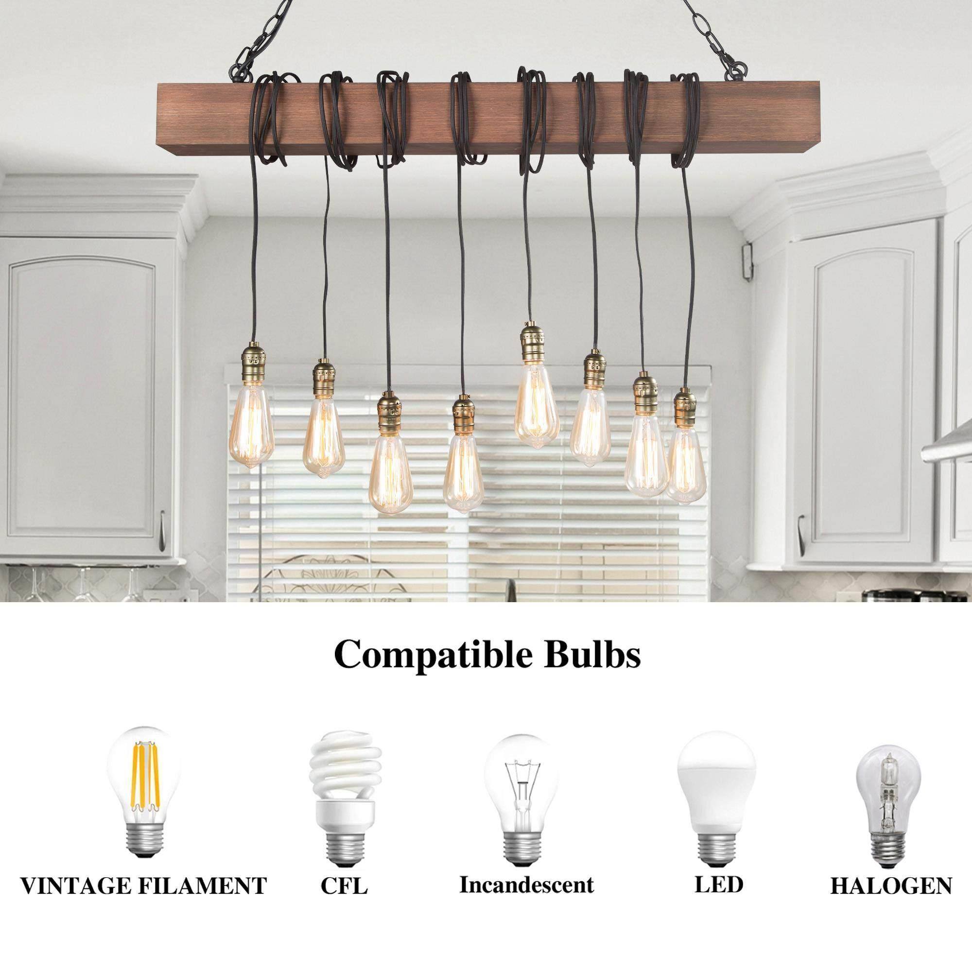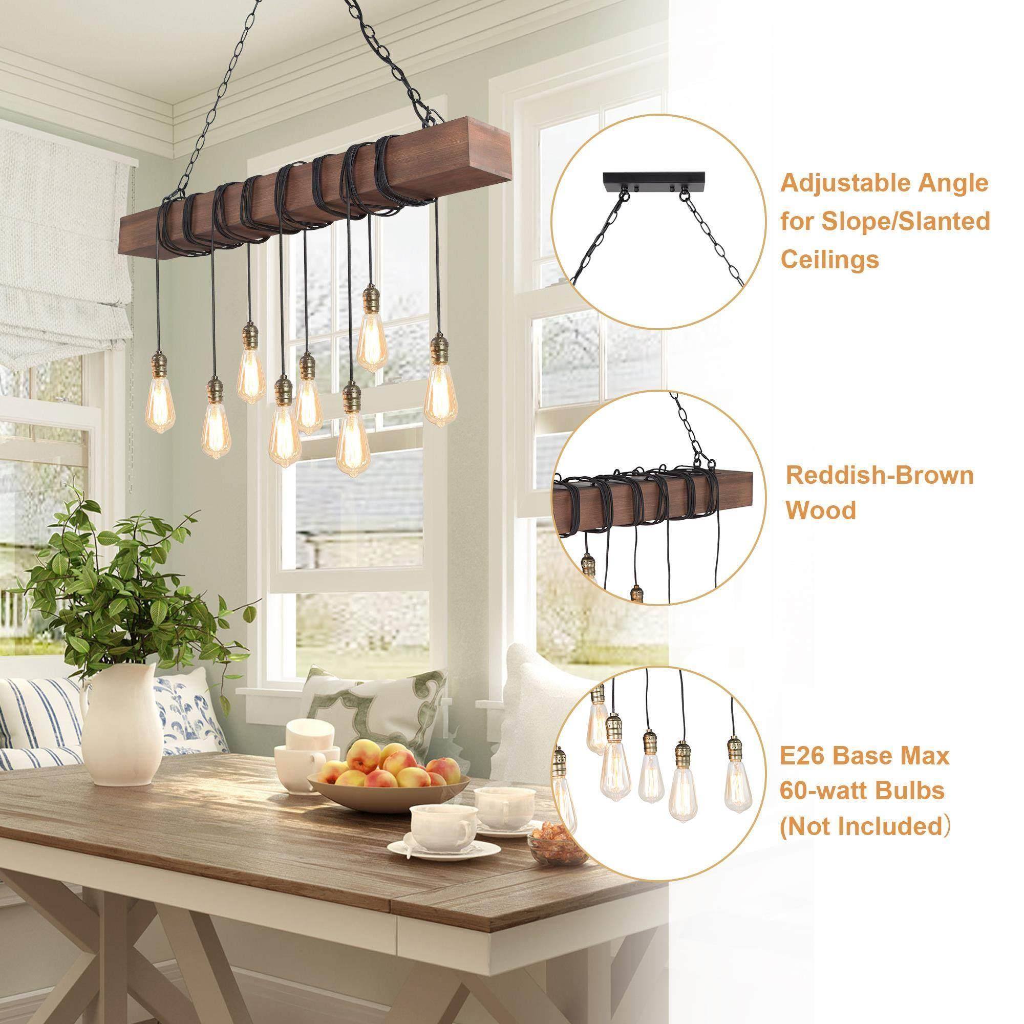 To let your room look lived-in: This 8-light natural brown wood modern farmhouse linear kitchen island chandelier is adorable. A single solid wooden beam has been transformed with expertly placed eight black twisted cord pendants to create your ideal lighting fixture. Inspired by the marriage of rustic farmhouse decoration with industrial aesthetics, this striking juxtaposition of materials resulted in the development of this classical rustic fixture. Wires of different lengths and bulbs of different shapes to shape this chandelier into a unique artwork. You can completely enjoy your DIY time. The classic color and modern design are suitable for any style of the room, whether it is modern farmhouse, rustic, vintage, transitional, traditional, or coastal, this wooden chandelier lighting fixture will be a perfect choice.