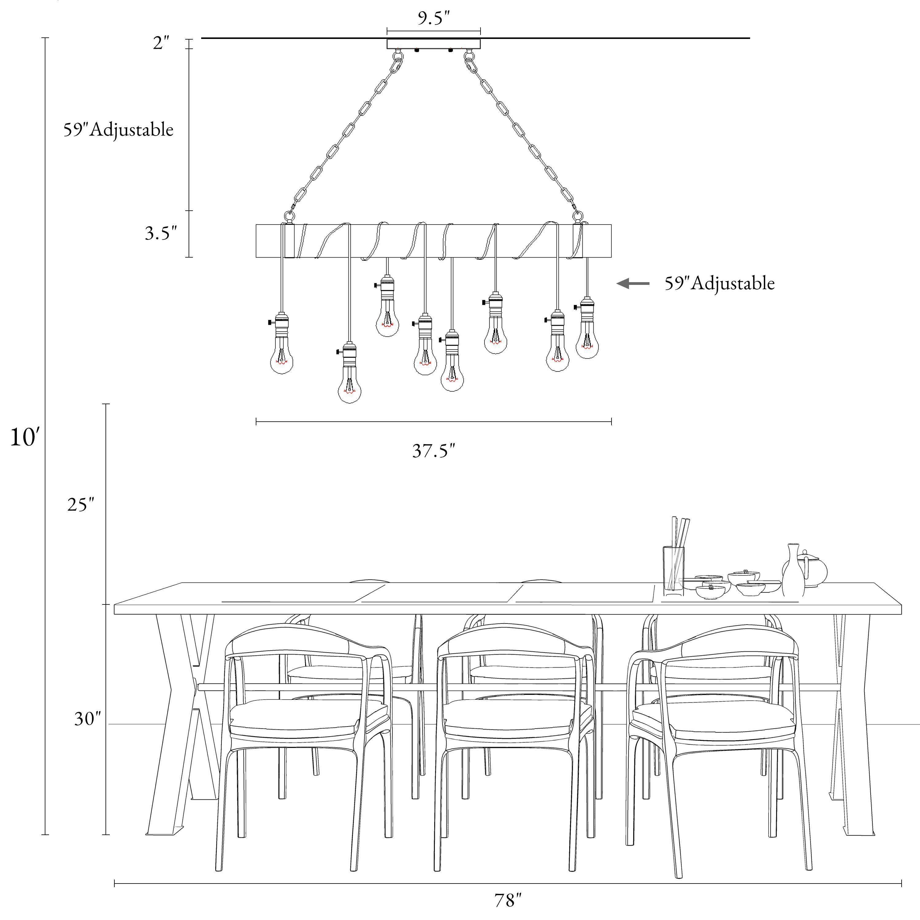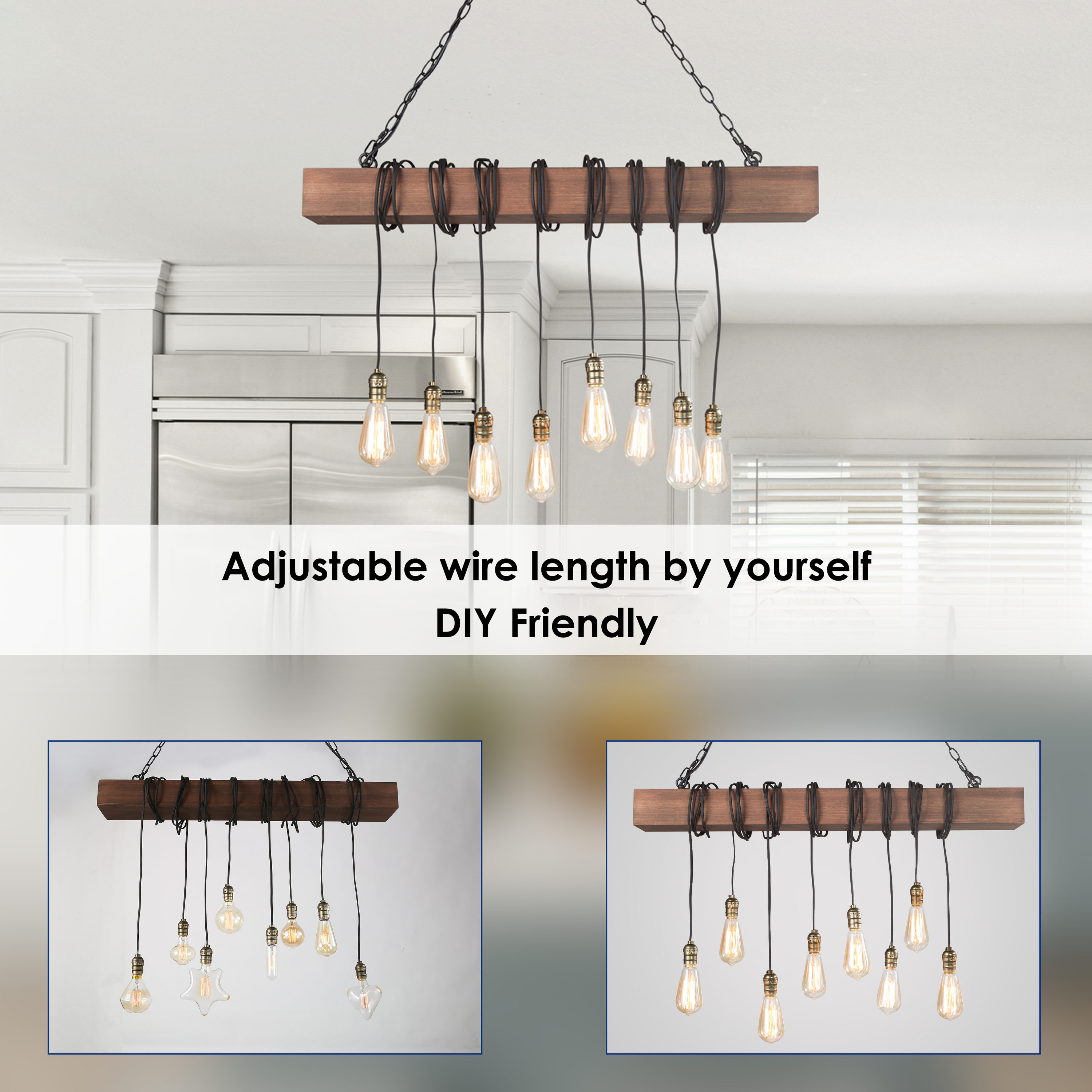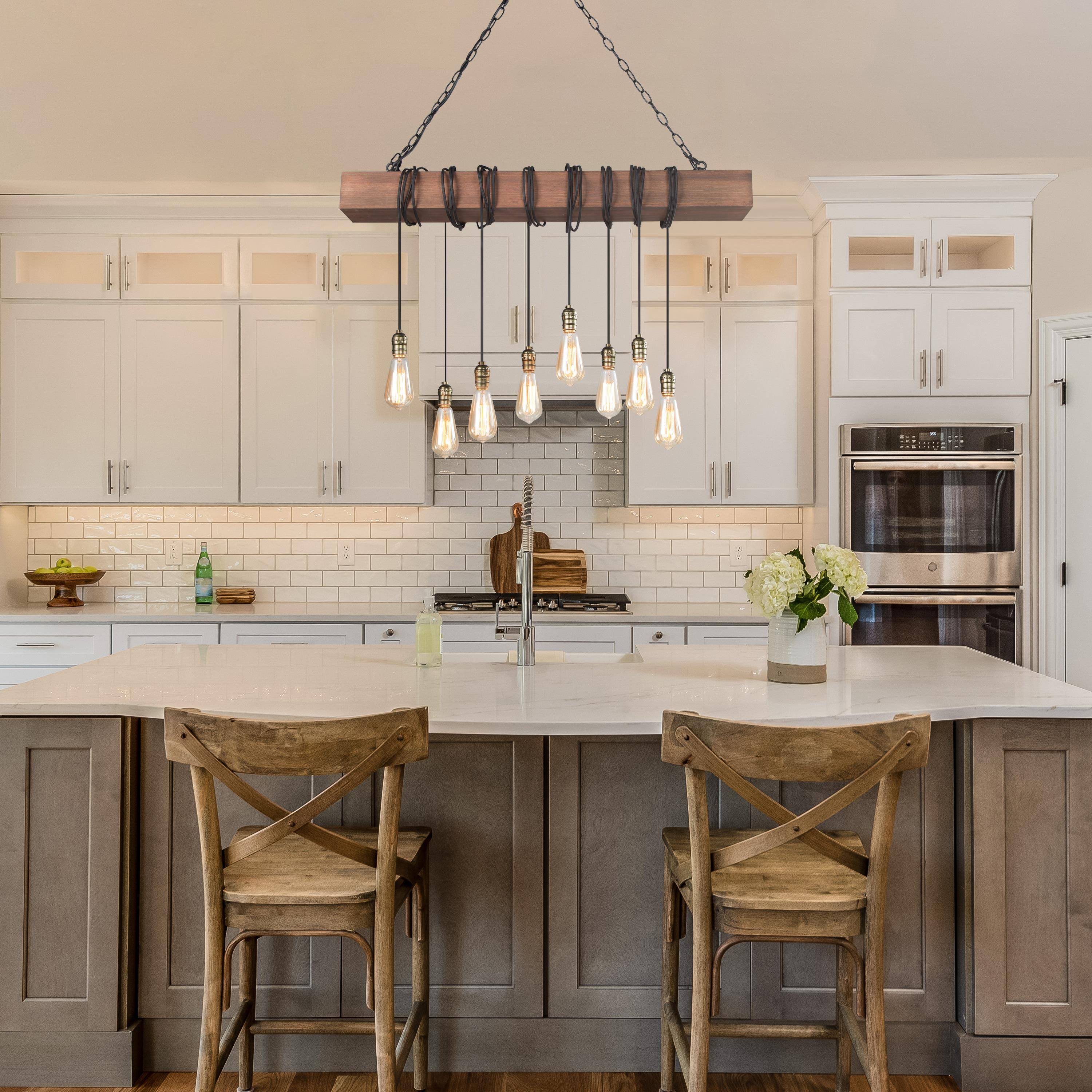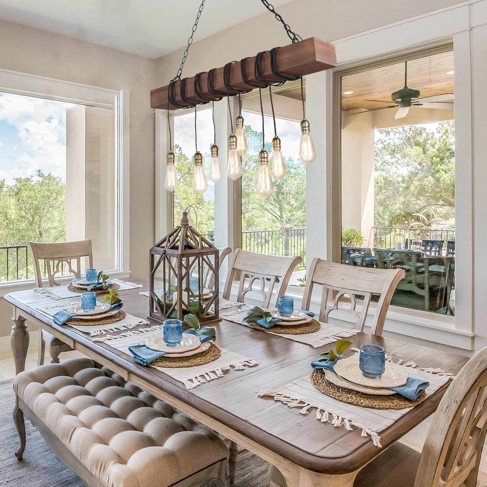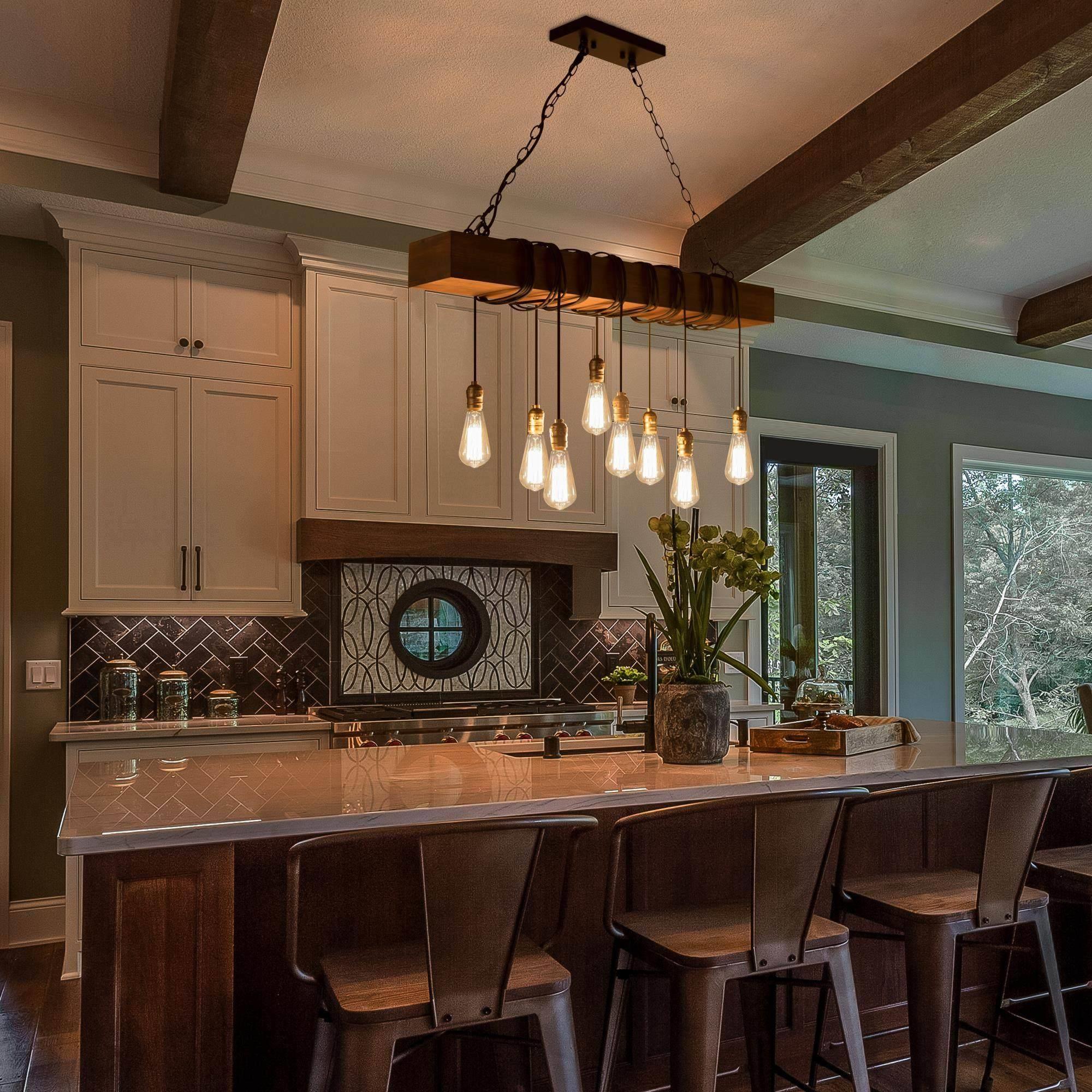 To let your room look lived-in: This 8-light natural brown wood modern farmhouse linear kitchen island chandelier is adorable. A single solid wooden beam has been transformed with expertly placed eight black twisted cord pendants to create your ideal lighting fixture. Inspired by the marriage of rustic farmhouse decoration with industrial aesthetics, this striking juxtaposition of materials resulted in the development of this classical rustic fixture. Wires of different lengths and bulbs of different shapes to shape this chandelier into a unique artwork. You can completely enjoy your DIY time. The classic color and modern design are suitable for any style of the room, whether it is modern farmhouse, rustic, vintage, transitional, traditional, or coastal, this wooden chandelier lighting fixture will be a perfect choice.