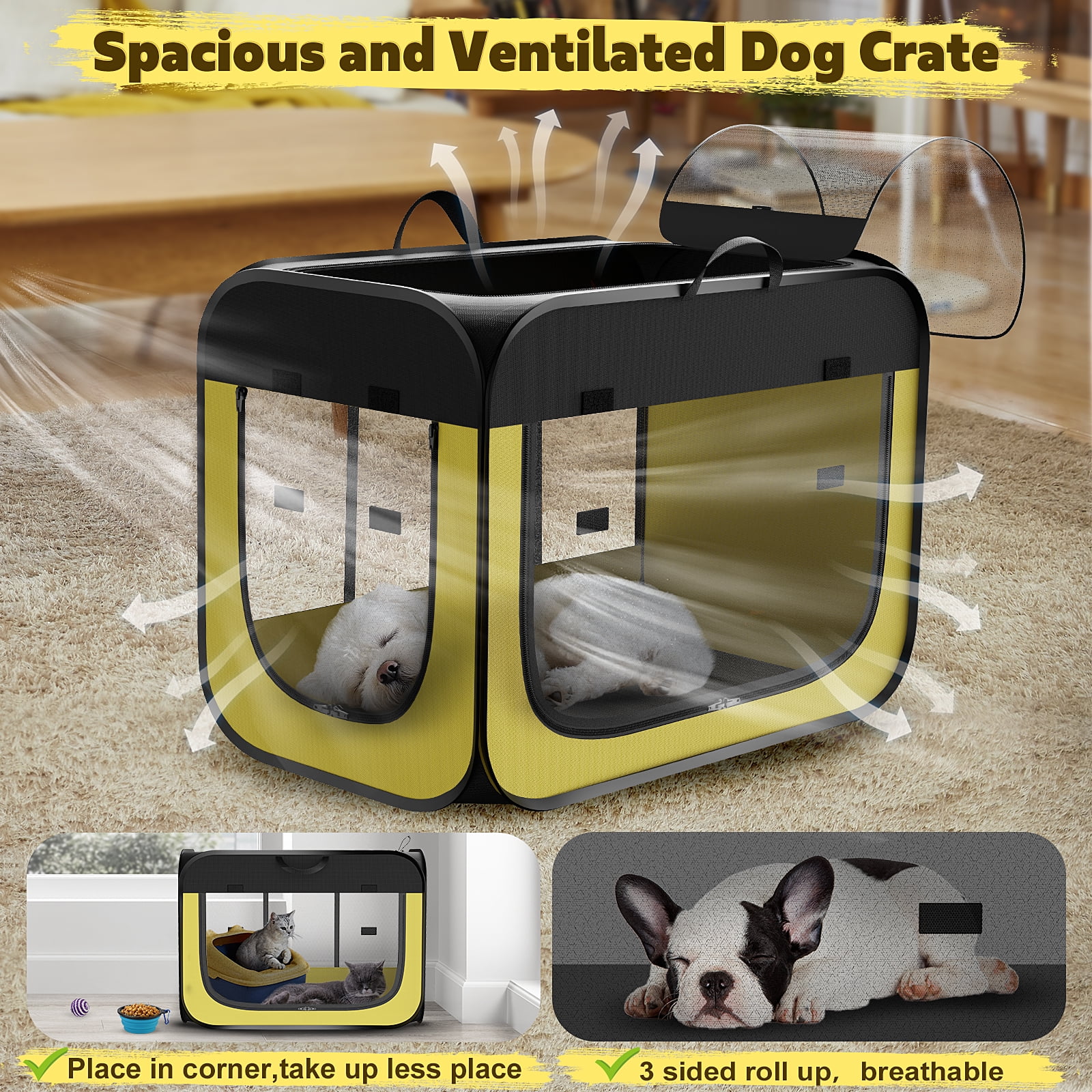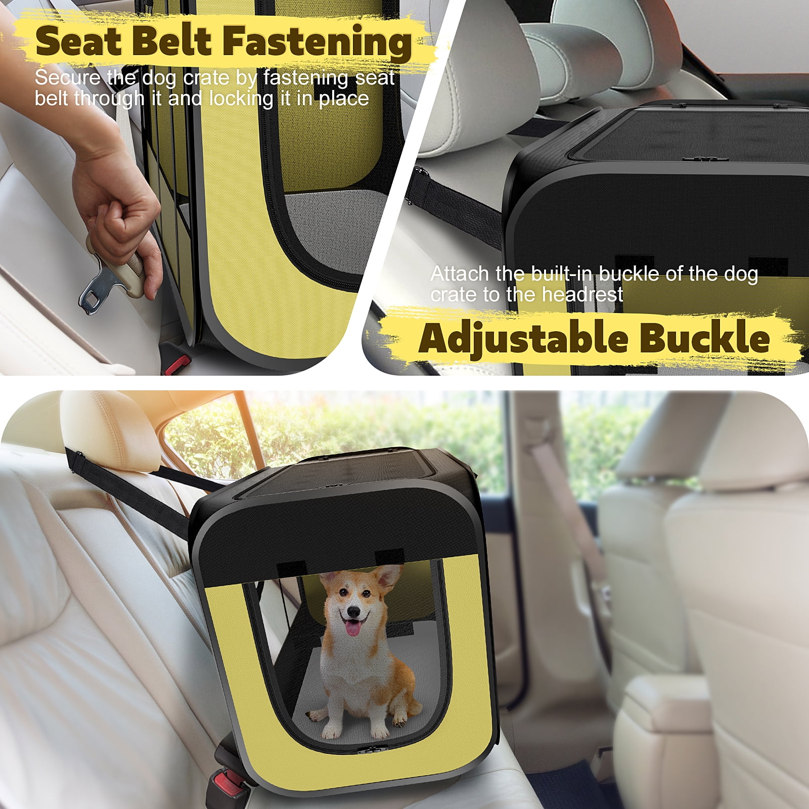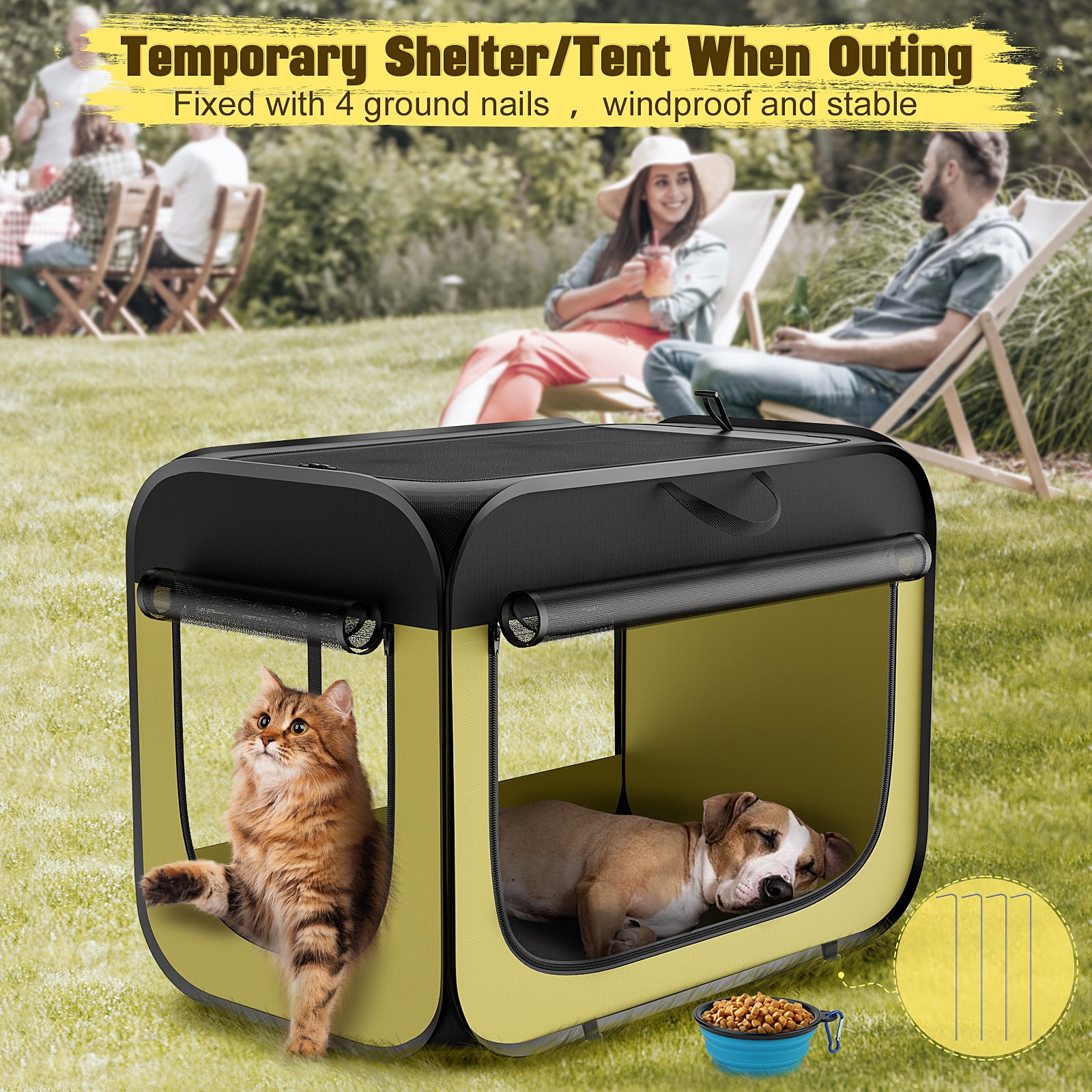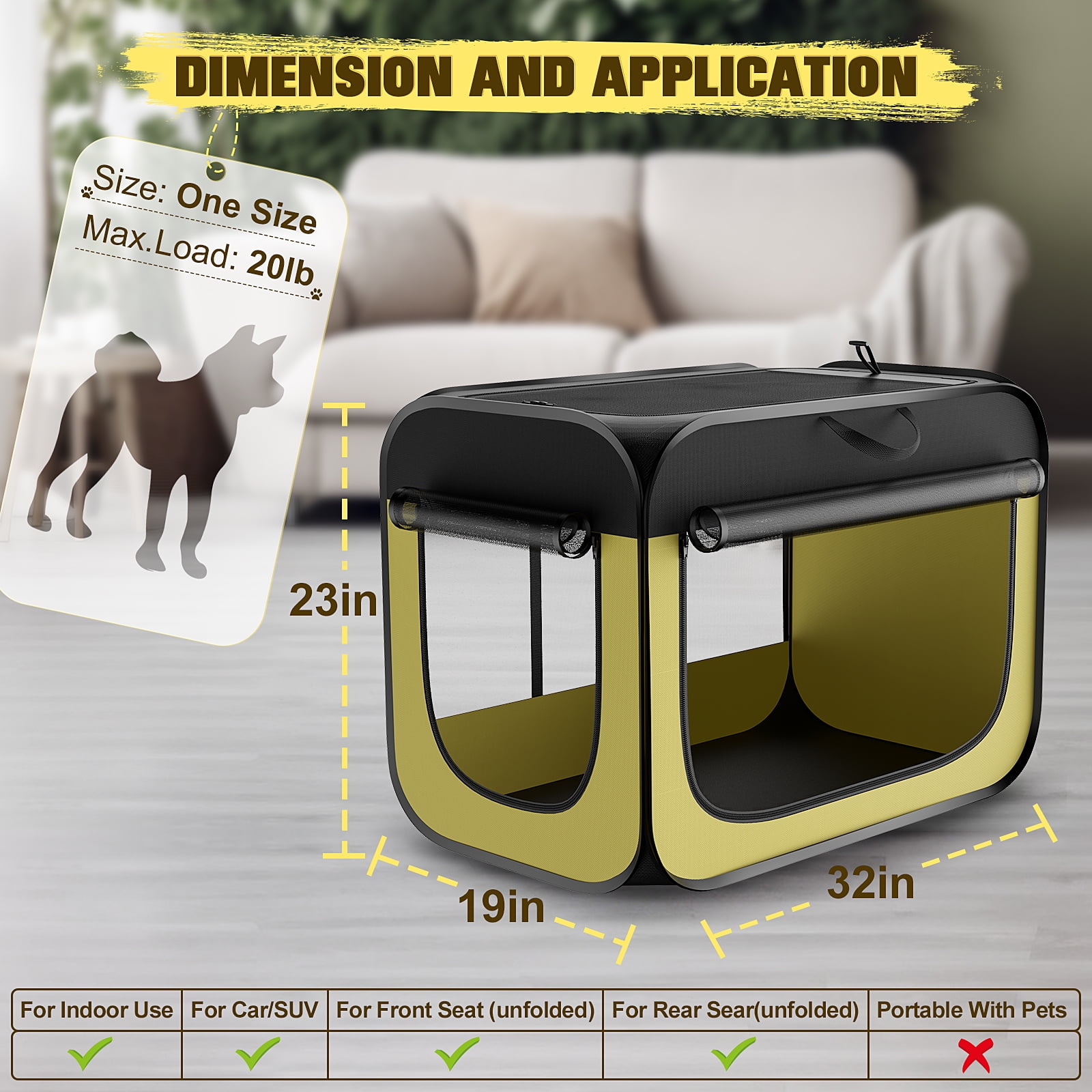 32″ L x 19″ W X 23″ H Larger Space Travel Pet Carrier for Car Rearseat (fixed by safety belt) Temporary Shelter for your pet to rest and relax while traveling Pop up insecond and Installation Tool free 4 mesh surfaces provide ventilation and 360° View 3 zippered doors for easy pet access Soft and removable waterproof pad 4 ground stakes for securely anchoring the dog cage on the lawn Includes a handy carrying case Easily folds Flat for storage Ideal for indoor/outdoor use – Dog Travel Crate:-The dog kennel can be used by opening the package and folded downThe medium / large dog pen can be easily folded and stored in the included storage bag after use.Save space and time when traveling or when not in use. : The Folding soft dog use yet lightweight steel tube design that not warp. Dog kennel also comes with 4 to hold it in the grass. 3 high-density mesh windows of soft sided large dog crate willand be . Meanwhile you can roll up and secure the mesh panels with velcro to check on your cute friend and for extra air flow. Mading of waterproof material dog crate can be easily wiped clean in seconds or simply rinse with water. : There are on the side for conveniently storing treats, rubbishand and leash with a carrying handle for easy handling.32″ L x 23″ W x 19″ H dog crate provides a larger space for pets to rest..Removable pad is comfortable and washable.Great as a car crate for small and medium dogs/cat/rabbit. This collapsible dog crate is a better replacement for a dog cage, keeping your pet in your sight and enjoying fresh outdoor air. Indoors the crate is ideal for pet, isolating an injured pet, or introducing a new pet and as a pet delivery room . It can supply outdoor time to protect pets from summer pests like mosquitoes when your pets rest and nap in patio or yard