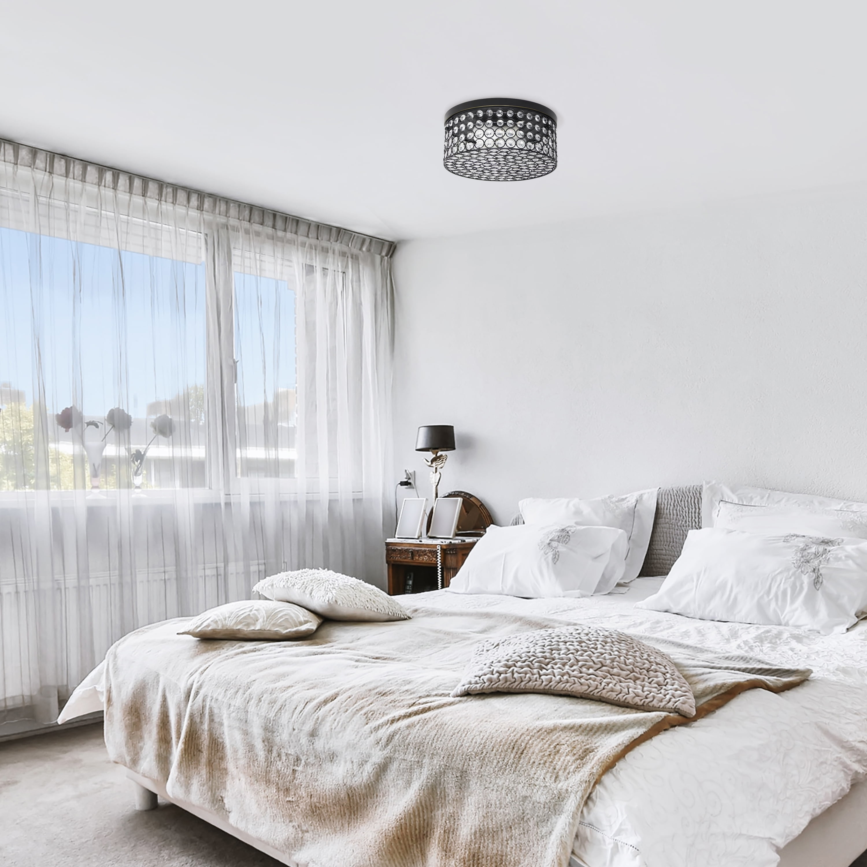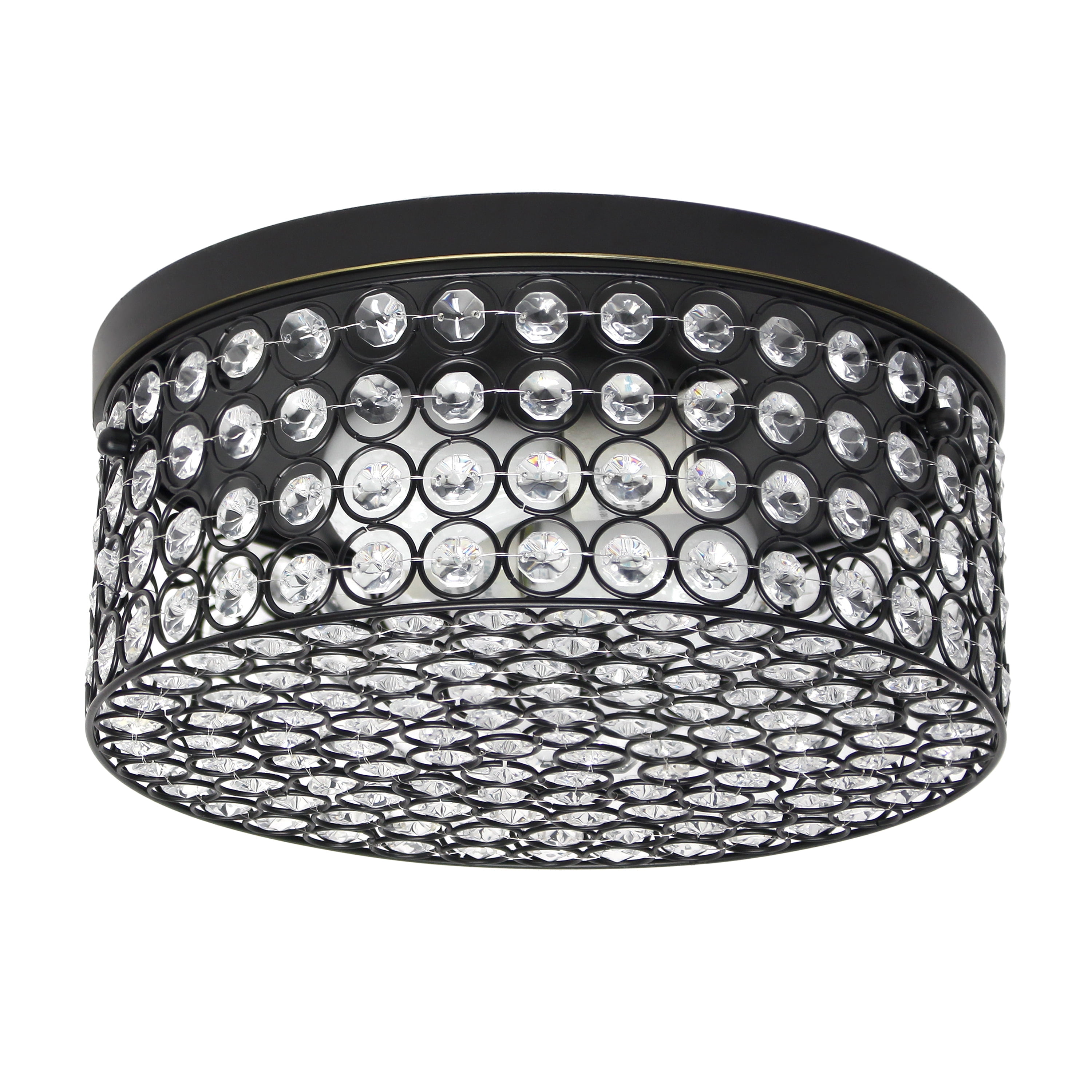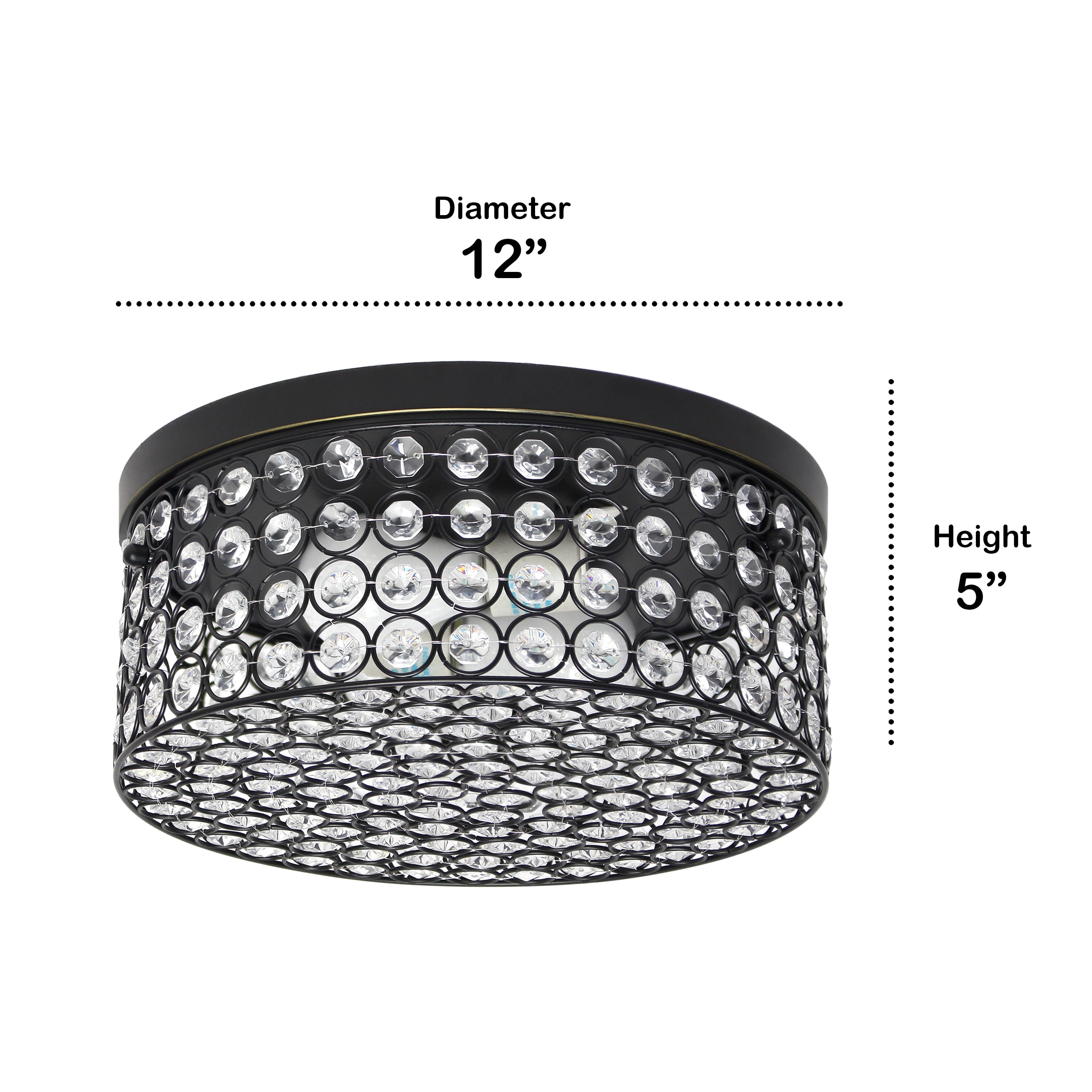 Includes 1 x round flush mount with a restoration bronze base and details Features elegant K5 crystals throughout, including 4 rows of crystals in height Requires 2 X 60 watt equivalent type B10 E26 medium base bulbs (not included) Measures Dia: 12″ x H: 5″ Requires hardwiring and minimal assembly Available in a variety of beautiful metal finishes