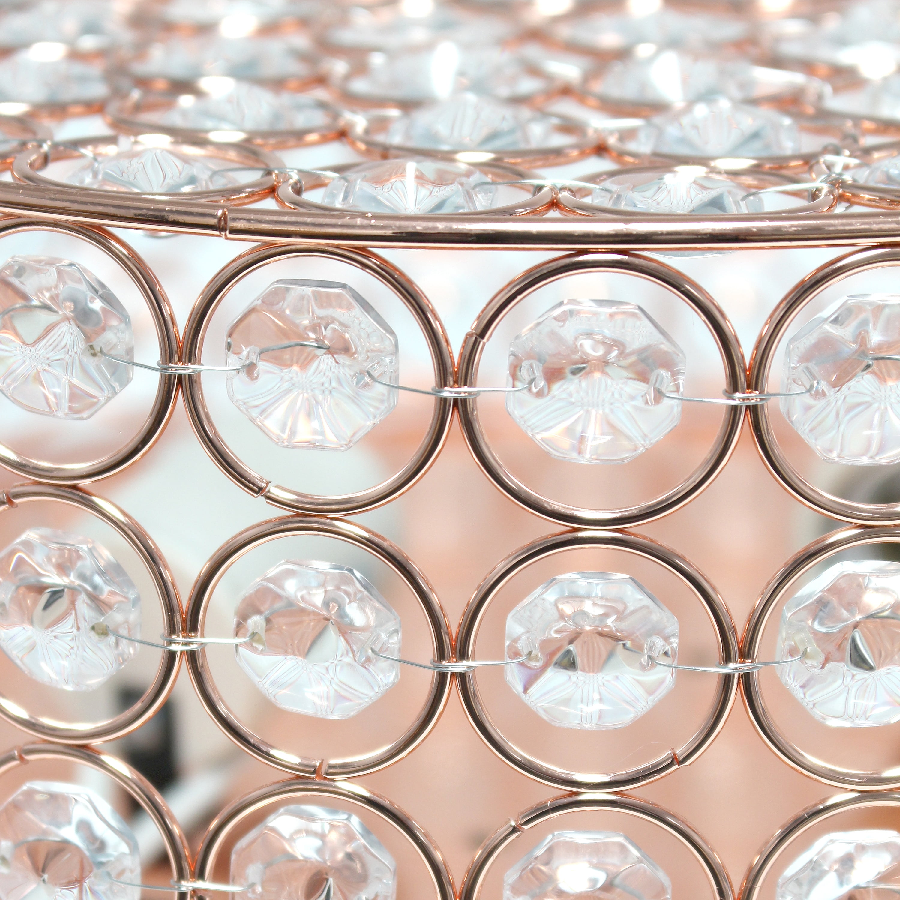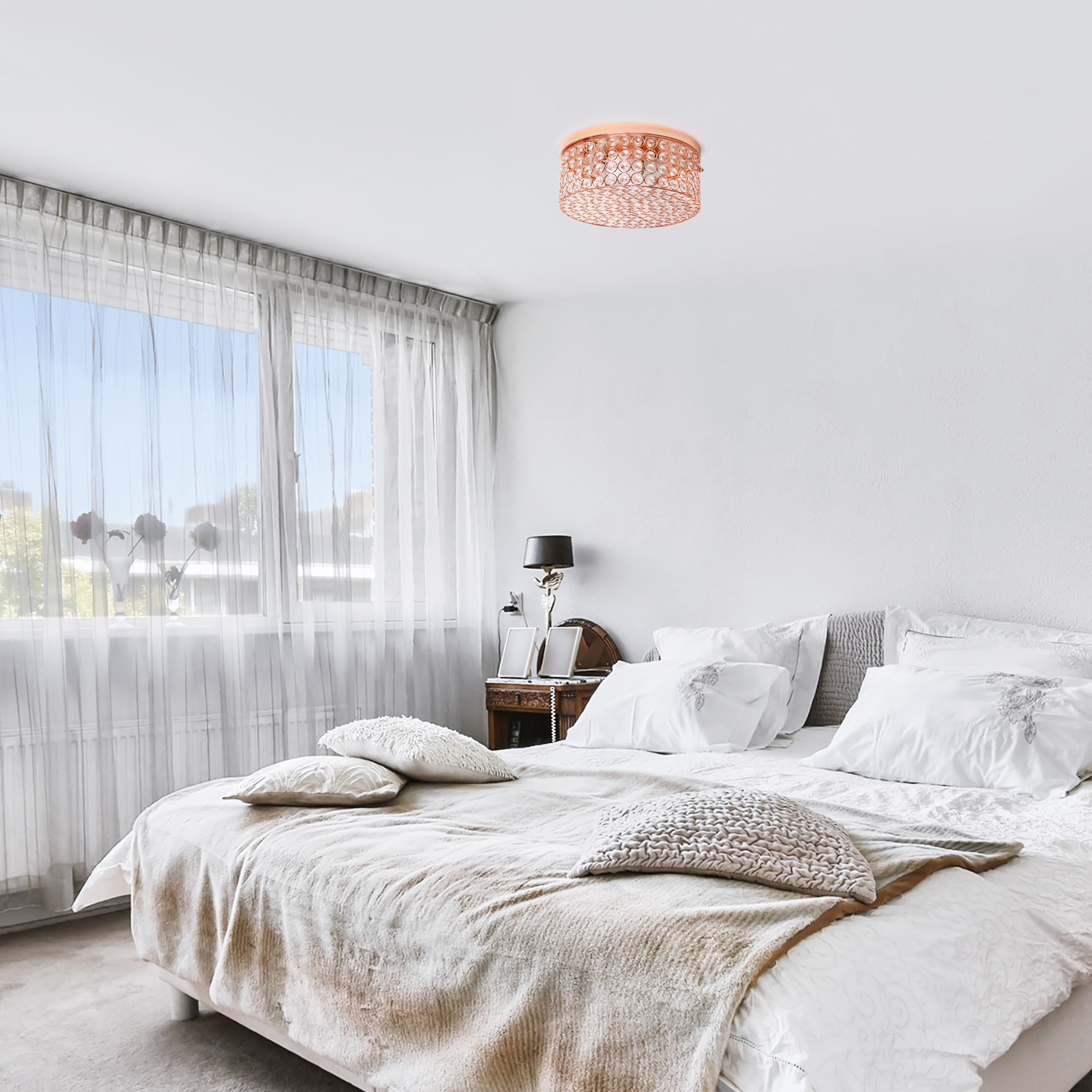 Includes 1 x round flush mount with a rose gold base and details Features elegant K5 crystals throughout, including 4 rows of crystals in height Requires 2 X 60 watt equivalent type B10 E26 medium base bulbs (not included) Measures Dia: 12″ x H: 5″ Requires hardwiring and minimal assembly Available in a variety of beautiful metal finishes