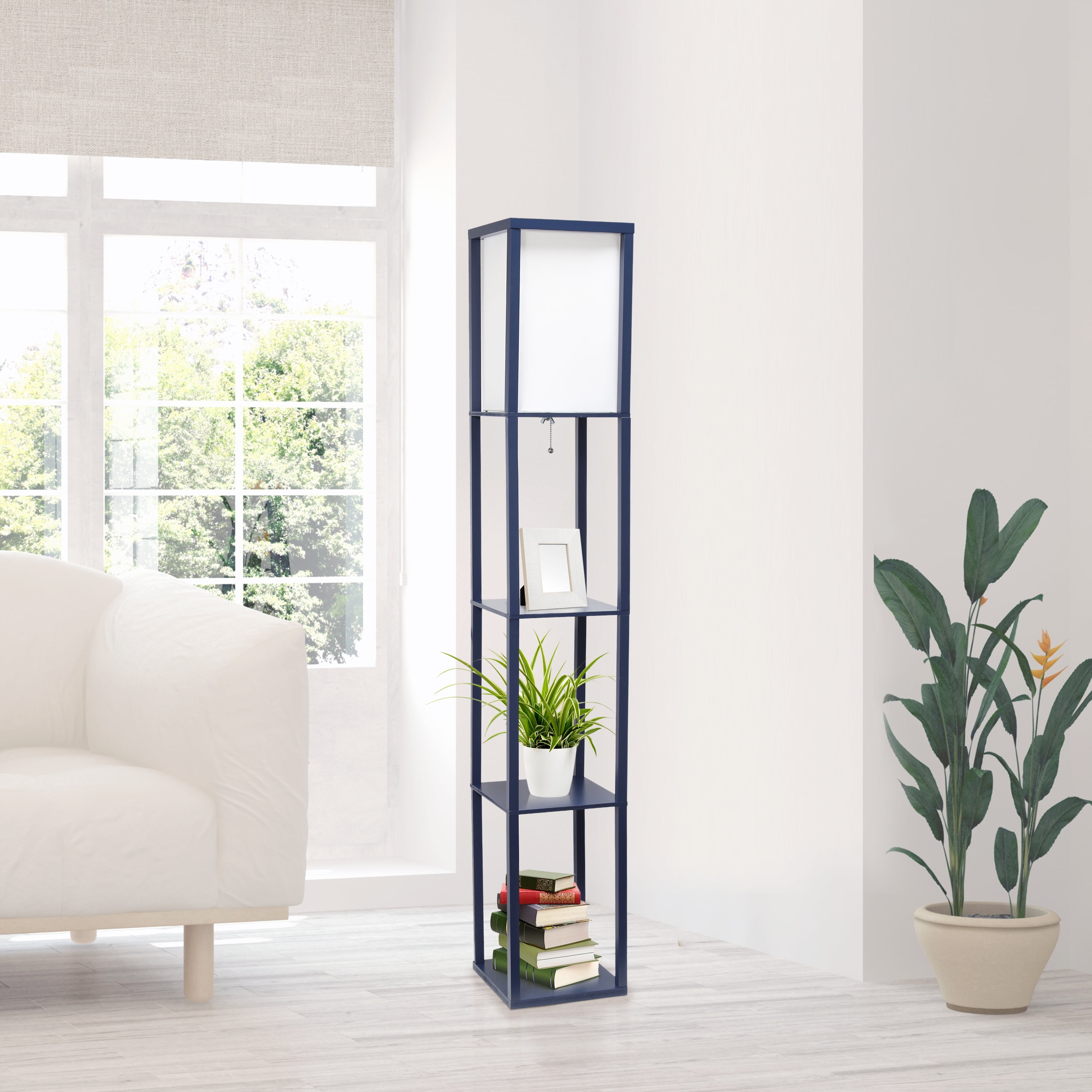 White linen shade casts soft, warm glow Floor lamp with 3 shelves for storage/display in navy blue finish Requires 1 x 100-Watt equivalent Type A medium base bulb (not included) Pull-chain on/off switch located conveniently located under shade Assembly required Available in a variety of finishes