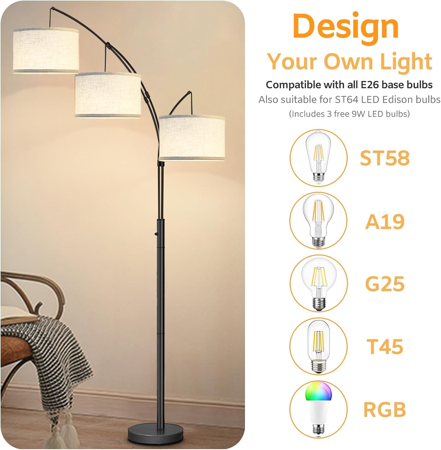 Lambaolom 3 Light Modern Easy To Install Black Floor Lamp Shades Ideal for home decor, perfect for modern and mid-century rooms Conveniently located switch above the sofa for easy access while seated 360° rotating arc lamp allows for precise light direction with adjustable curved arm Illuminates in three directions with shades at different heights for versatile lighting Features a 3-way switch to control 1, 2, or all 3 bulbs for ambient or task lighting Includes 3 energy-efficient 9W LED bulbs for enhanced illumination Heavy, wide base ensures stability and reduces tipping risk, ideal for homes with children and pets Easy installation in just 20 minutes with the provided guide and user manual
