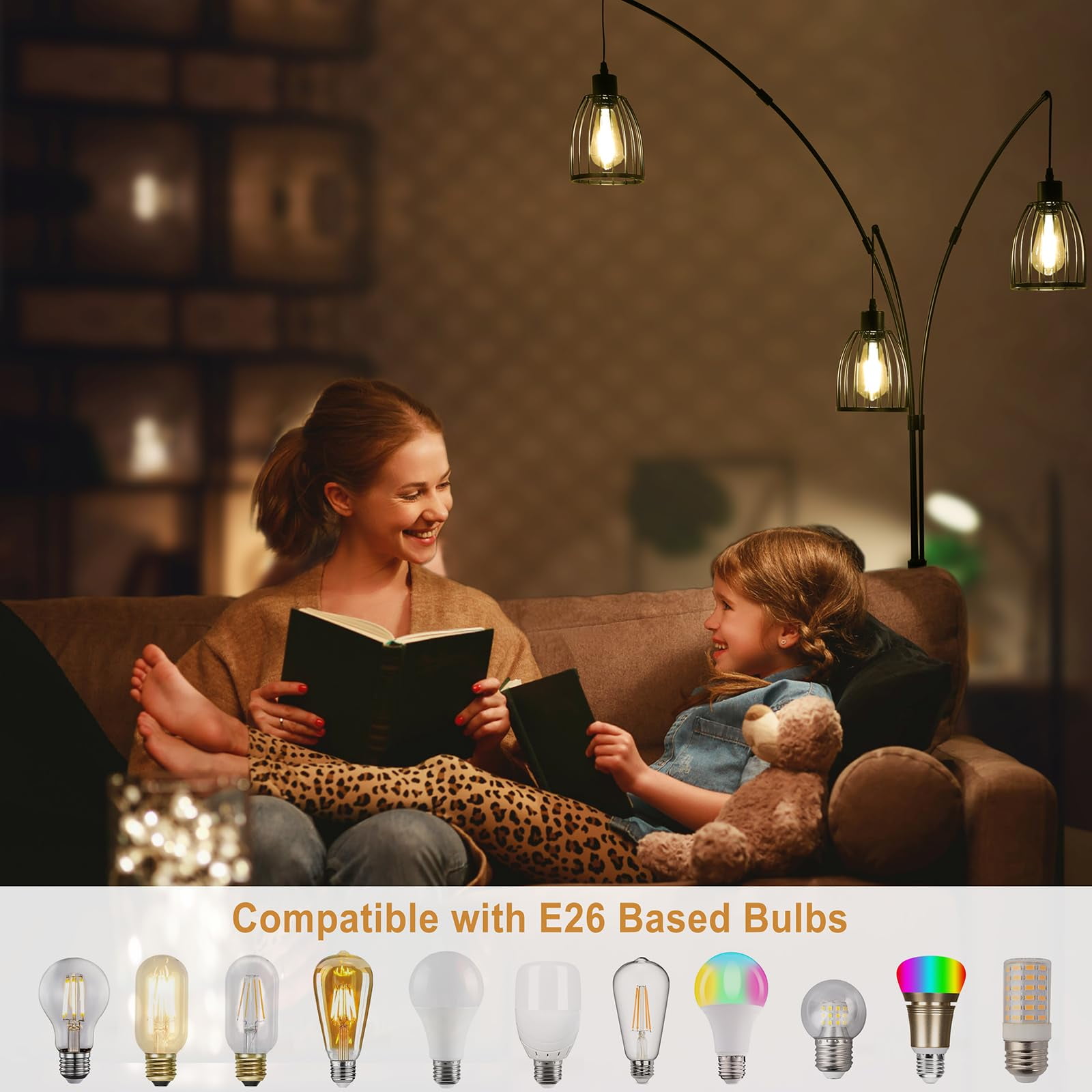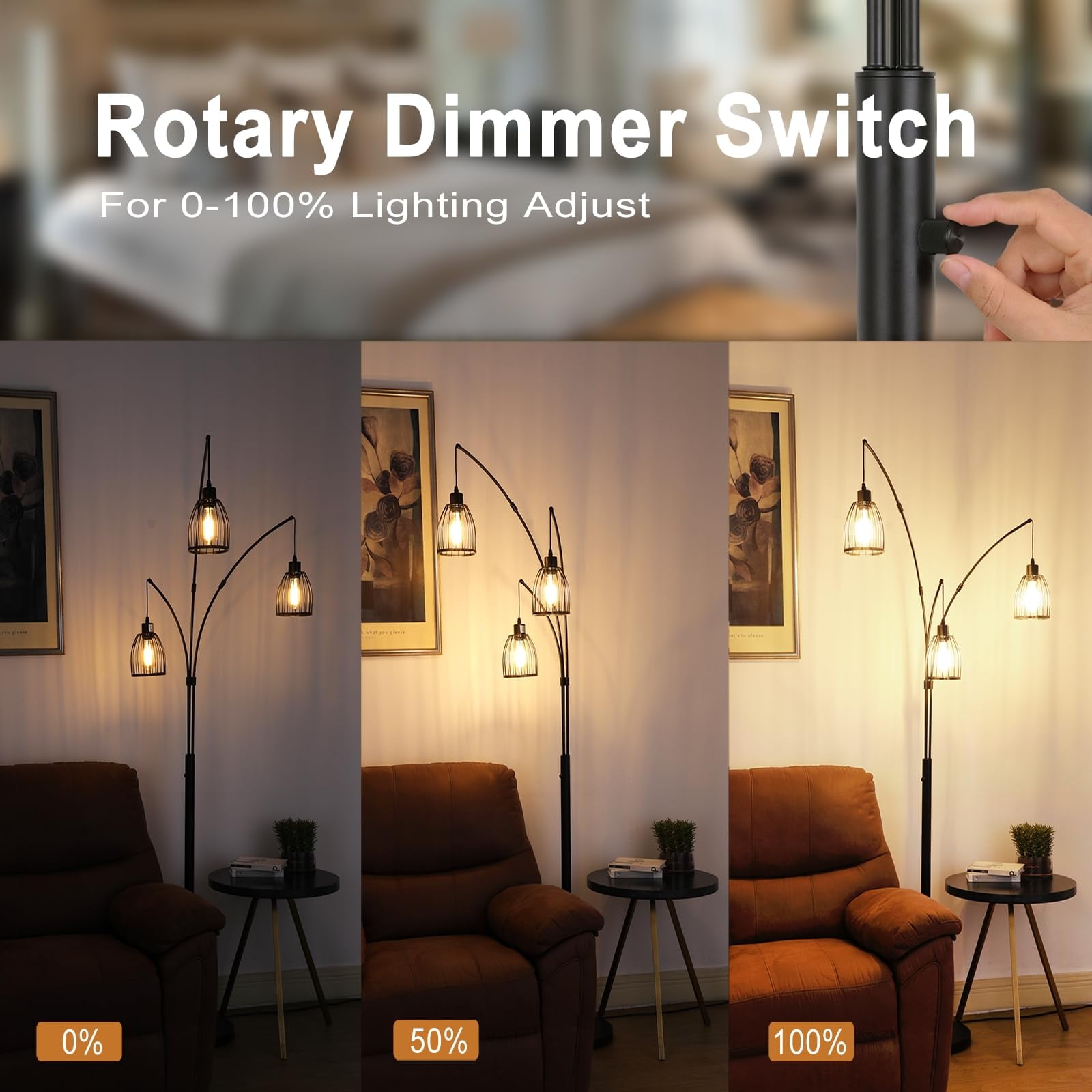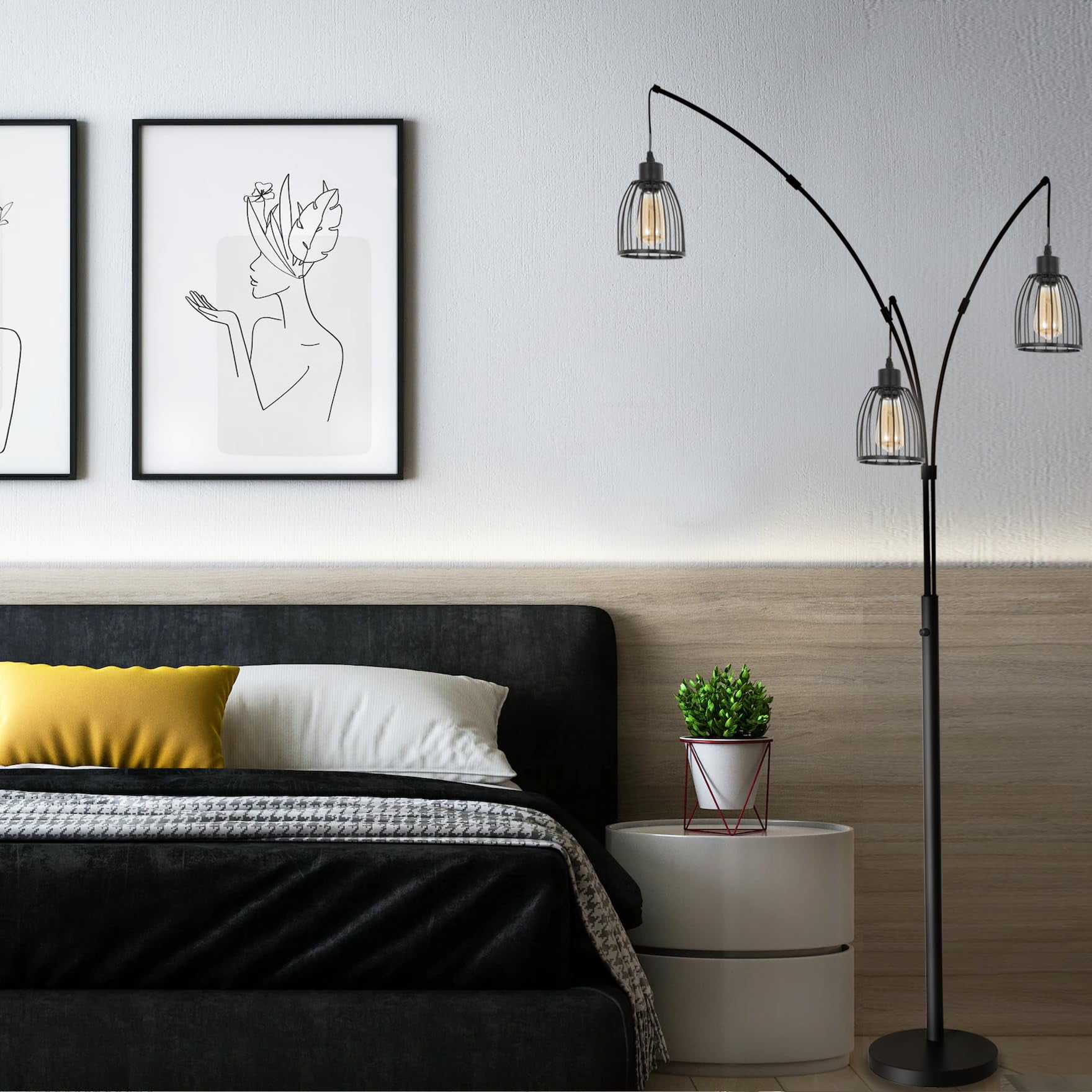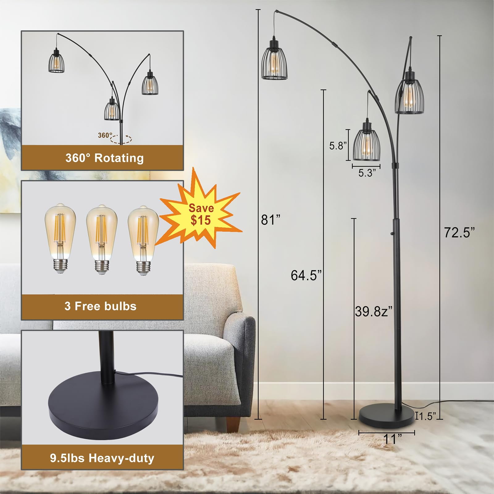 Lambaolom 81” 3-Light Modern Dimmable Black Arc Floor Lamp with Black Teardrop Cage Ideal choice for home decoration with a functional and artistic design, elevating your space with its curved structure and stunning teardrop cage Stands at 81 inches, serving as a prominent focal point while providing ample lighting and a grand ambiance to your living room Features a 360° rotating arc design for optimal adaptability, allowing precise light direction adjustments through the curved arm Offers varying-height lampshades for comprehensive three-directional illumination in your space Supports 0% – 100% unlimited dimming, enabling you to create ideal lighting for any scene, from warm reading to bright gatherings