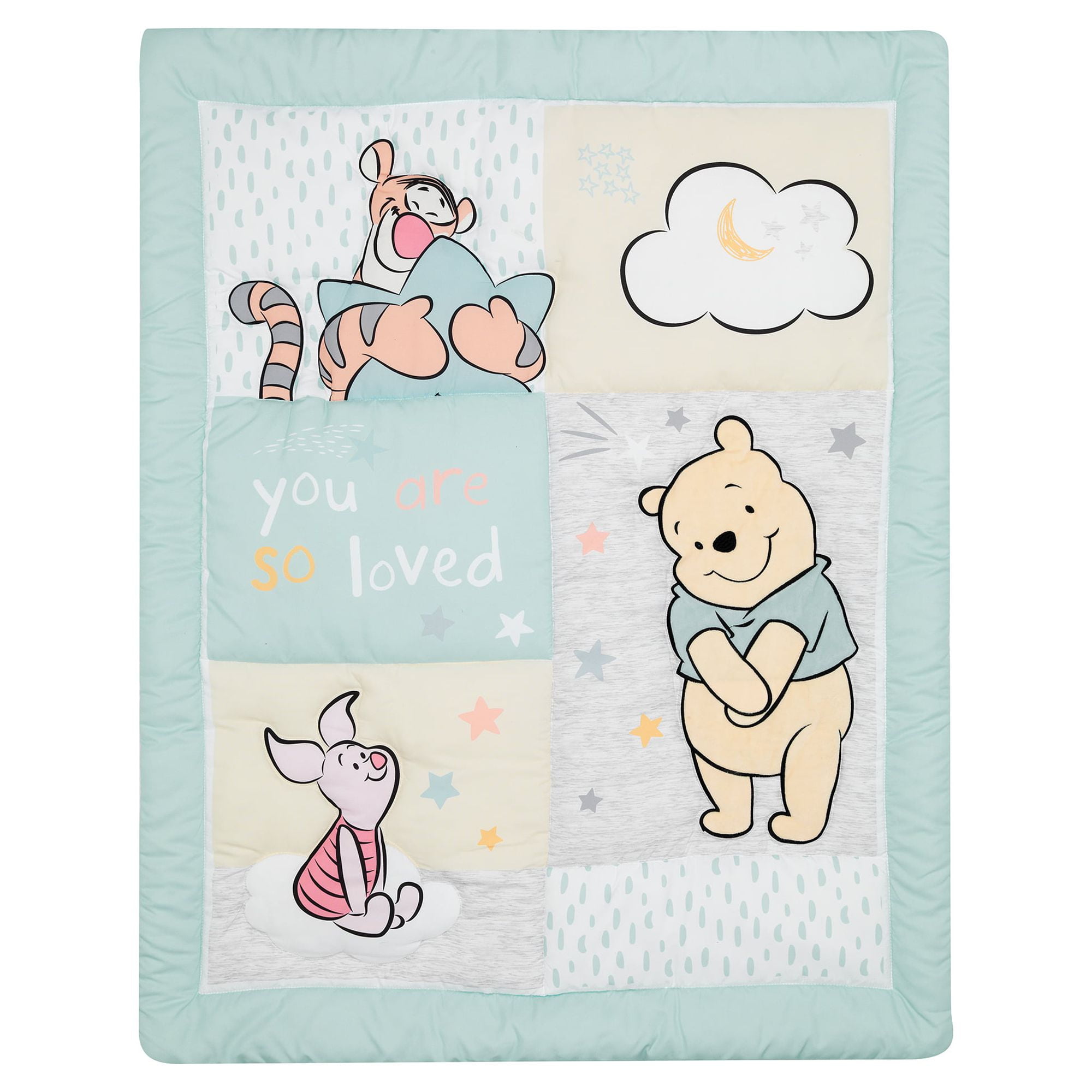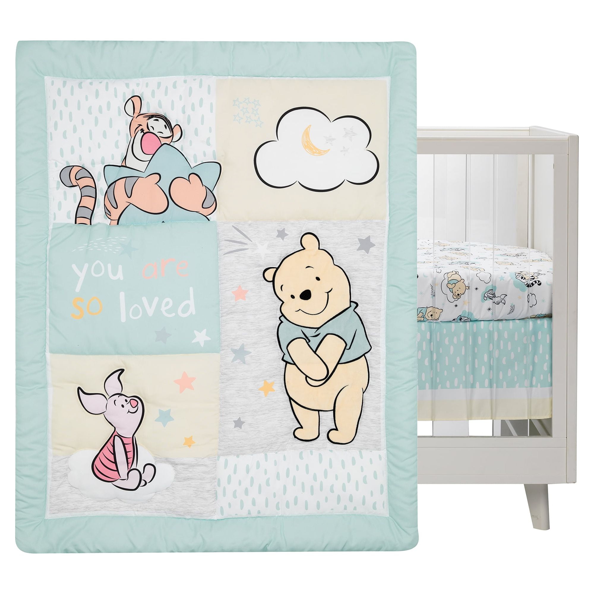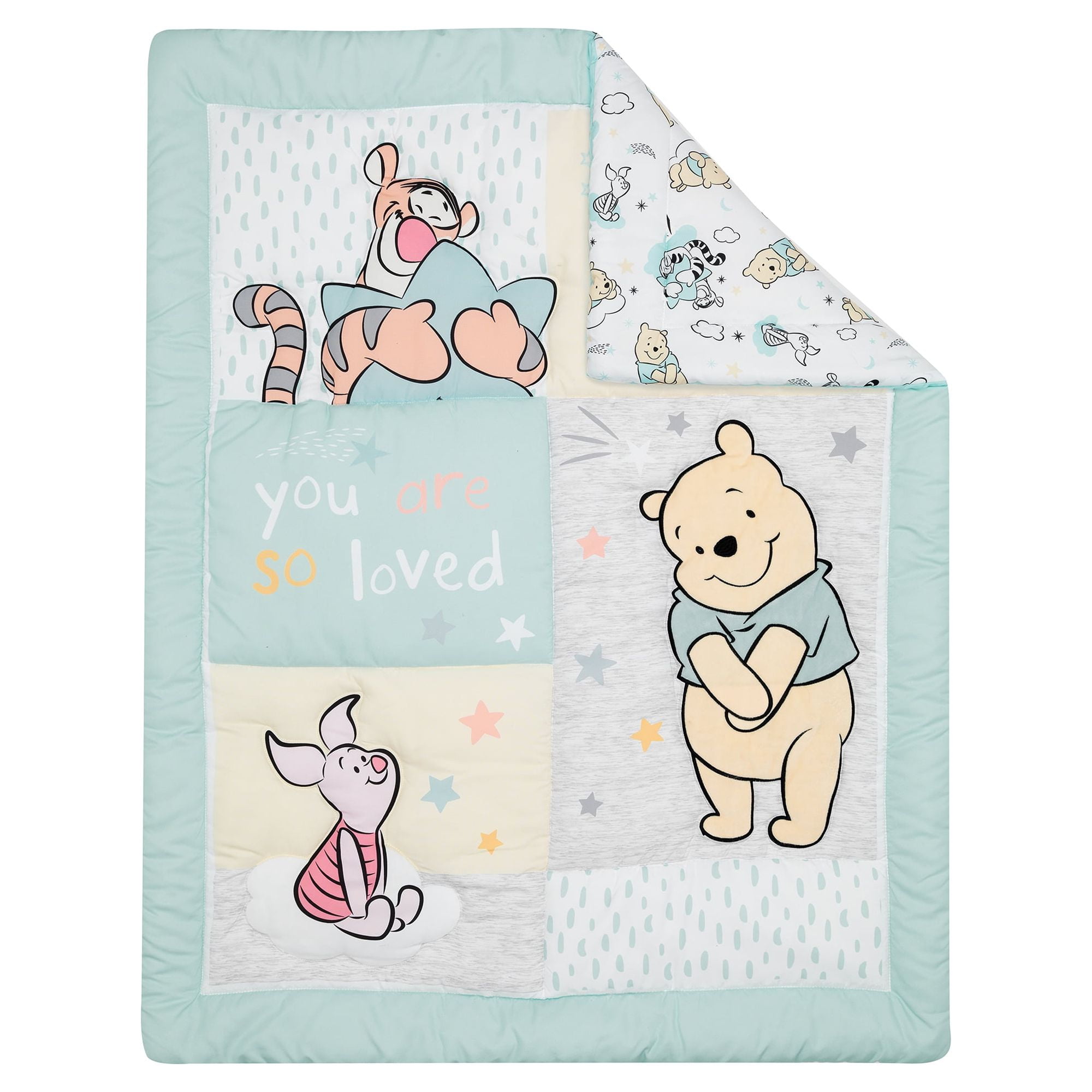 3-piece crib bedding set includes one quilt, one fitted crib sheet, and one crib skirt Pretty soft pastel color palette is perfect for baby boys or girls Patchwork features Winnie the Pooh, Tigger, and Piglet Pooh is fully appliqued and embroidered in soft textured fabrics Made in a soft microfiber material