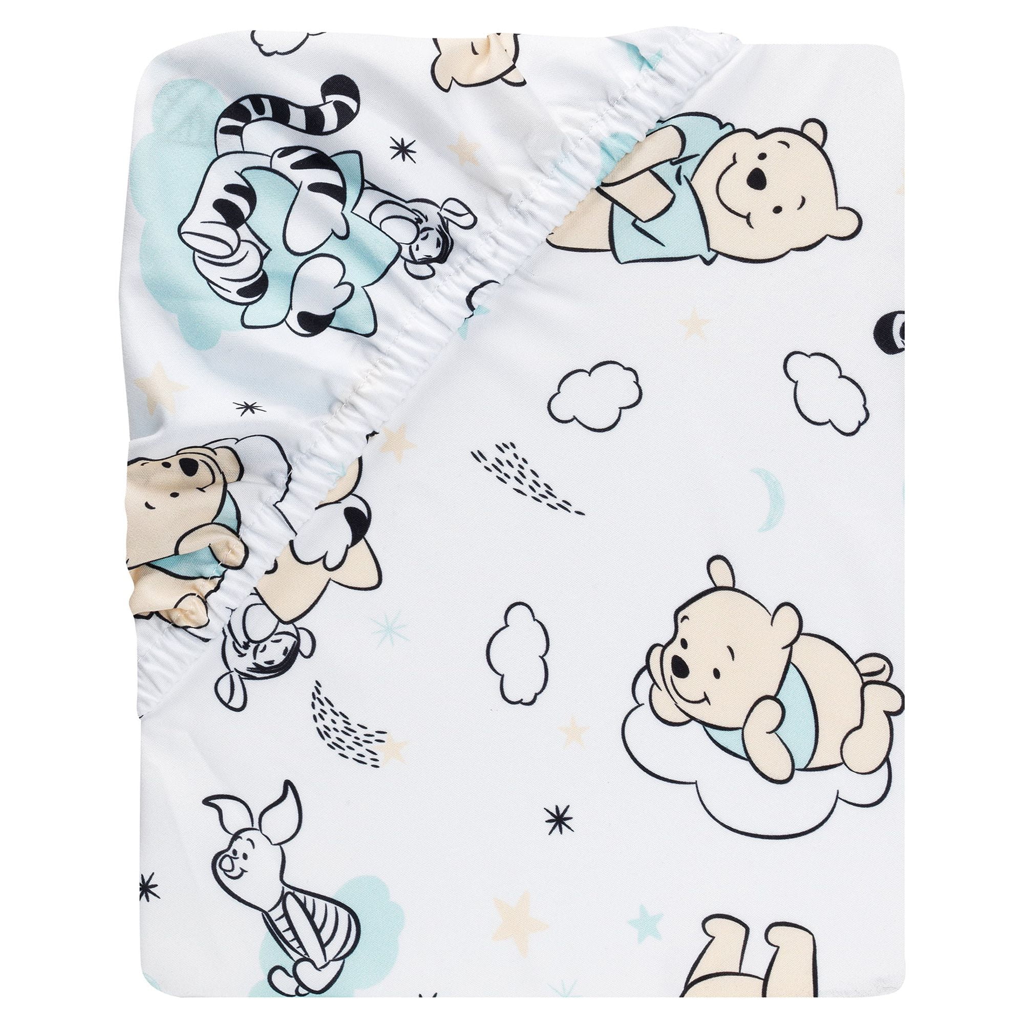 Winnie the Pooh is one of Disney’s most loved characters. This enchanting three-piece crib bedding set includes an appliqued quilt, fitted crib sheet, and crib skirt. The quilt features a 17 ½” appliqued and embroidered Winnie the Pooh. He is standing on a light heather gray background with his hands shyly covering his belly button and a sweet smile on his face. His shirt is made of a soft mint color velour. Tigger is in the upper corner patch hugging his favorite baby blue star. Little Piglet is close by too and is sitting on a fluffy cloud surrounded by colorful stars. The words “You are so Loved” are neatly placed in the center-left patch among these three happy characters. There is a 3” border around the quilt. This collection is made in a soft microfiber fabrication. The fitted crib sheet features Pooh in several different positions, Tigger hugging yellow and blue stars, and Piglet sitting on a cloud looking at the sky filled with stars, clouds, and the moon. The fitted crib sheet has elastic all the way around ensuring a safe and secure fit on a standard size crib mattress measuring 52” X 28”. The top panel of the coordinating crib skirt is a soft minty color, has a one-inch white stripe below and the bottom is a solid maize color. The crib skirt is 10” long and adds the finishing touch to this charming collection.