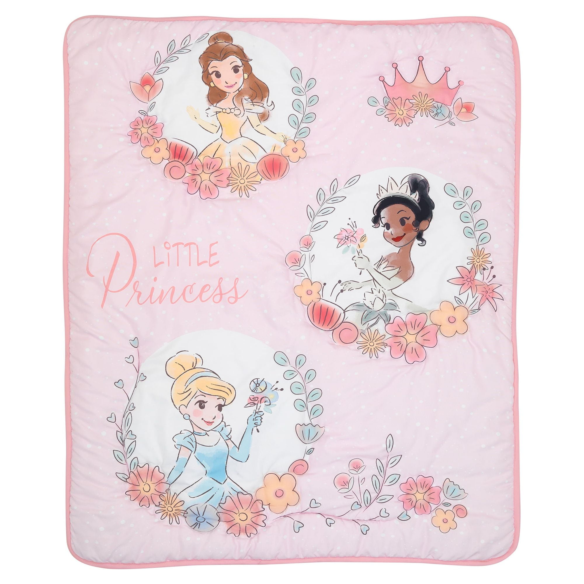 3-Piece baby crib bedding set includes one quilt, one fitted crib sheet and one crib skirt Features three officially licensed Disney Princesses: Belle, Tiana, and Cinderella Fitted crib sheet has elastic all the way around ensuring a safe and secure fit Crib skirt has tossed white stars and a pretty floral garland Made of a super soft microfiber fabric