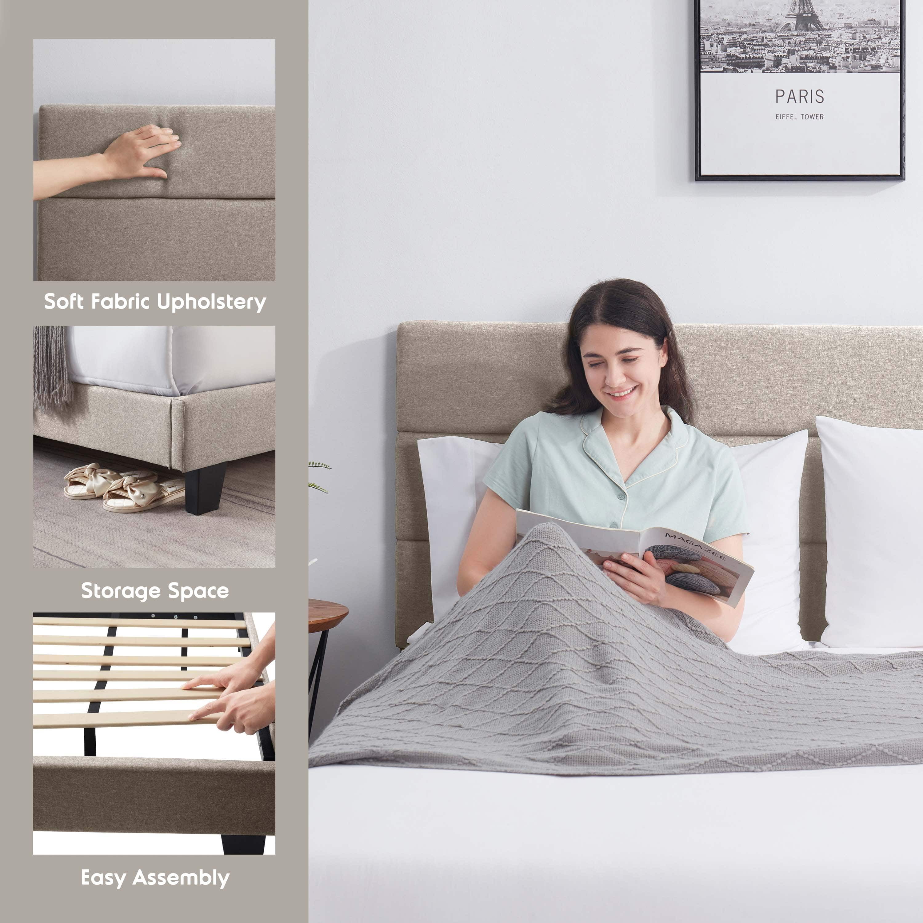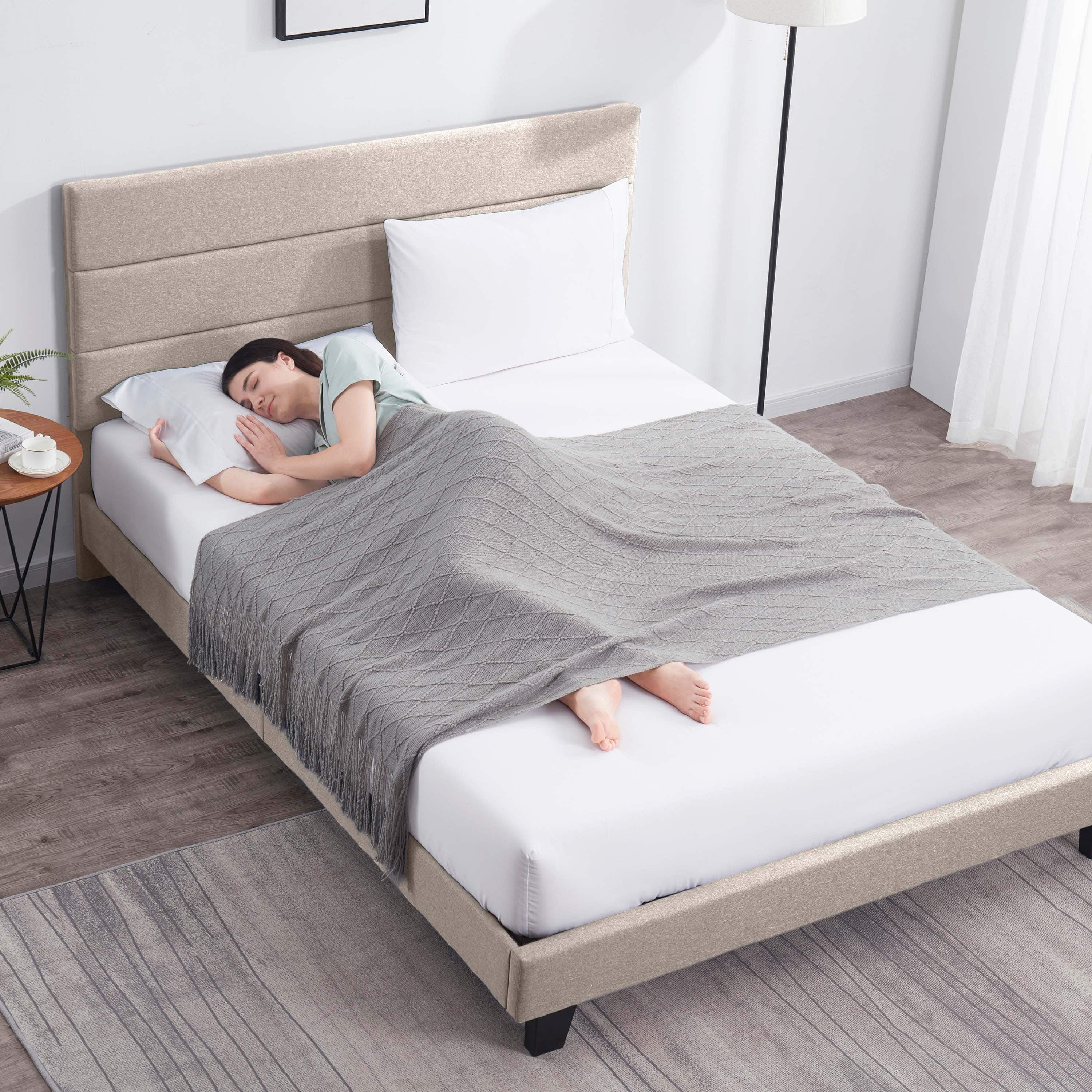 Lammaloe Horizontal Channel Upholstered Platform Bed transforms your bedroom into a luxurious haven with a timeless design. This full bed frame with headboard is built to last, with sturdy wooden slats and adjustable height, so it can be used with or without a box spring. The modern split channel headboard features plush linen upholstery, adding texture and comfort. It offers comfortable backrest support while relaxing, reading, or watching TV.