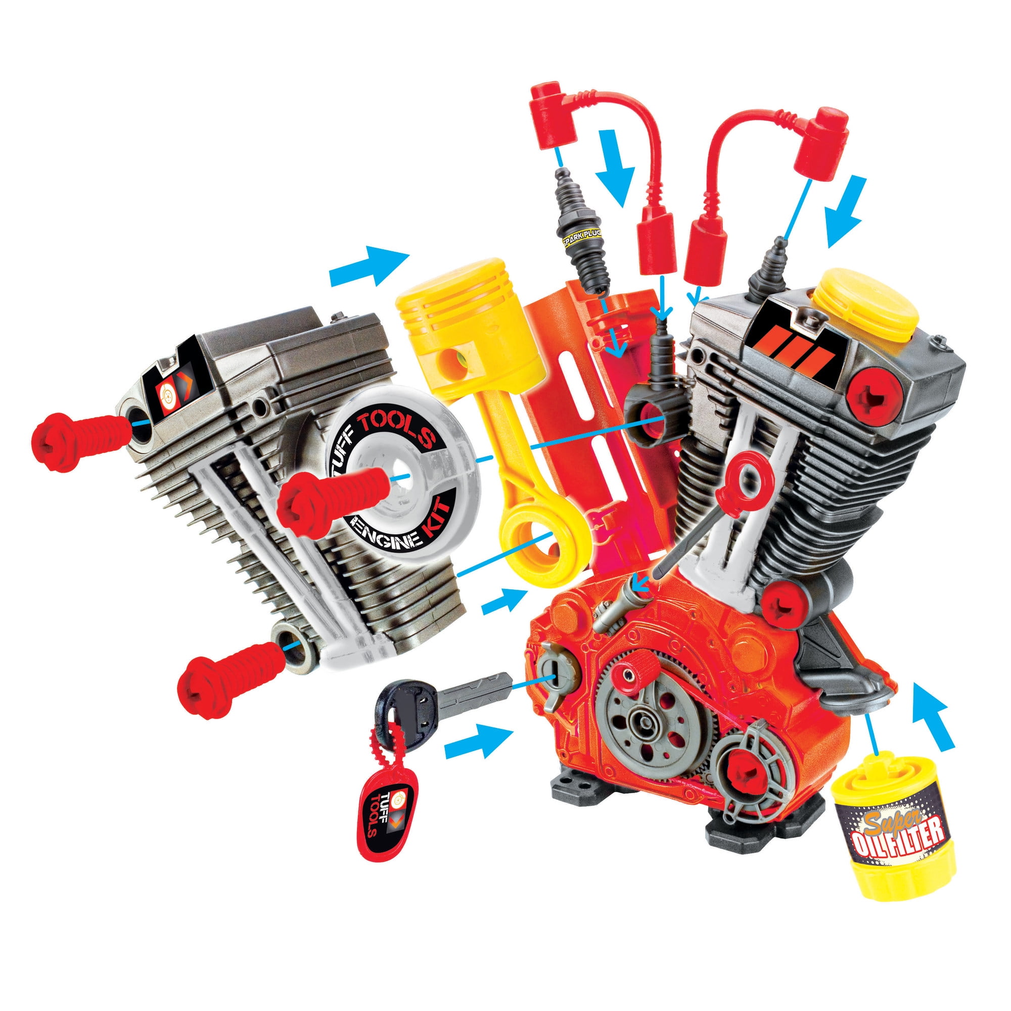 LIGHTS & SOUNDS: The Tuff Tools Light and Sound Engine Overhaul Toy Set will have your child feeling like a real motorcycle mechanic. MOTORCYCLE ENGINE: Disassembled and reassembled as many times as you want. BUILDING – CHANGE PARTS: This set will keep your child busy while helping them build their cognitive skills. 25 PIECE PLAYSET: Battery operated lights and sound. Includes 25 pieces of parts, tools and accessories. SPARK IMAGINATION: Engaging hands on toys allow kids to create their own stories and play scenes.