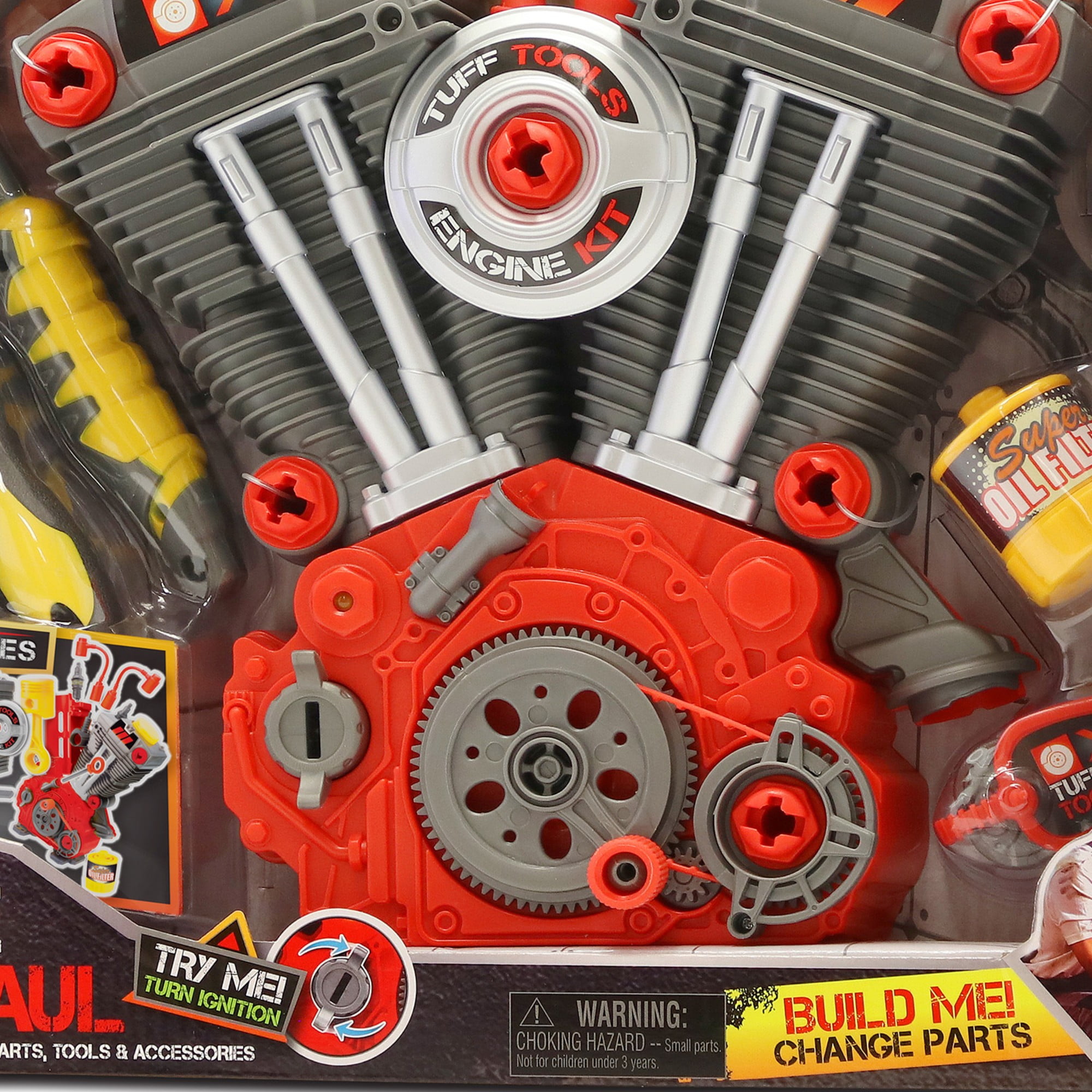 TUFF TOOLS: ENGINE OVERHAUL – 25 Pieces – Did someone say that it’s tool time? The Tuff Tools Light and Sound Engine Overhaul Toy Set will have your child feeling like a real motorcycle mechanic. This motorcycle engine can be easily disassembled and reassembled by your budding mechanic. Turn the crank to watch the pistons pump. Hear the engine rev up and watch the light glow. The set includes 25 pieces of parts, tools and accessories. This Engine Overhaul set will keep your child busy while helping them build their cognitive skills.Play right out of the box, batteries are included. This toy tool is designed for kids ages three years and up. Complete your tool kit with other Tuff Tools® toys and toy sets from Lanard®.