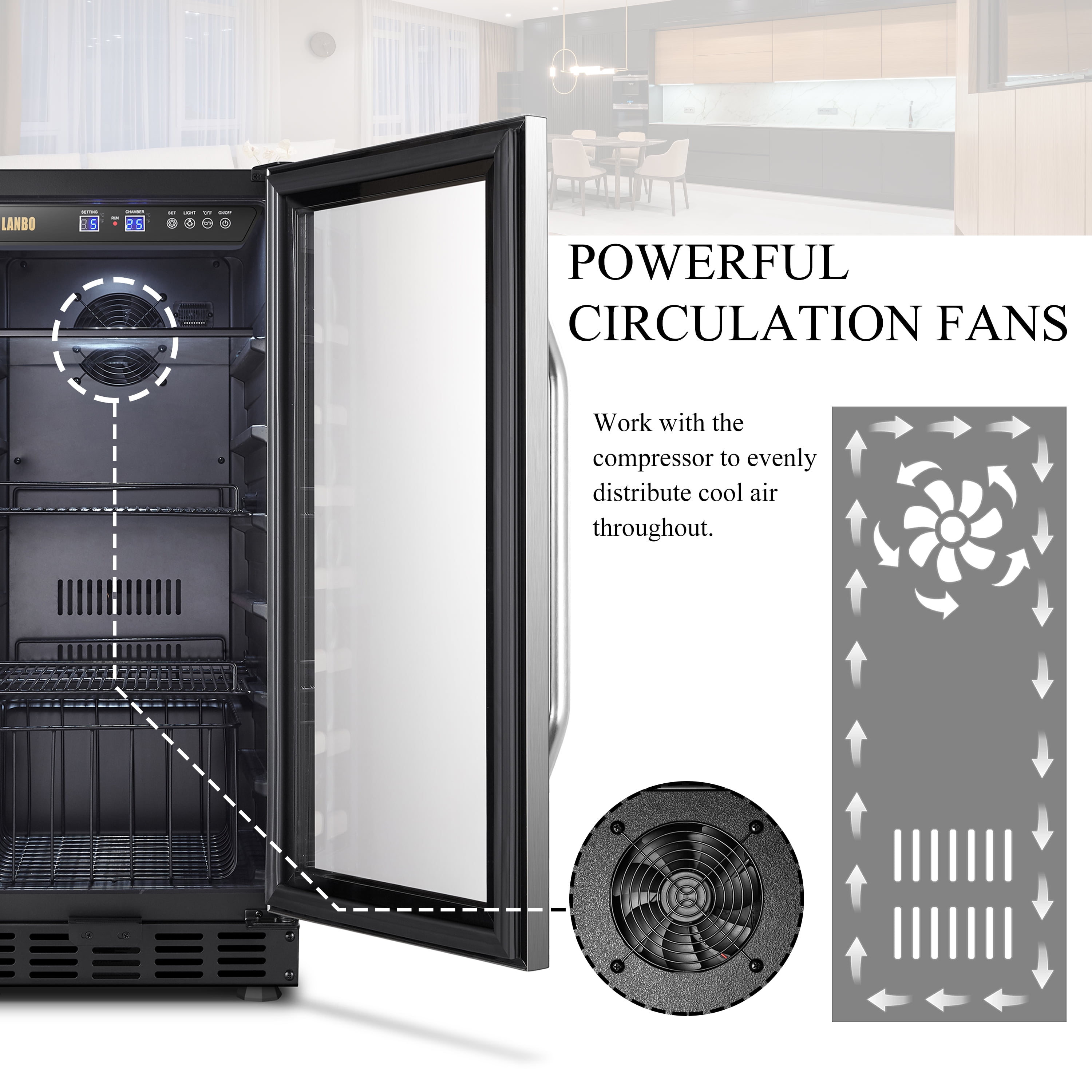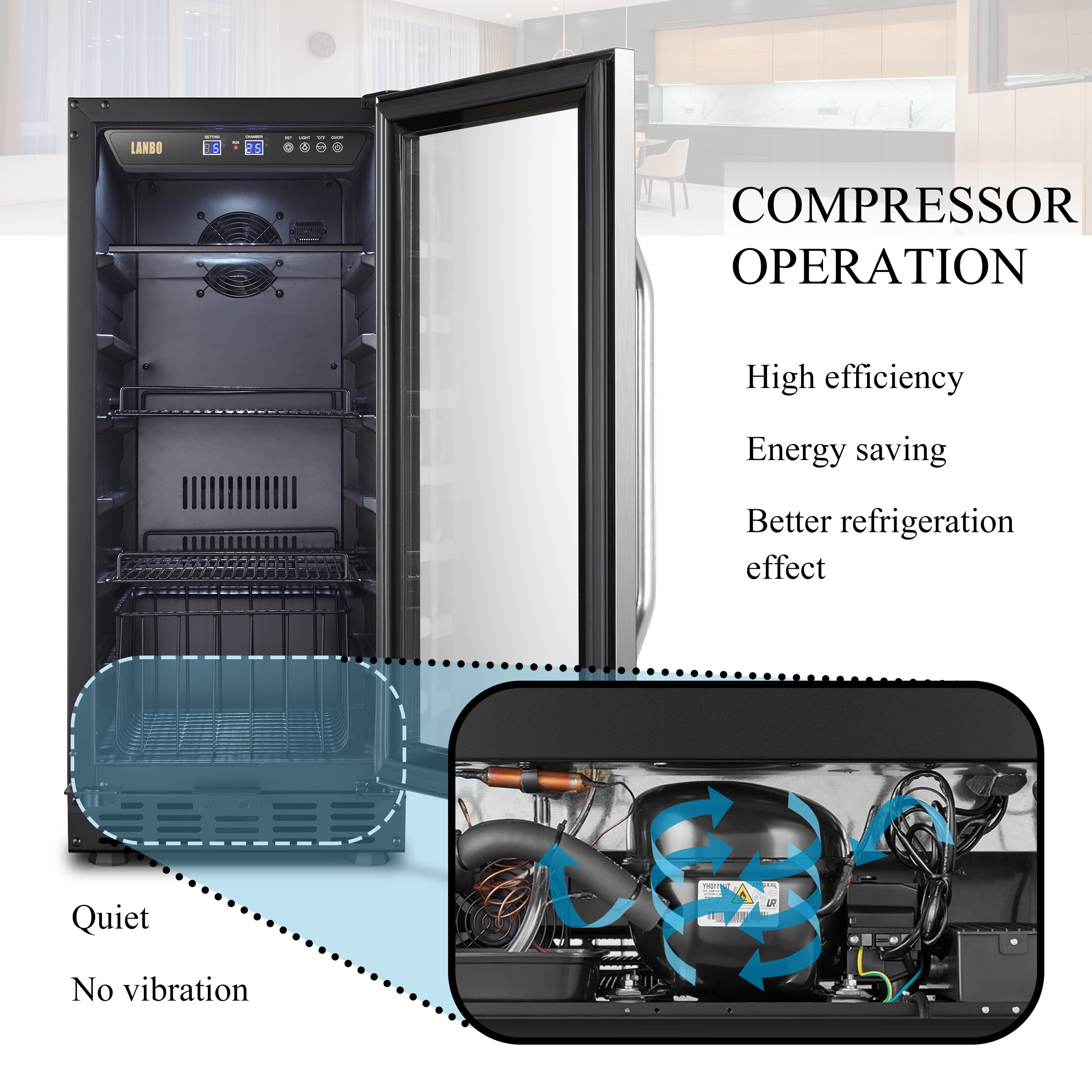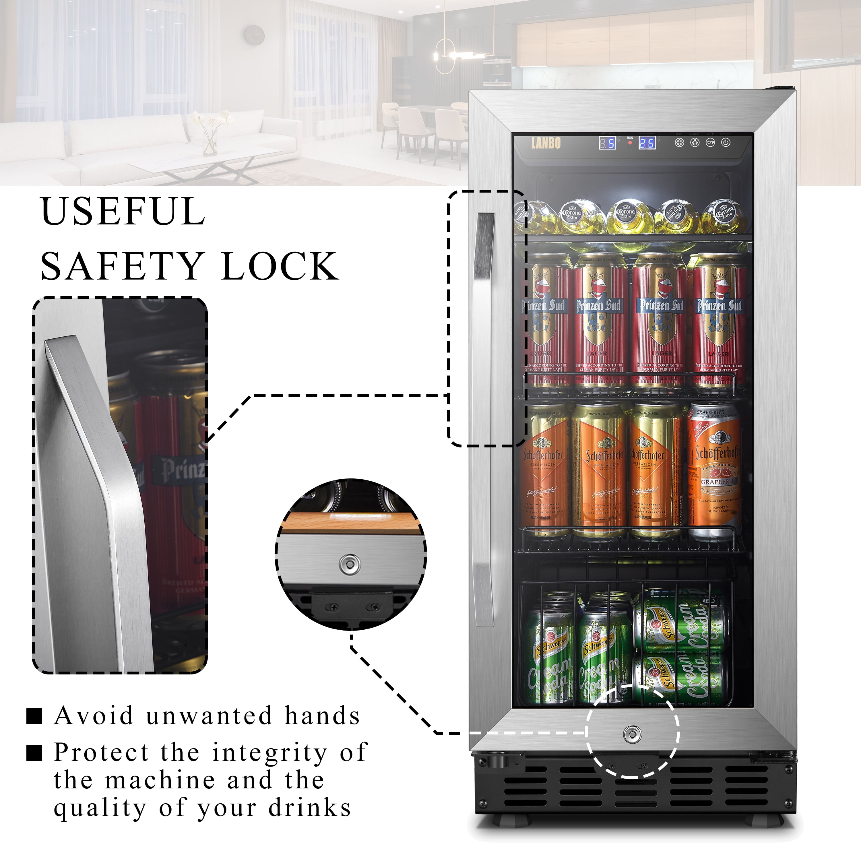 The Lanbo LB80BC beverage cooler refrigerator allows you to enjoy a refreshing glass of wine or favorite beverage in the convenience of your own home. Powerful Cooling System: You’ll never worry about the uneven cooling with this 15 inch built-in beverage cooler due to its powerful compressor cooling system, which ensures evenly distribute cool air throughout and keep your collection in an ideal and constant temperature environment. Fan-Forced Internal Circulation System: To prevents uneven temperature distribution as is often produced by plate-cooled units, ensuring all of your wine reaches your desired temperature and does so quickly.refrigerator can accommodate up to 76 cans of soda and beer. Built-in or Freestanding: This beverage center is designed with versatility in mind and can be installed freestanding or built-in. Include ventilation space: You’ll need minimum clearances of 2 inches from the back wall, 1 inch from the upper cabinet, and 1/8 inch on either side of the fridge. Digital Control: Smart digital touch screen control gives you a clear read out to control the temperature to your desire. Elegant Design: Featured with tinted glass door design and stainless-steel trim, it is sure to complement any contemporary home décor. Preservation Glass: Dual-paned tempered glass doors protect your collection from any harmful outside influence. Safety Lock: An integrated parental lock to keep your favorite beverage out of the wrong hands. Durable Shelves: It equipped with one glass shelf, two wire shelves and one wire basket. A myriad of shelf positions allows for the storage of beer and wine, as well as tall cans. Storage Capacity: At 2.8 cubic feet, this beverage refrigerator can accommodate up to 76 cans of soda and beer. Interior Light: The white LED interior lighting provides a unique look and makes it easy to find what will quench your thirst. Clever Choice: Whatever your needs may be, this unit is second to none when it comes to keeping your drinks as cool and refreshing as they can be.