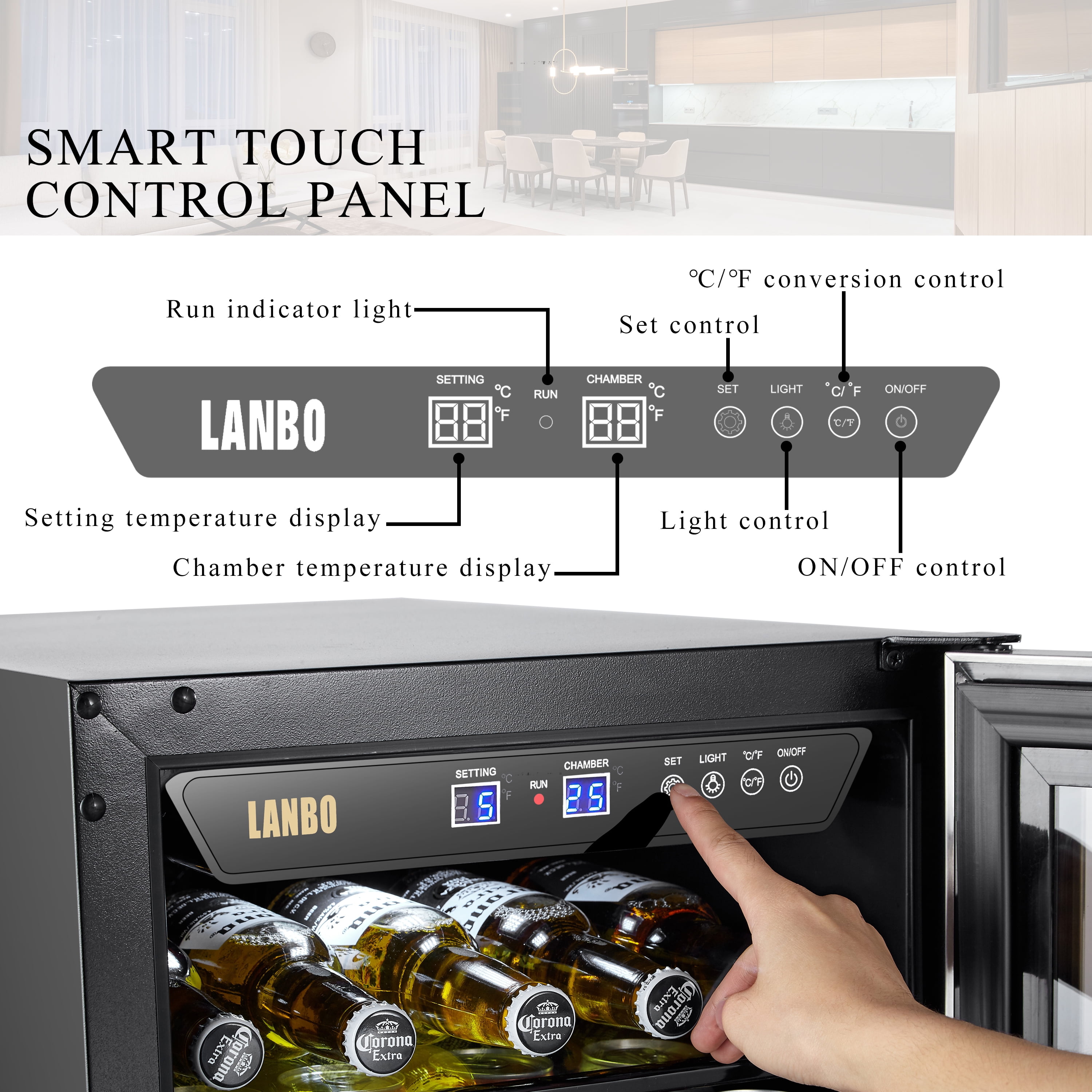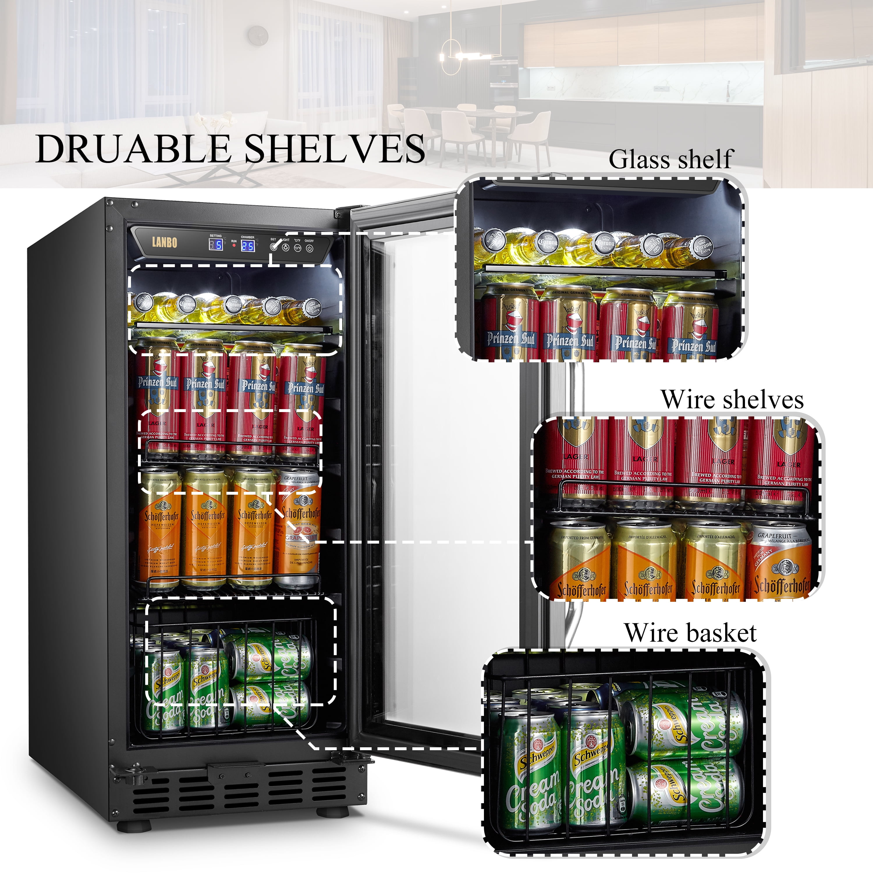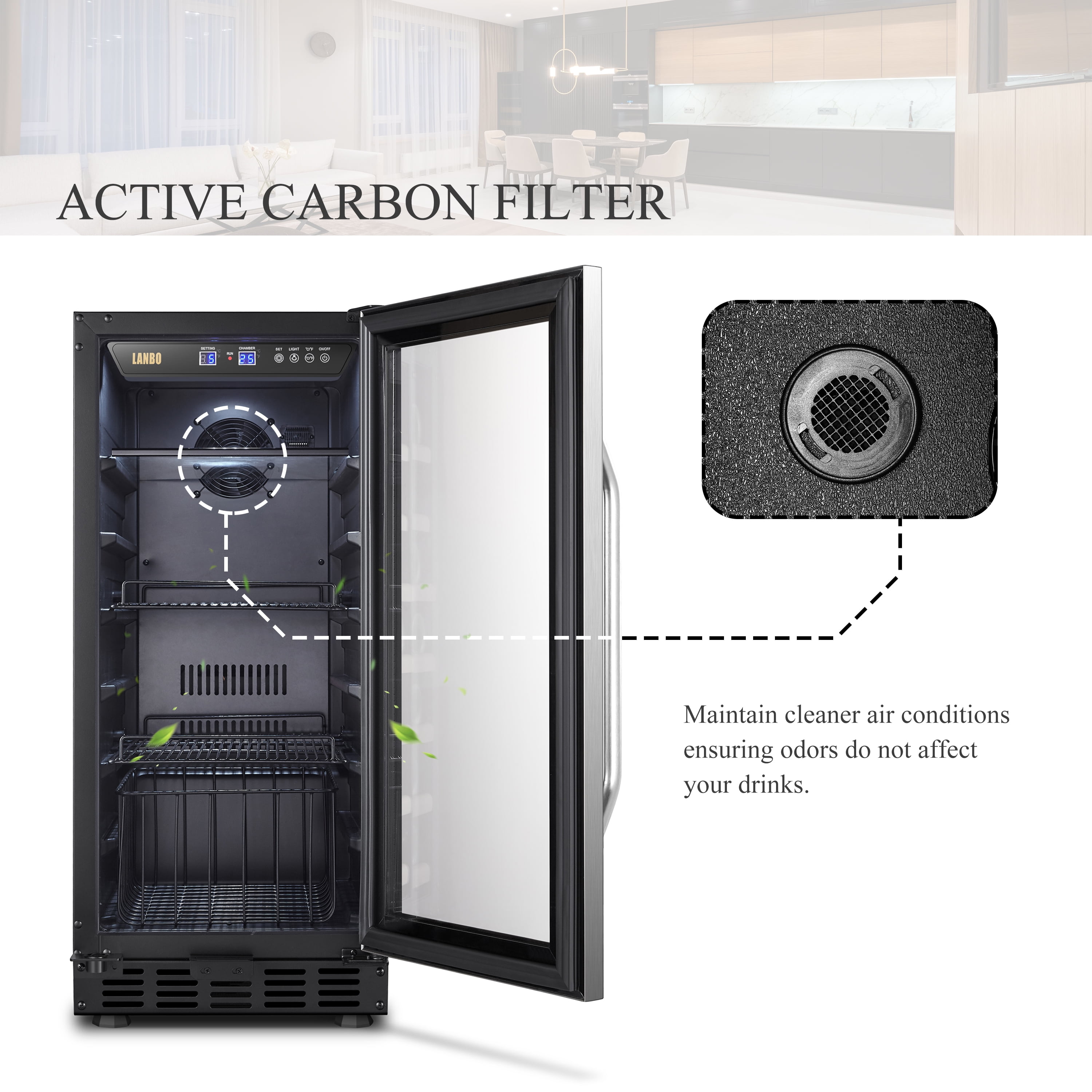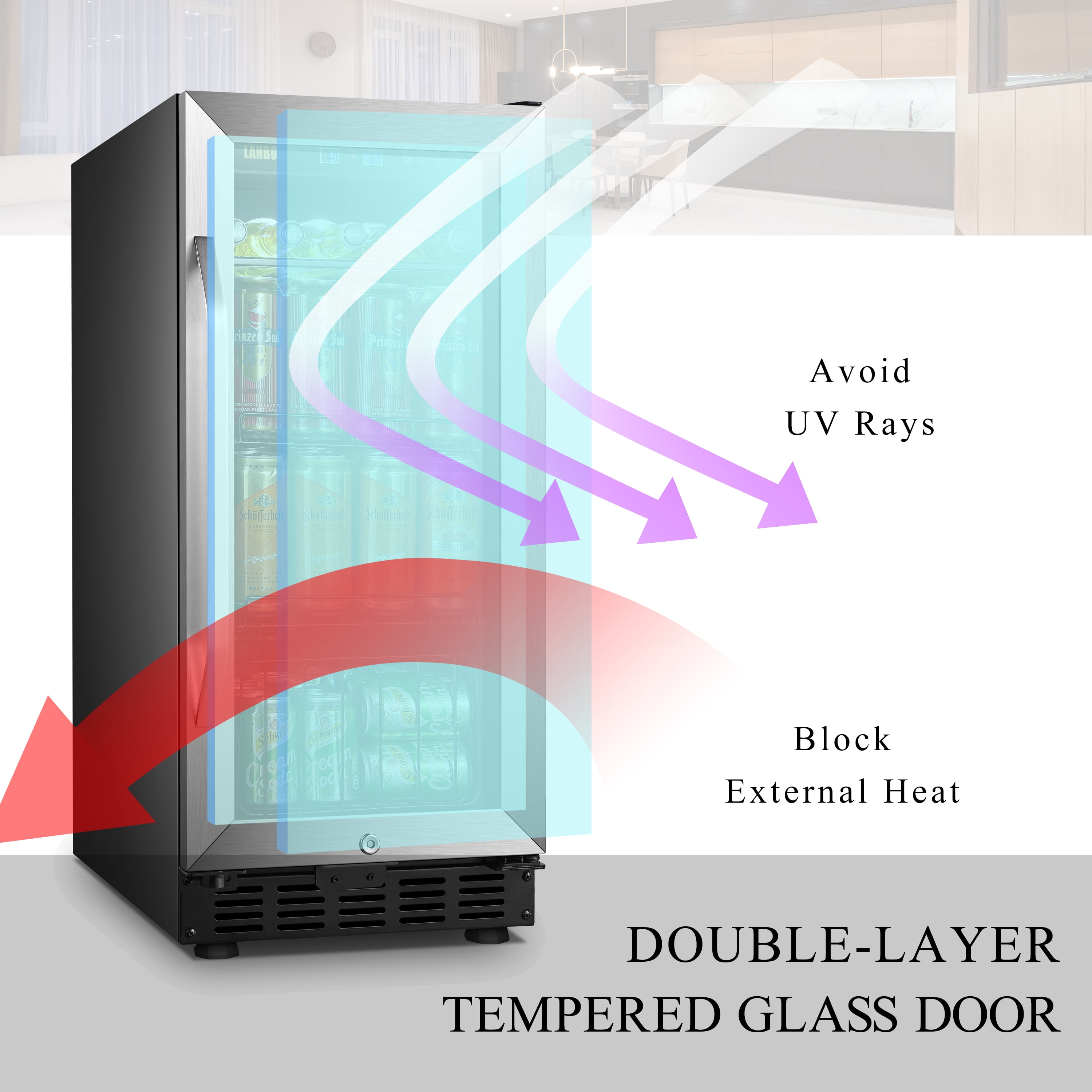 The Lanbo LB80BC beverage cooler refrigerator allows you to enjoy a refreshing glass of wine or favorite beverage in the convenience of your own home. Powerful Cooling System: You’ll never worry about the uneven cooling with this 15 inch built-in beverage cooler due to its powerful compressor cooling system, which ensures evenly distribute cool air throughout and keep your collection in an ideal and constant temperature environment. Fan-Forced Internal Circulation System: To prevents uneven temperature distribution as is often produced by plate-cooled units, ensuring all of your wine reaches your desired temperature and does so quickly.refrigerator can accommodate up to 76 cans of soda and beer. Built-in or Freestanding: This beverage center is designed with versatility in mind and can be installed freestanding or built-in. Include ventilation space: You’ll need minimum clearances of 2 inches from the back wall, 1 inch from the upper cabinet, and 1/8 inch on either side of the fridge. Digital Control: Smart digital touch screen control gives you a clear read out to control the temperature to your desire. Elegant Design: Featured with tinted glass door design and stainless-steel trim, it is sure to complement any contemporary home décor. Preservation Glass: Dual-paned tempered glass doors protect your collection from any harmful outside influence. Safety Lock: An integrated parental lock to keep your favorite beverage out of the wrong hands. Durable Shelves: It equipped with one glass shelf, two wire shelves and one wire basket. A myriad of shelf positions allows for the storage of beer and wine, as well as tall cans. Storage Capacity: At 2.8 cubic feet, this beverage refrigerator can accommodate up to 76 cans of soda and beer. Interior Light: The white LED interior lighting provides a unique look and makes it easy to find what will quench your thirst. Clever Choice: Whatever your needs may be, this unit is second to none when it comes to keeping your drinks as cool and refreshing as they can be.