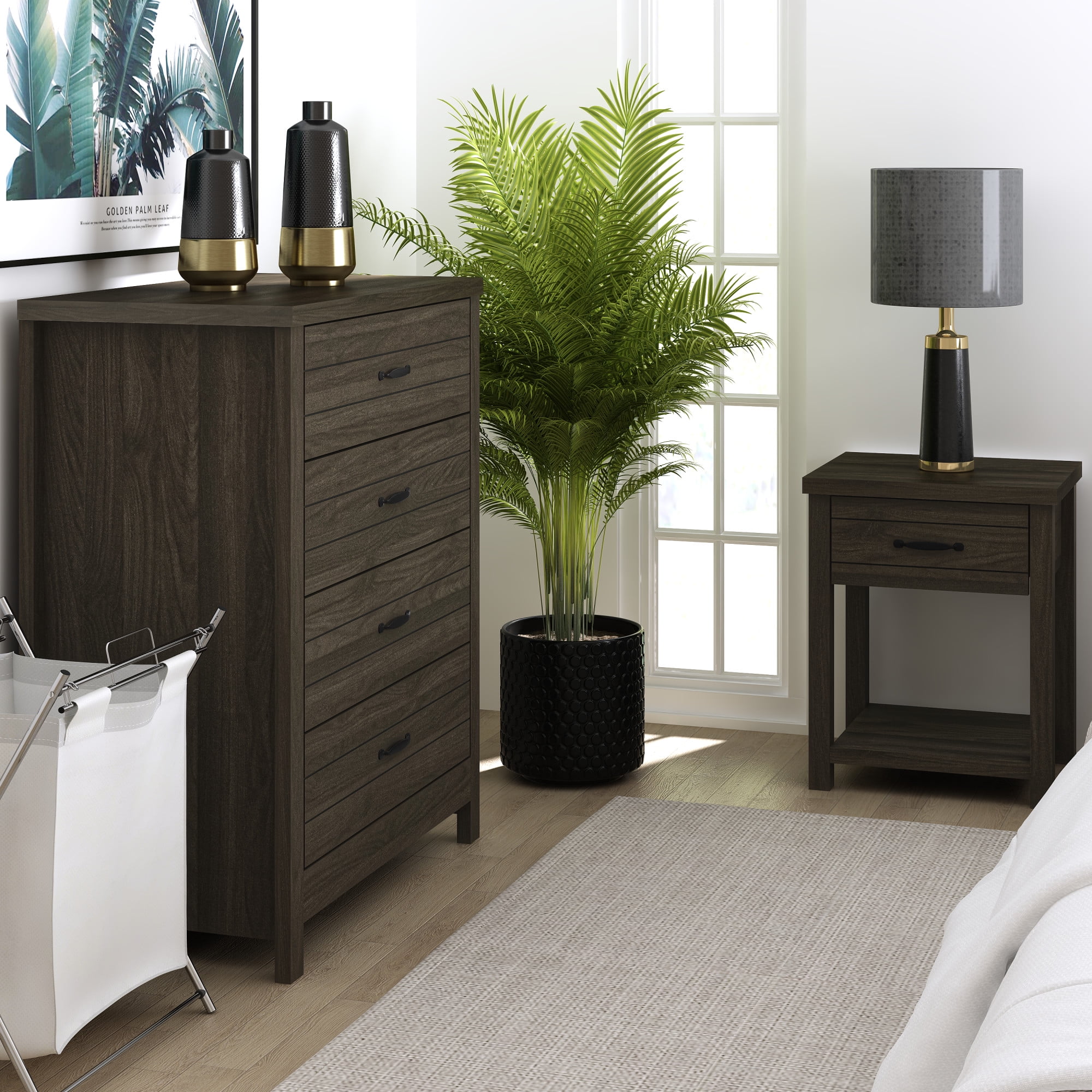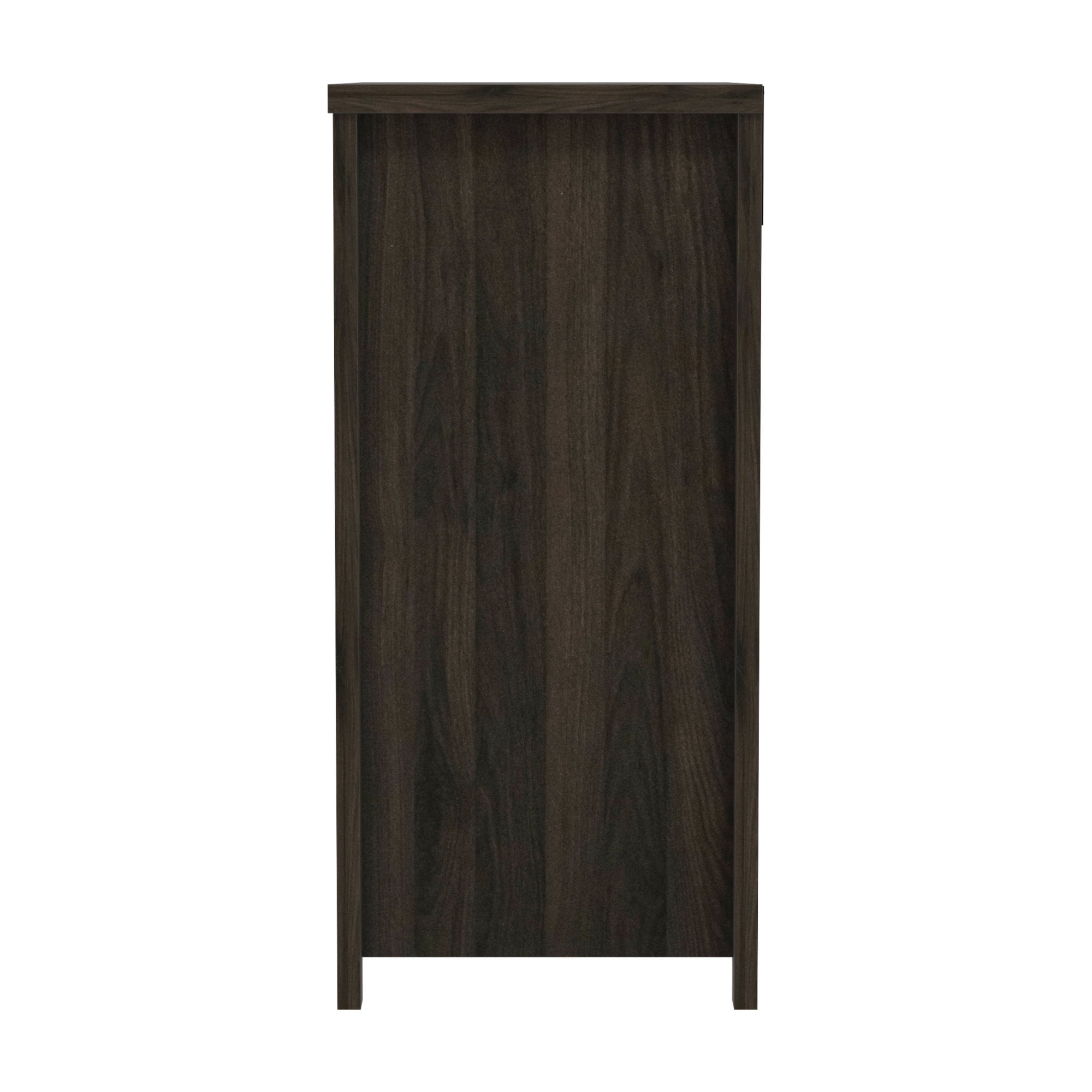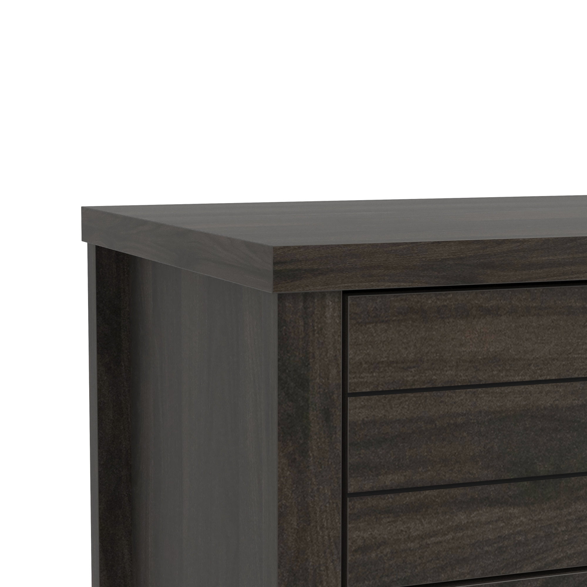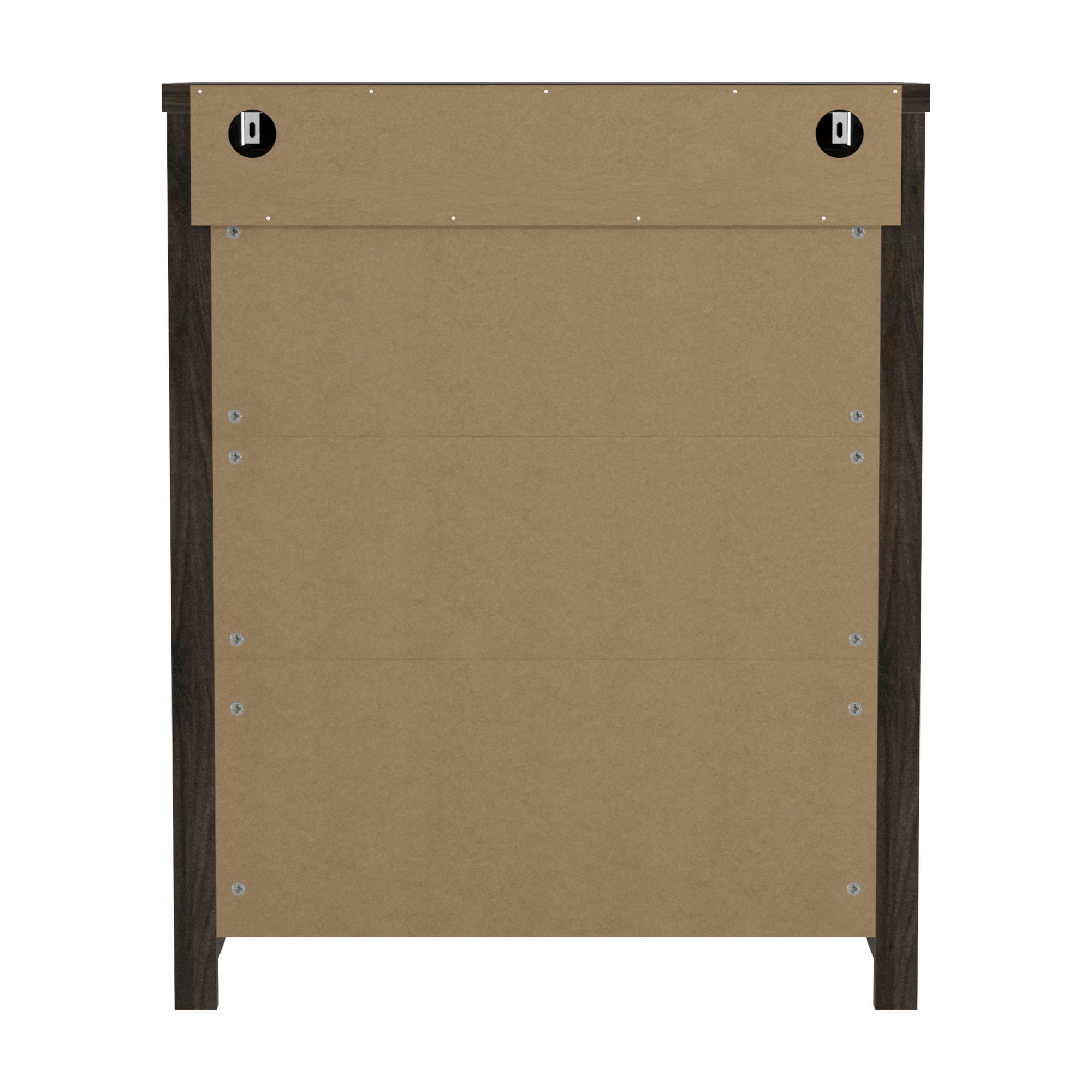 Dark Espresso finish with oak top and black metal drawer handles Crafted of composite wood and MDF Durable metal guides Overall Dimensions: 38.5H X 31.25W X 18D Durable metal guides Spot or wipe clean This adult dresser is for residential use Item will ship in one box Complies with current “Standard Safety Specification for Clothing Storage Units”; Includes anti-tip hardware for added safety 90-Day Limited Warranty