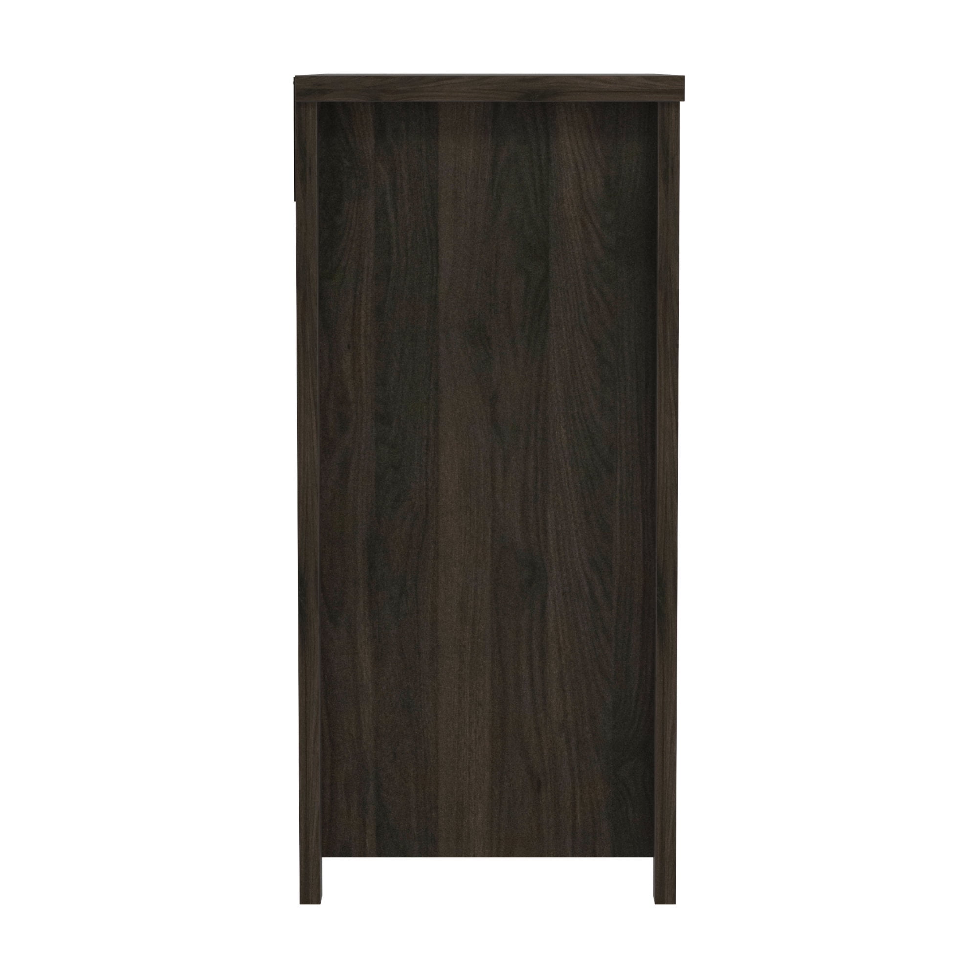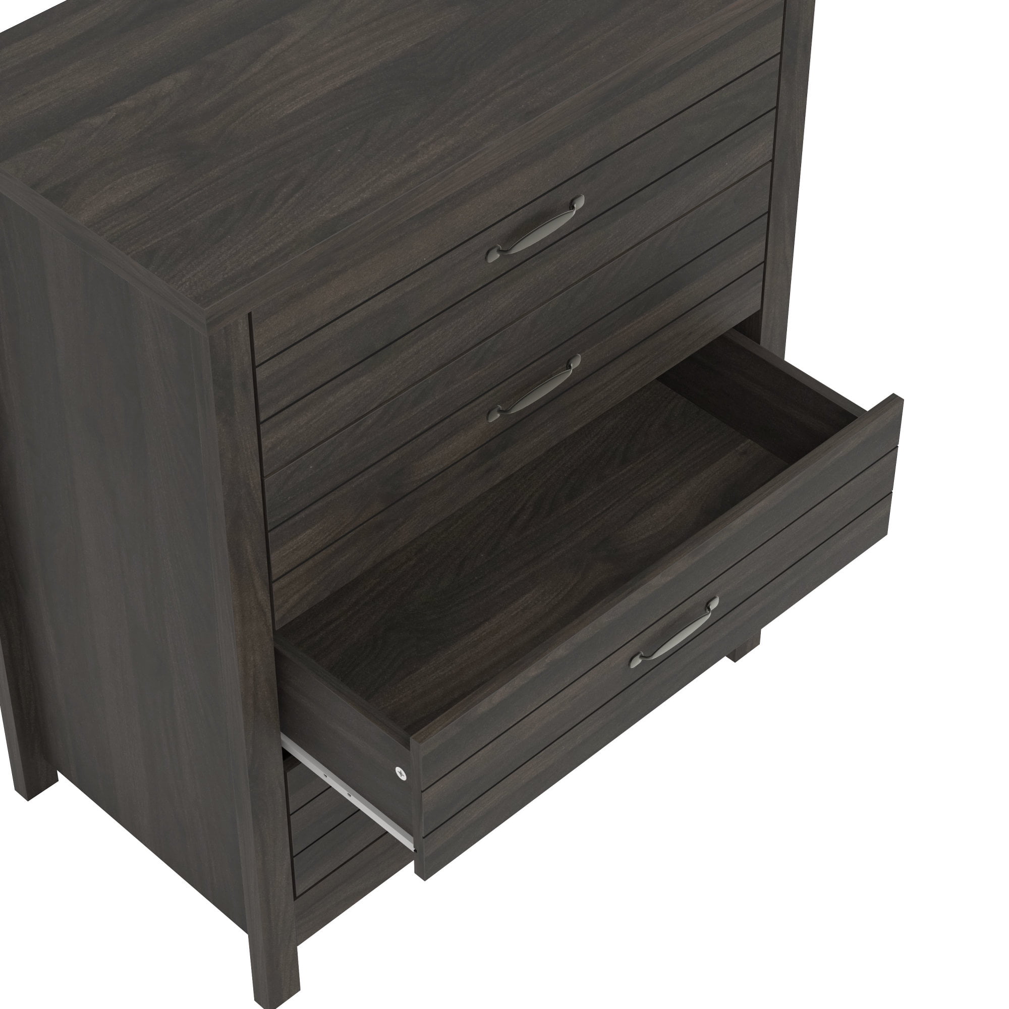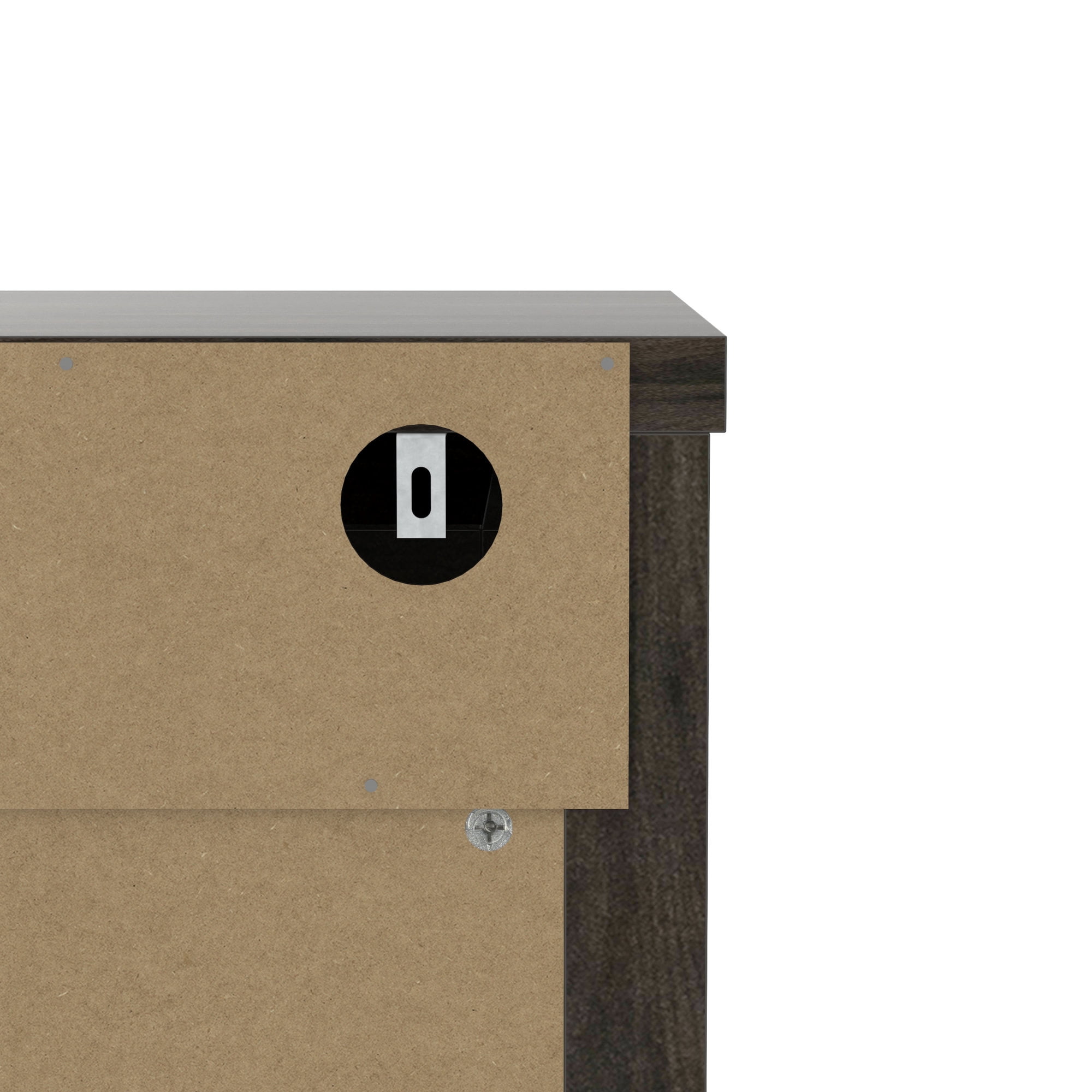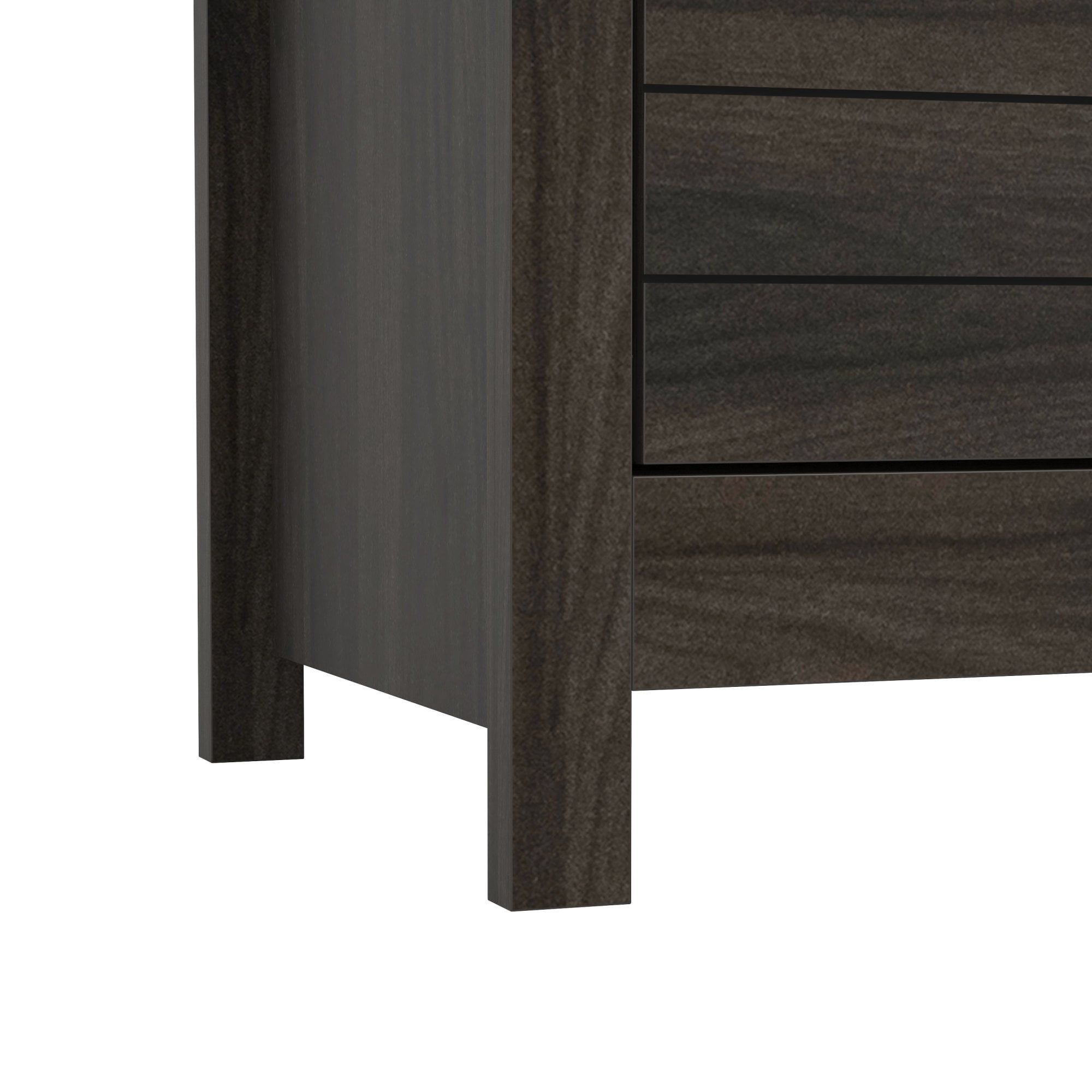 Dark Espresso finish with oak top and black metal drawer handles Crafted of composite wood and MDF Durable metal guides Overall Dimensions: 38.5H X 31.25W X 18D Durable metal guides Spot or wipe clean This adult dresser is for residential use Item will ship in one box Complies with current “Standard Safety Specification for Clothing Storage Units”; Includes anti-tip hardware for added safety 90-Day Limited Warranty