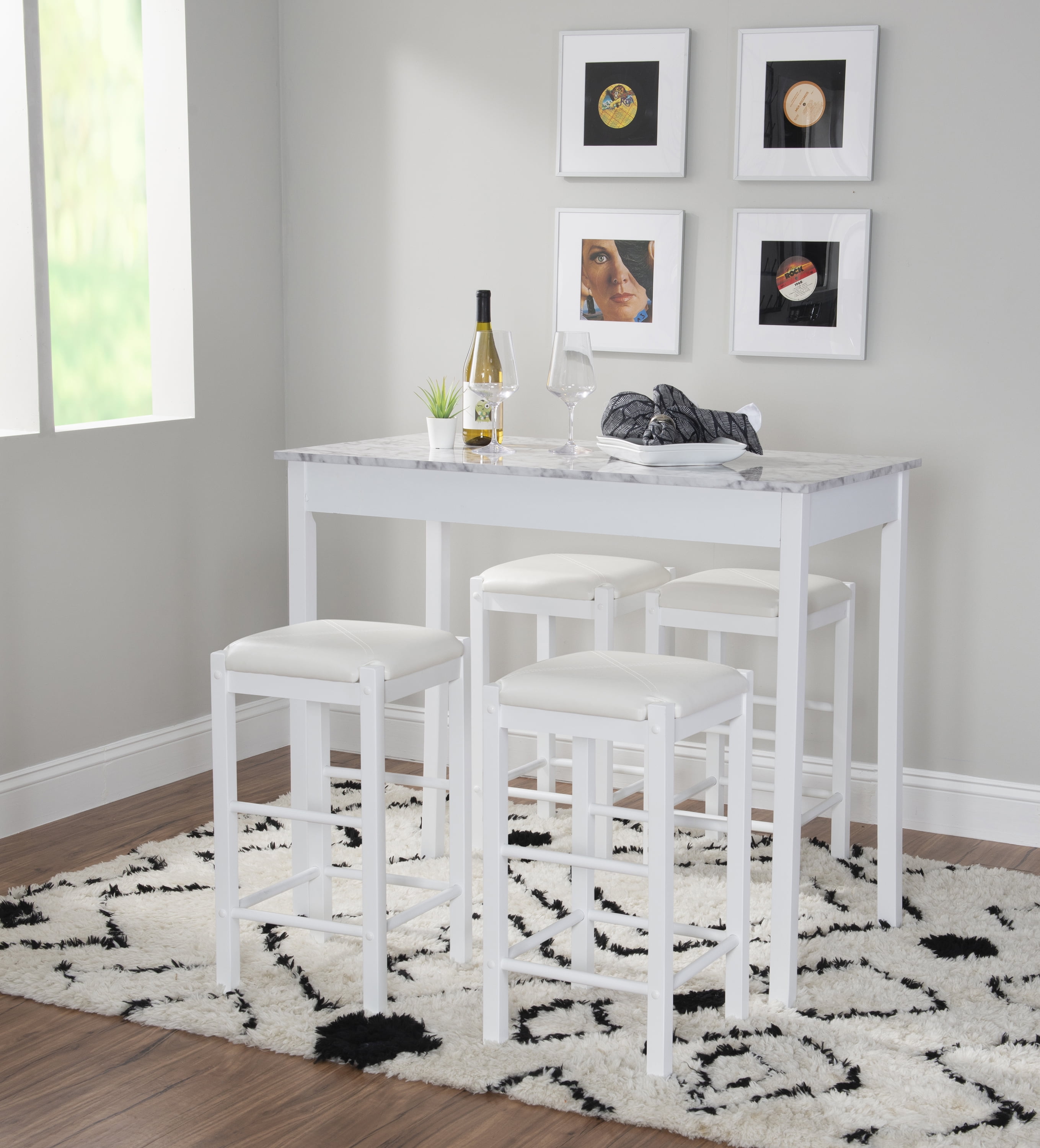Linon Lancer 3 Piece Tavern Set, White Space saving design for small space living Multi step white finish process applied to wood base and legs Counter height table is 36 inches from floor to top Faux stone paper wrapped top; faux leather seats Stools – 13.75” x 13.75” x 24” Seat Dimensions: 13.75″ w x 13.75″ d Table dimensions: 42″ w x 22″ d x 36″ h Weight capacity: Stools 275 lbs; table 100 lbs Ships in one box