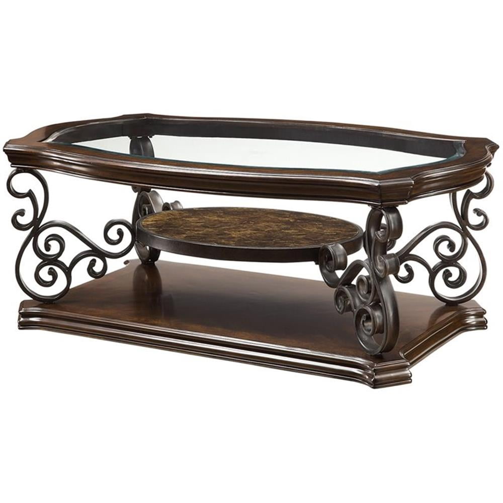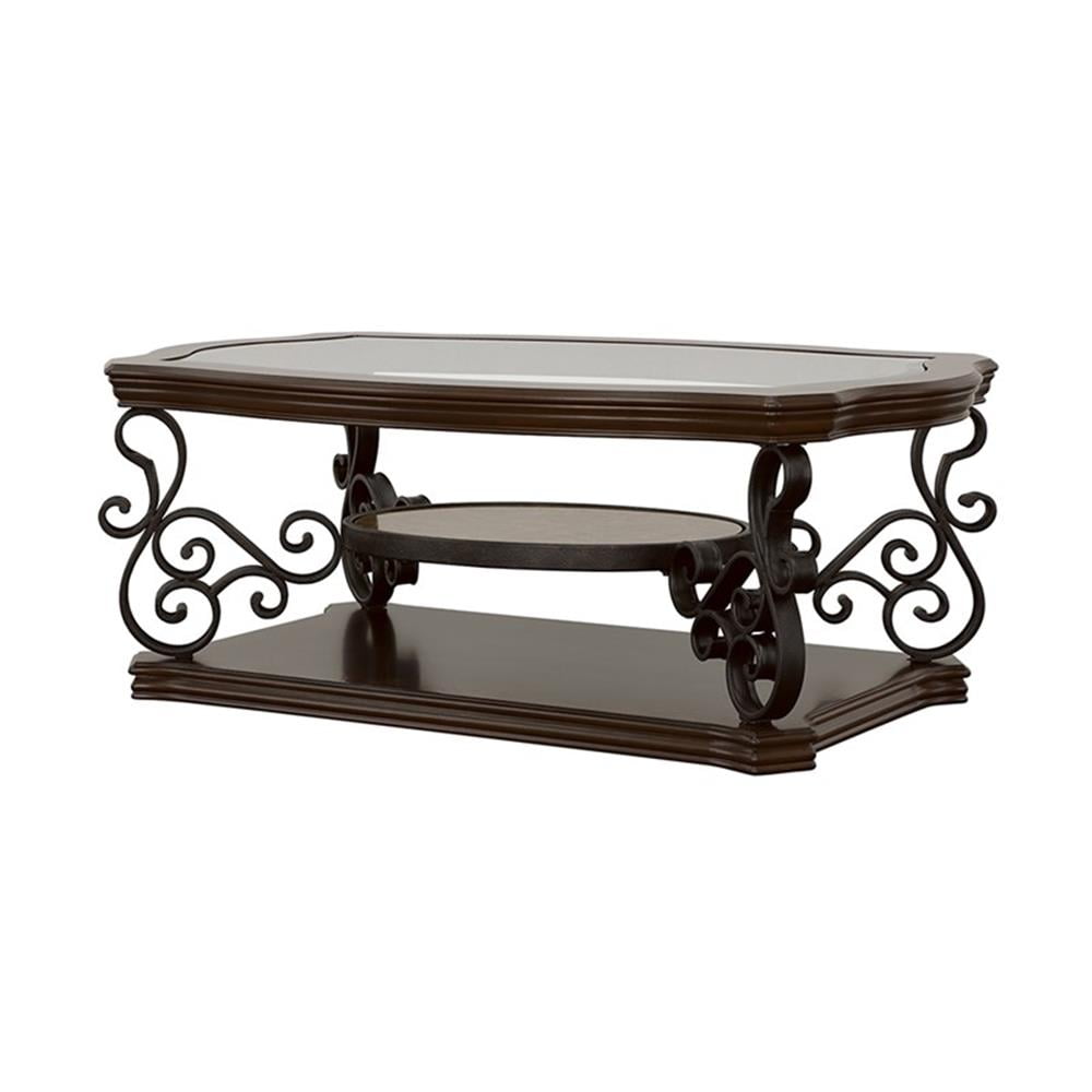 Includes: One (1) Coffee Table Materials: Glass, Medium Density Fiberboard (MDF), Cherry Veneer Finish: Dark Merlot Classically beautiful traditional style occasional set Ornate metal scrollwork Elegant beveled wood edges Durable tempered glass table tops All pieces feature two convenient storage shelves Leveler/ plastic glide: Base leveler Table top edge profile: Router edge deep Shape: Rectangular Type of Storage: Bottom Storage Shelves