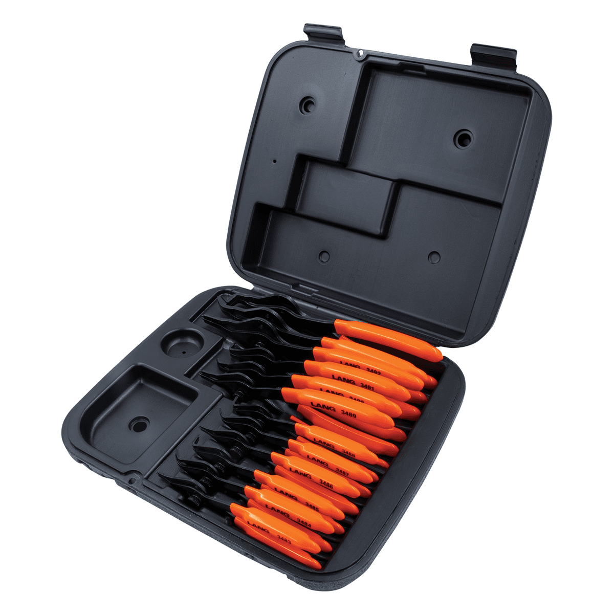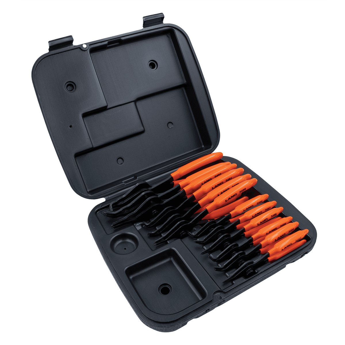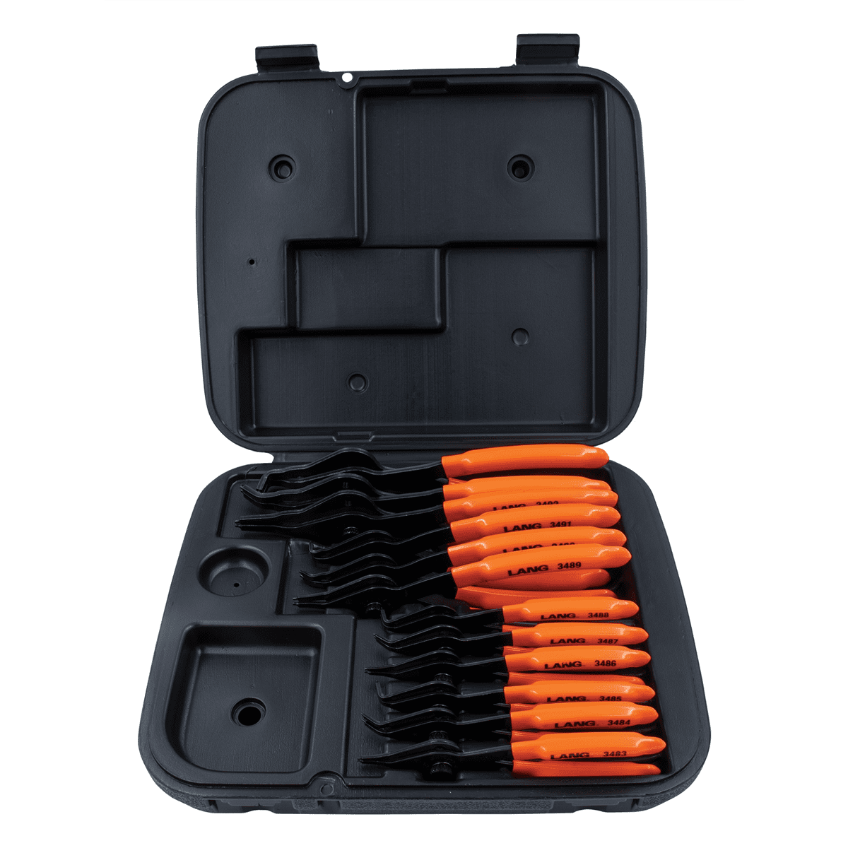 Lang represents hand tools that professional technicians and handymen have used for 80 years, which assures that you are dealing with performance proven, consumer preferred, professional high quality products. Pliers are convertible for use on internal and external snap rings with cushioned grip handles. They have a knurled center crew with a spring for easy changing and secure hold. Includes 0.38 in. Straight Combination Internal and External Retaining Ring Pliers 0.38 in. 450-Degree Combination Internal and External Retaining Ring Pliers 0.38 in. 900-Degree Combination Internal and External Retaining Ring Pliers 0.047 in. Straight Combination Internal and External Retaining Ring Pliers 0.047 in. 450-Degree Combination Internal and External Retaining Ring Pliers 0.047 in. 900-Degree Combination Internal and External Retaining Ring Pliers 0.07 in. Straight Combination Internal and External Retaining Ring Pliers 0.07 in. 450-Degree Combination Internal and External Retaining Ring Pliers 0.07 in. 900-Degree Combination Internal and External Retaining Ring Pliers 0.09 in. Straight Combination Internal and External Retaining Ring Pliers 0.09 in. 450-Degree Combination Internal and External Retaining Ring Pliers 0.09 in. 900-Degree Combination Internal and External Retaining Ring Pliers Storage CaseSpecifications Degrees: 0 Deg. / 450 Deg. / 900 Deg. Jaw Length: 0.38 in. – 0.90 in. Overall Length: Assorted