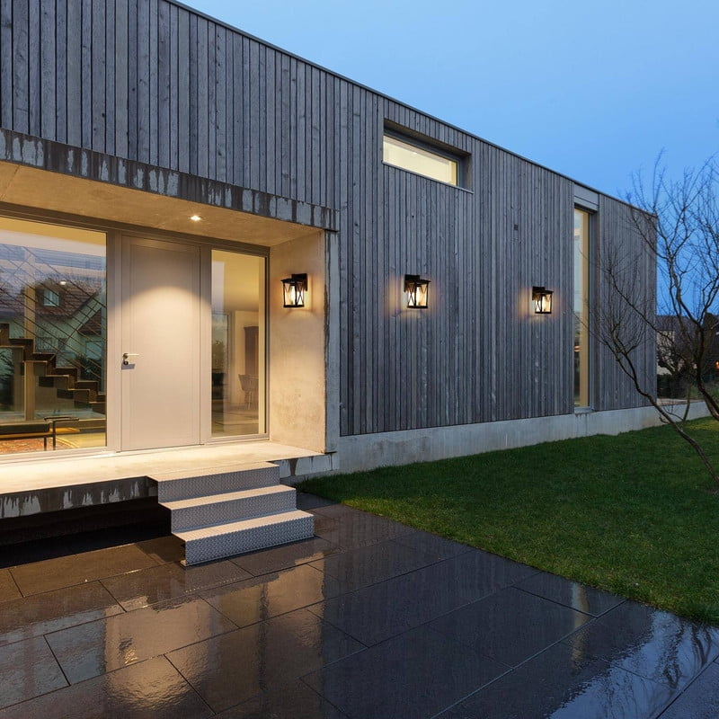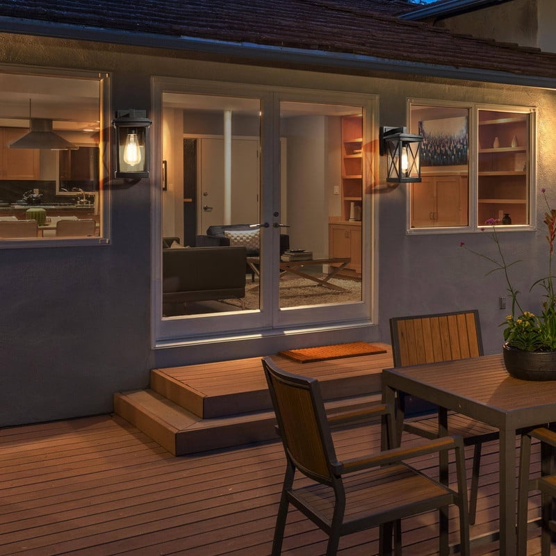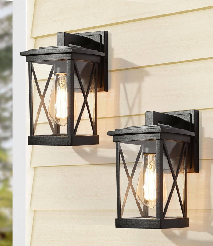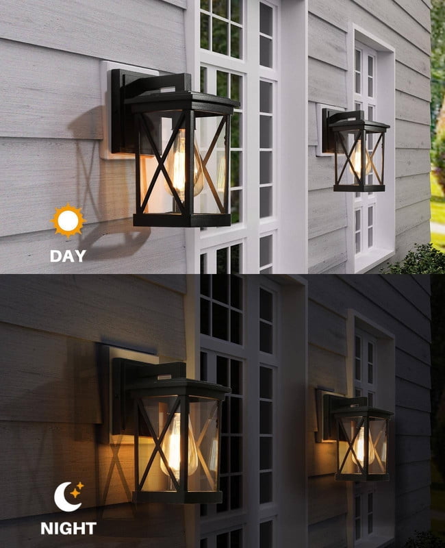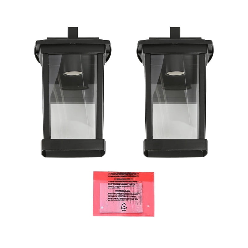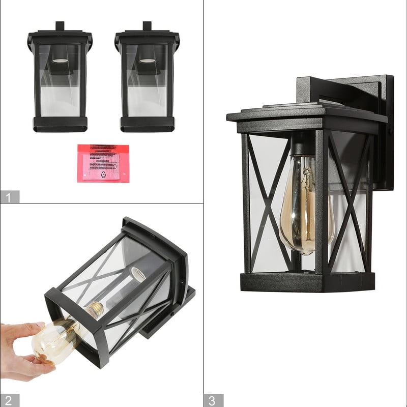 These 2 pack 1-light modern black outdoor wall sconces helps illuminate the way to your front or back door. It’s attached to a square metal backplate that comes in a sandy black finish for a bit of classical industrial flair. The open, clean-lined rectangular frame matches with the backplate and fixture for a modern look. It is rated for wet locations, so you’re able to install it to light up your driveway, an open-air front porch, or next to your garage. Features: 2-Pack modern outdoor wall sconces feature clear flat glass shade and sturdy metal frame with sandy black finish, the subtle sandy black hardware perfectly accents the clear glass shade, creating a stylish modern focus for your porch or patio Overall size: 6-in W x 7-in D x 11-in H, back plate size: 4.5-in W x 5.5-in H, search item #5075643 for single light when this is out of stock Indoor/outdoor compatible: weather/rust resistance and can be used in either dry or wet locations for open or direct exposure to sun, rain, snow, or water spray and is ideal for open porches, lanais, pergolas and more Bulb requirement: E26 medium base type A max 60 W LED or incandescent bulb, recommend item#1608339 (not included) Clear glass panels: clear flat glass panels that allowing a soft light to illuminate your walkway, evoke memories of the silhouettes and friendly shine of antique street lights guiding the way home along a dark, sleepy street Open bottom design for casting as much ambient light over a wide area and easy replace the bulb The glass were embedded to the frame when they were manufactured, avoiding glass-cracked during shipping, Aluminum alloy farme is good at strength and corrosion resistance Damp-rated, with one year quality warranty(free parts replacements when received broken pieces or missing parts) Easy to install: detailed instruction manual and all hardware included