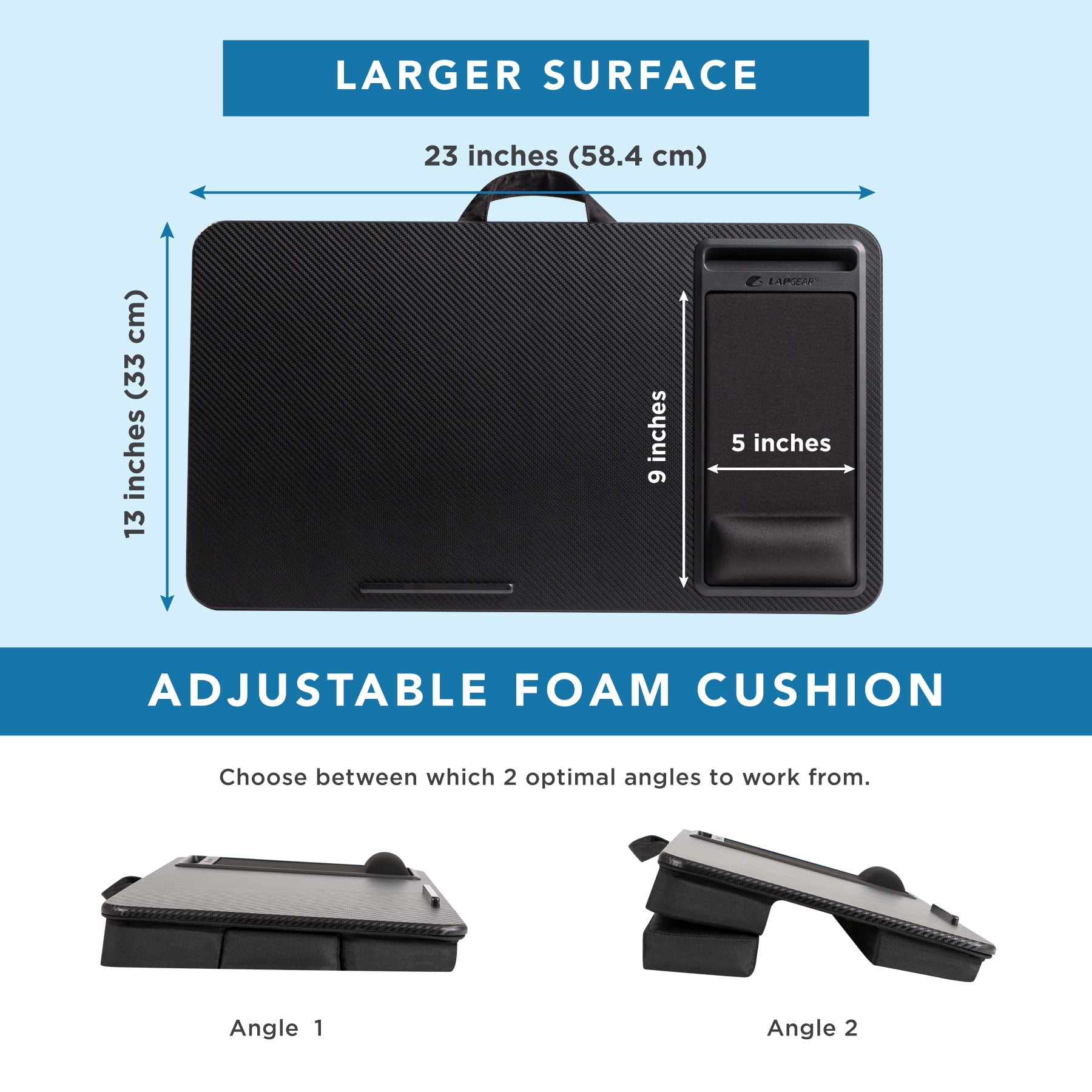23” x 13” surface fits up to 17.3” laptops Mousepad with wrist rest Cushion folds out to create an incline for added comfort and improved screen viewing angle while you work Phone slot holds your cell phone within reach while you work Device ledge to hold laptop in place Smooth, flat surface allows for proper laptop ventilation