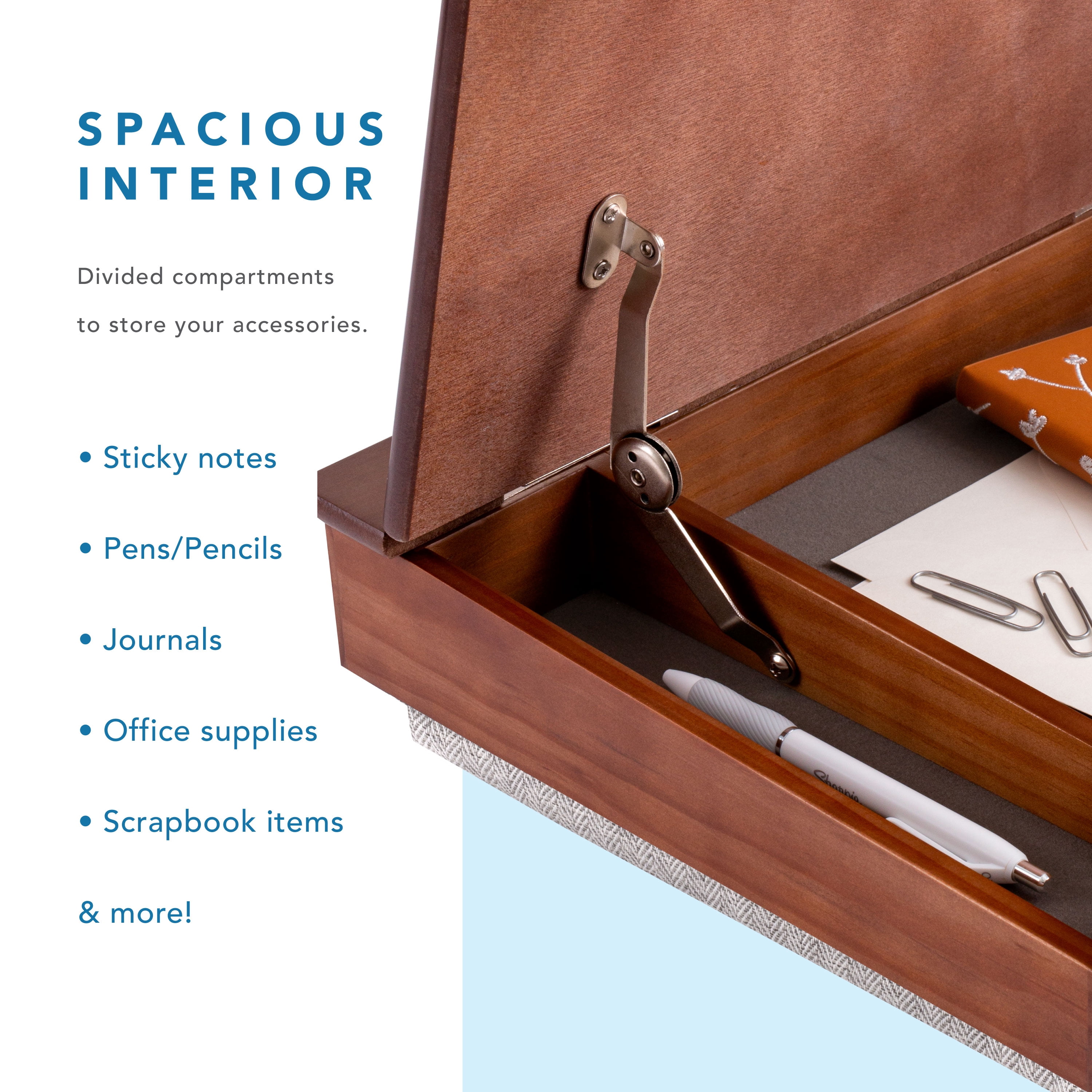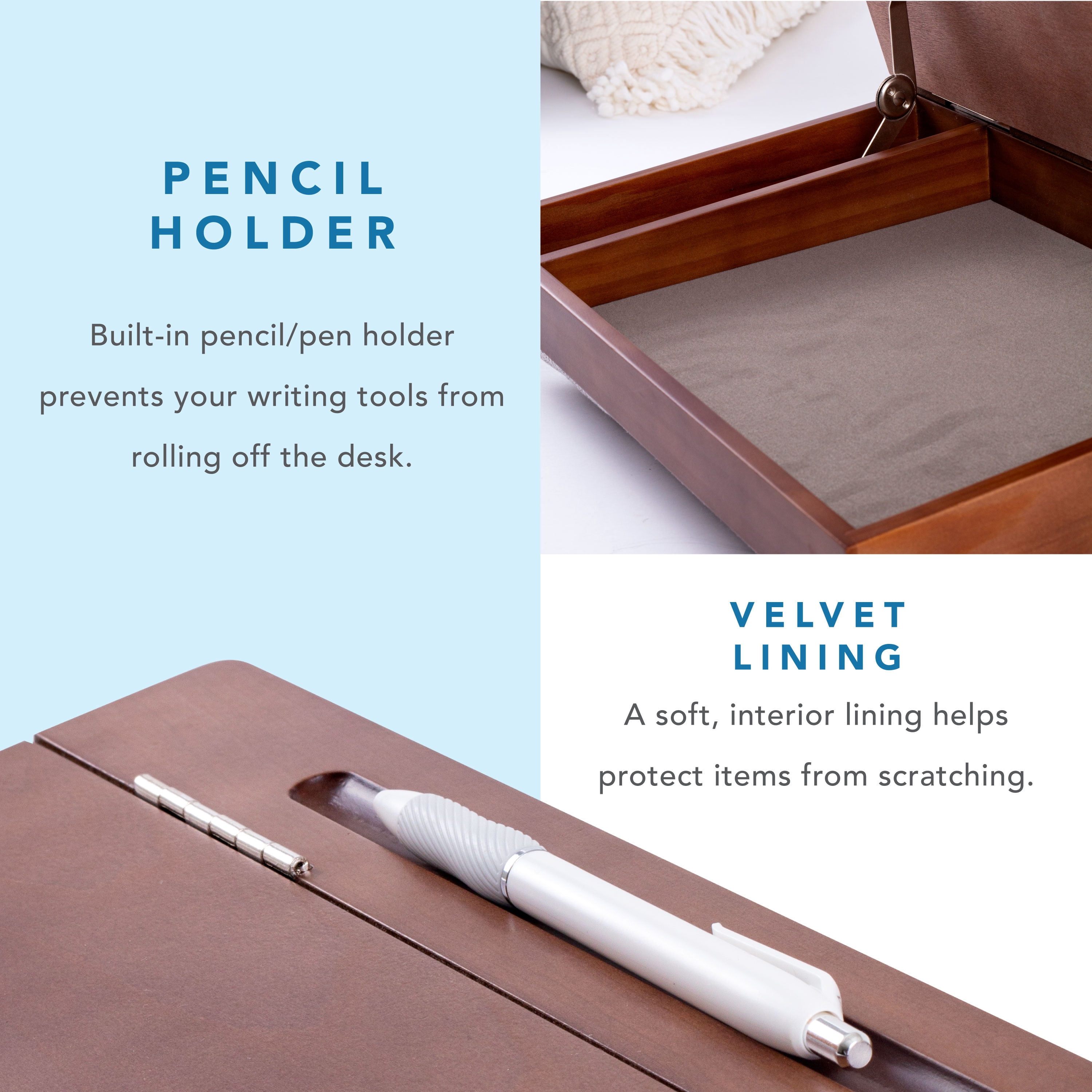The hardwood surface of the School House Lap Desk measures 15.6 inches wide by 12.2 inches deep. It’s just the right size for laptops up to 15.6 inches, tablets, and notebooks of all kinds. We offer two types of wood surfaces for this lap desk. Choose the lighter Natural Acacia Wood or the darker Java Basswood. Both have beautiful woodgrain and make great writing surfaces. The easy-to-lift lid reveals two 1.5-inch deep storage compartments measuring 9.75 x 2.25 inches and 9.75 x 11.5 inches. You’ll have plenty of space for anything from computer cords to sketchbooks and styluses to paint brushes. The clean lines of the lap desk give it a vintage look that’s accented by a built-in pencil well on the lid and a shiny, decorative gold hinge when you lift the top. The inside is lined with soft, velvety fabric that complements the wood tones. The lap cushion on the School House Lap Desk is comfortable and covered in a durable, neutral herringbone fabric. The subtle pattern on the fabric accentuates the schoolhouse feel of this special lap desk design.