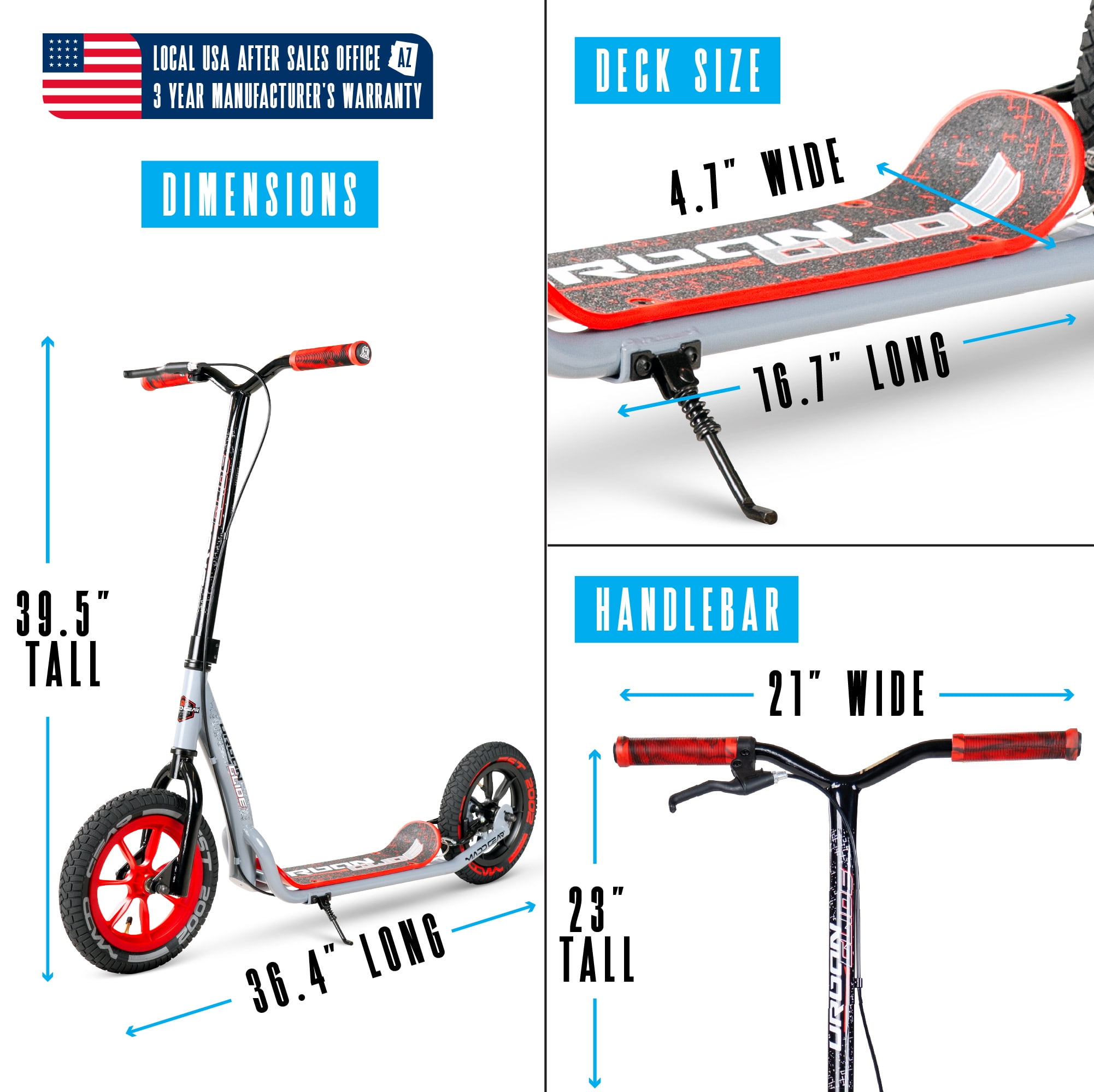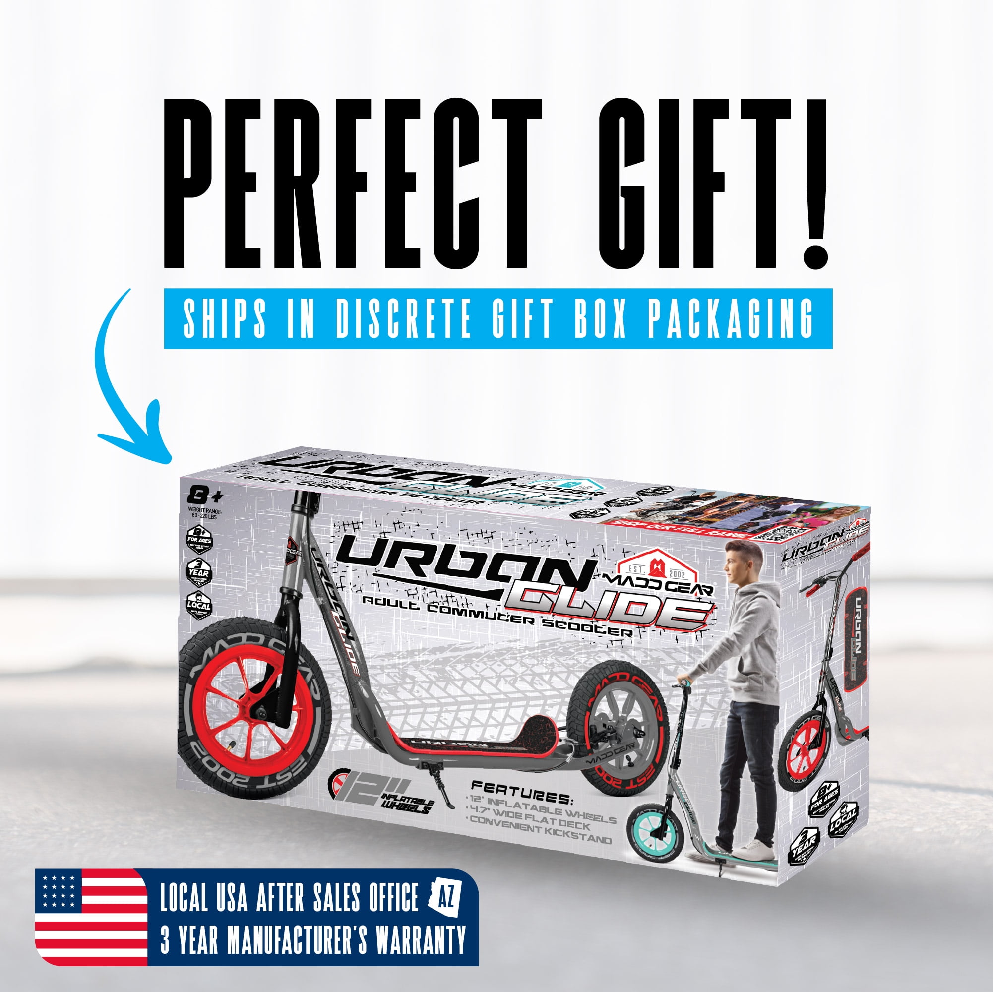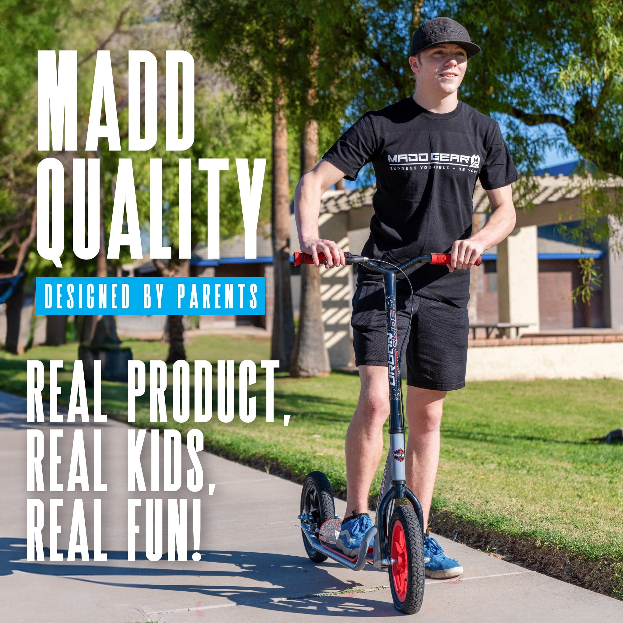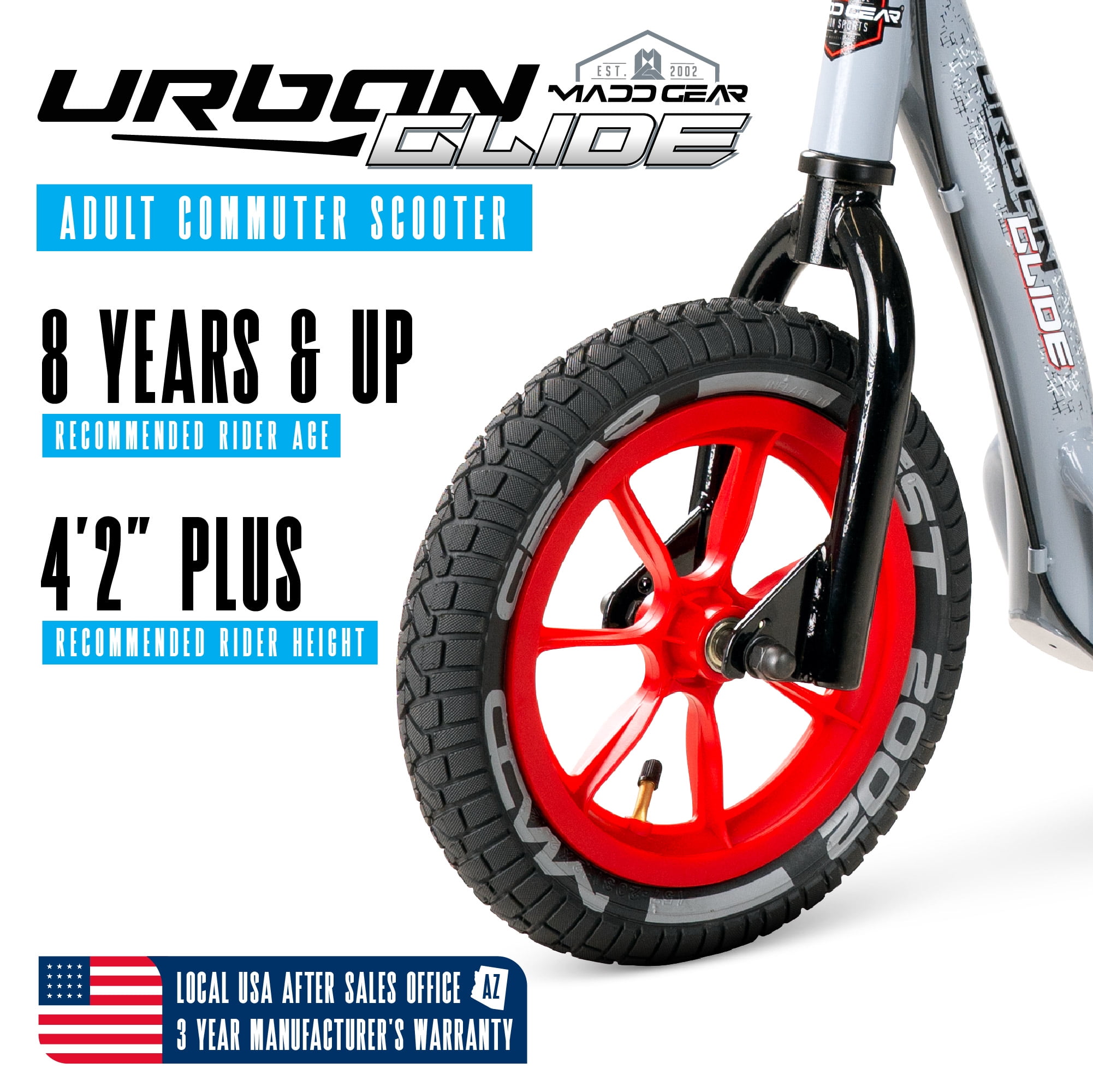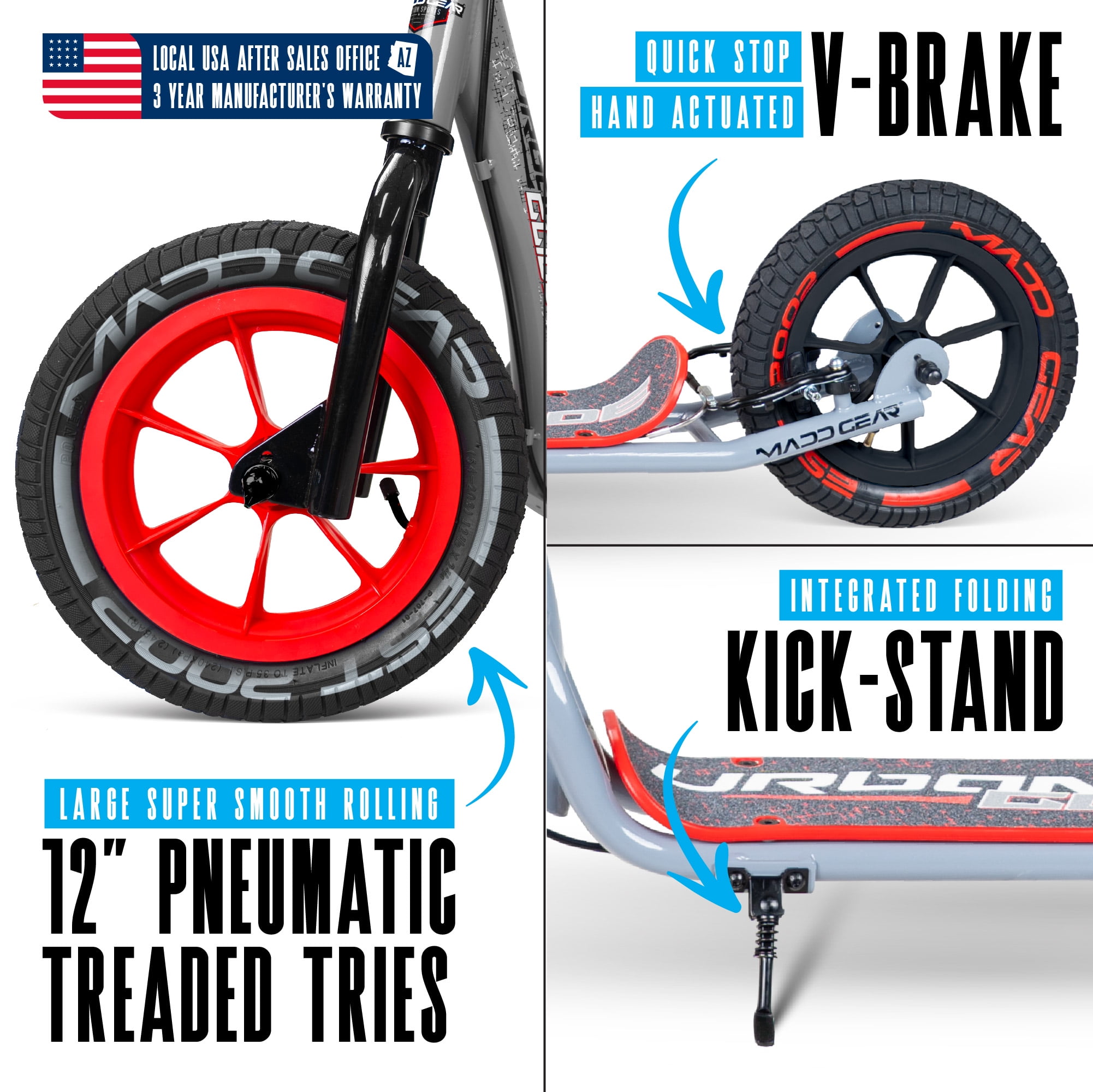 Large Kick Scooter for Adults & Teens – 12″ Air-Filled Tires, Wide Deck, Handbrake, Kickstand – Madd Gear Urban Glide – Grey / Red