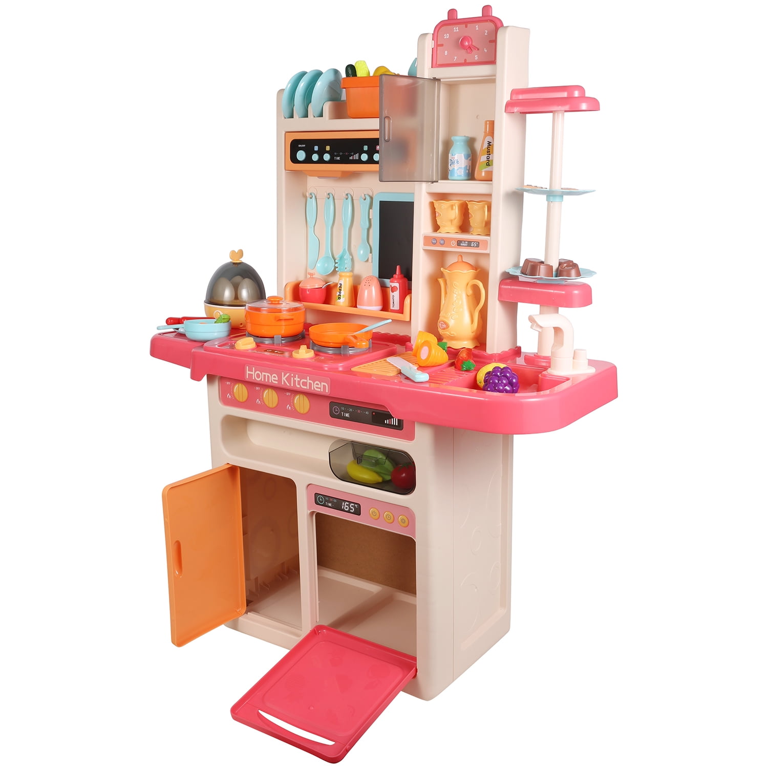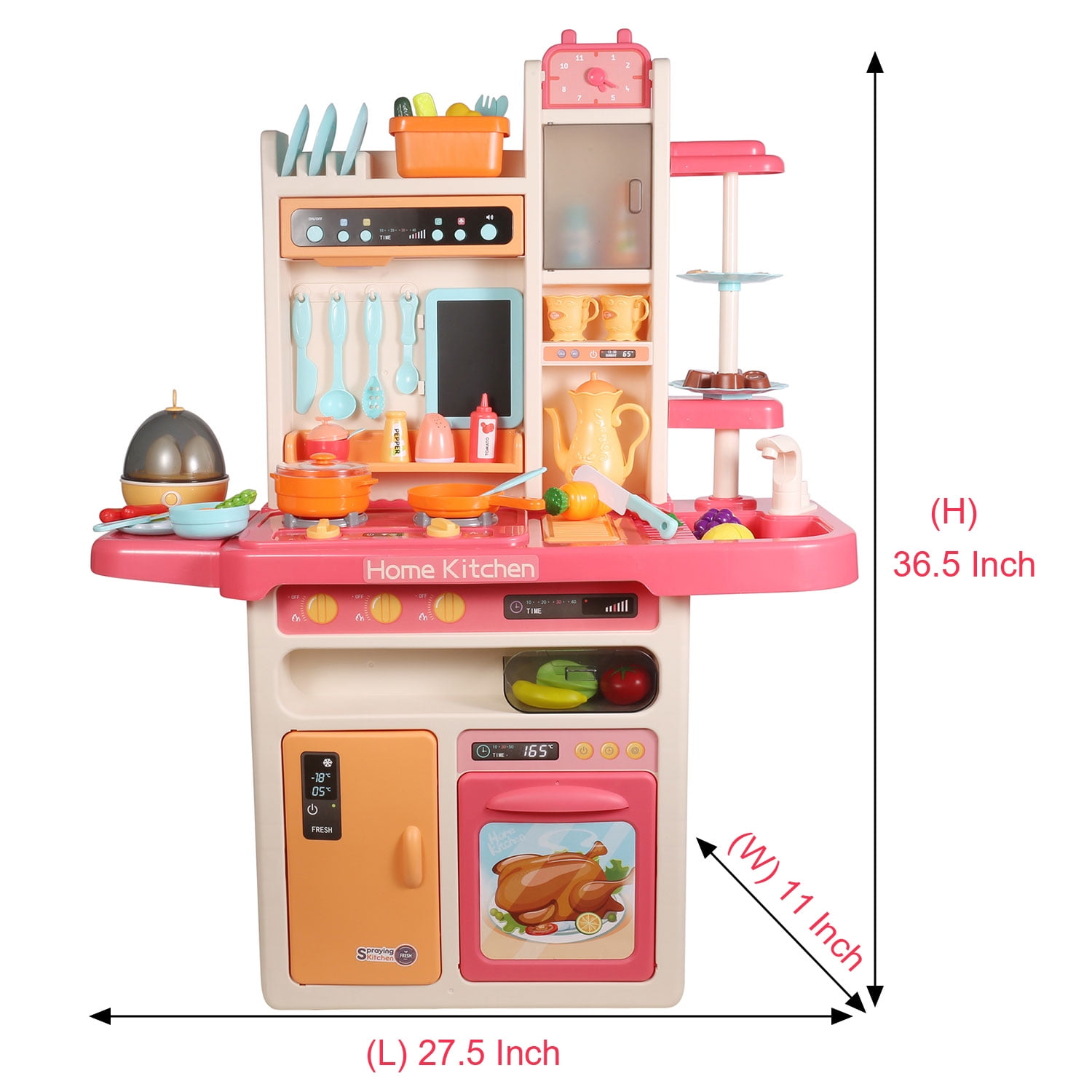 Kids Play Kitchen Playset for Boys & Girls with Realistic Lights & Sounds, Pretend Steam, Play Sink & Oven, Cutting Play Food, Menu Board & Other Kitchen Accessories Set, Play Kitchen Toys for Kids Specification: Material Type: ABS Product Dimensions: (L*W*H)28*11.2*36.8 inches Weight: 12 lb Let’s Play Cook & Serve Be a customer in your kid’s own restaurant! Let them tell you what is on the menu and place your order. Make sure to ask them lots of questions as they get cooking and give special requests to encourage their critical thinking. Authentic Stove Top Pretend stovetop burner features realistic working lights and sounds. Place the pot and pan on the stove, turn on the button, the burner will light up and produce a realistic cooking sounds and pretend steam.The real experience can adds to the role play fun! Play Sink with Running Water The kitchen sink toy comes with a real faucet, kids can wash vegetables and fruits in the sink and swivel faucet. When the cooking is done, chef can clean dishes in the sink. Built-In Storage Space Kitchen toys come with large capacity simulation oven, simulation refrigerator, storage cabinets and other storage space. Plenty of hanging storage keeps culinary equipment within arm’s reach. It will encourage your kids to keep his or her kitchen accessories organized, develop their good organizing habit. Variety of Accessories 65-Piece Play Kitchen Accessory Set included stovetop, play sink with running water, cutting play foods, egg steamer, Mini blackboard and kinds of kitchen accessories. Various cooking utensils for your little one to have countless hours of fun and play.