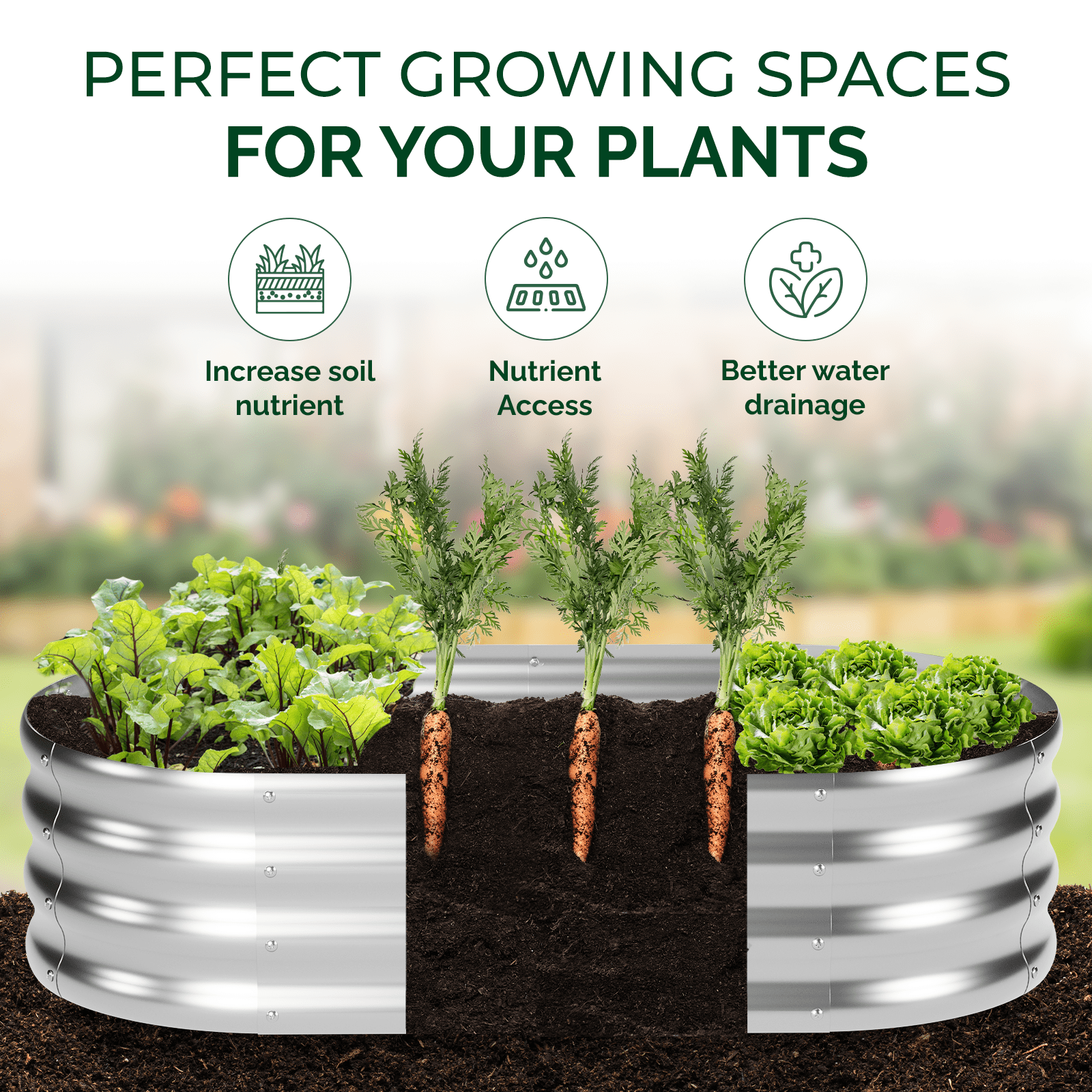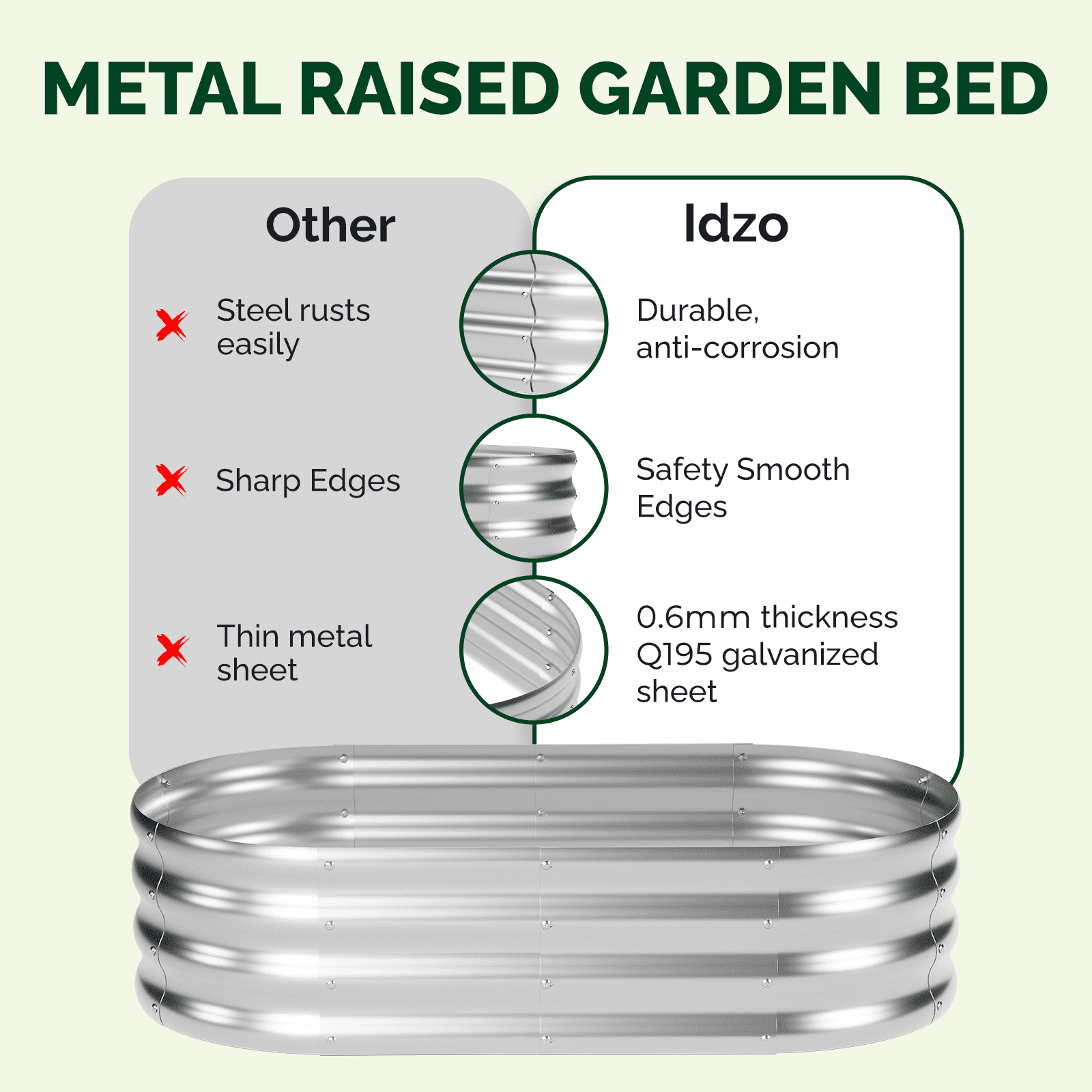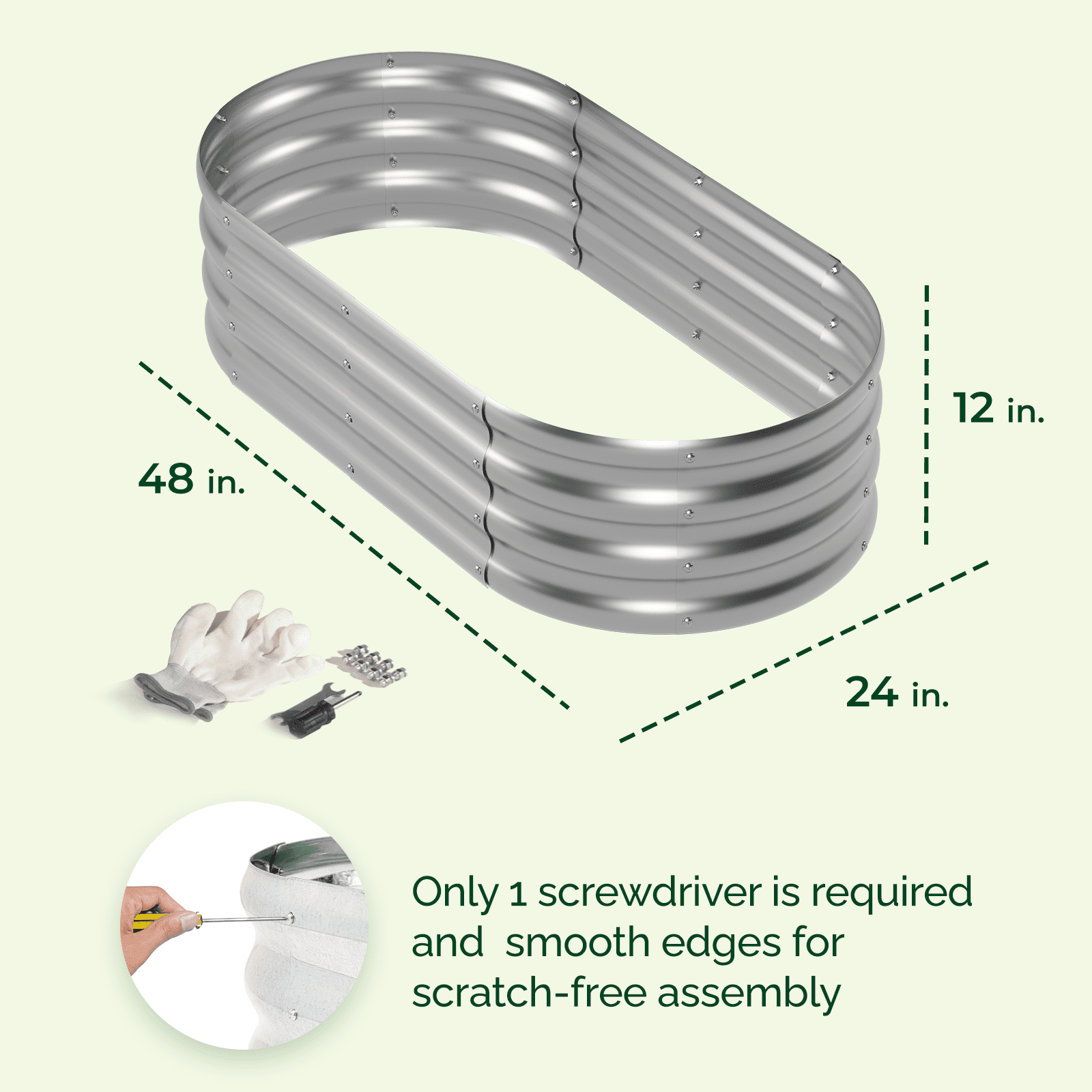 Dimension LxWxH : 24 x 48 x 12 inches Material: Q195 Galvanized Metal Sheet Shape: Oval Item weight: 11 lbs Number of pieces: 10 Included Components: Screwdriver, Bolt & Nut, Glooves, Hex Wrench STABLE STRUCTURE: Our 3/4 inch thick oval galvanized steel raised garden bed (4x2x1 feet) offers superior stability over rectangular beds. The open base allows for soil amendment with compost, enhancing soil quality. DURABLE COATING: Made from Q195 galvanized metal, our garden bed has two layers of zinc coating to prevent corrosion, ensuring lasting durability. EASY INSTALLATION: Designed with a smooth, flat surface and no sharp edges, our garden bed assembles in about 5 minutes with a single screwdriver. ROUNDED EDGE PROTECTION: The rounded edges protect both plants and people. Included gloves provide comfort and protection while gardening. OPEN BASE DESIGN: The open base promotes proper drainage and root growth, and allows customization with additional supports or easy access for beneficial soil critters. THICK AND DURABLE: Built with 0.6mm thick metal panels and a three-layer coating, our raised planter box resists rust and corrosion, ensuring longevity and stability.