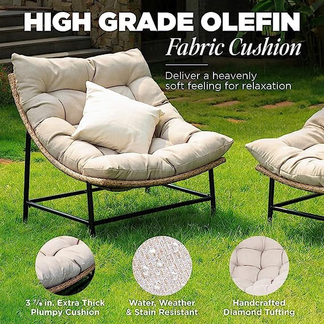 ⛅ UNIQUE SCOOP DESIGN. Our oversized curved 2 person papasan chair with a design that perfectly contours your body shape for an unparalleled lounging experience; With its sturdy wicker build, the rattan outdoor papasan chair set can hold up to 500 pounds ⛅ OVERSIZED OLEFIN THICK CUSHION. High density premium Olefin cushion fabric is highly resistant to water, weather, wrinkles, and stains; The diamond tufting maintains the pillow’s shape, and the added fiber makes our wicker scoop chair set heavenly soft ⛅ UPGRADED 2000 HOURS UV RESISTANT WICKER. The upgraded wicker of our rattan outdoor reading chair has an impressive 2000 hours of UV resistance, all weather durability, color fastness, and water resistance to keep its vibrant look for years to come