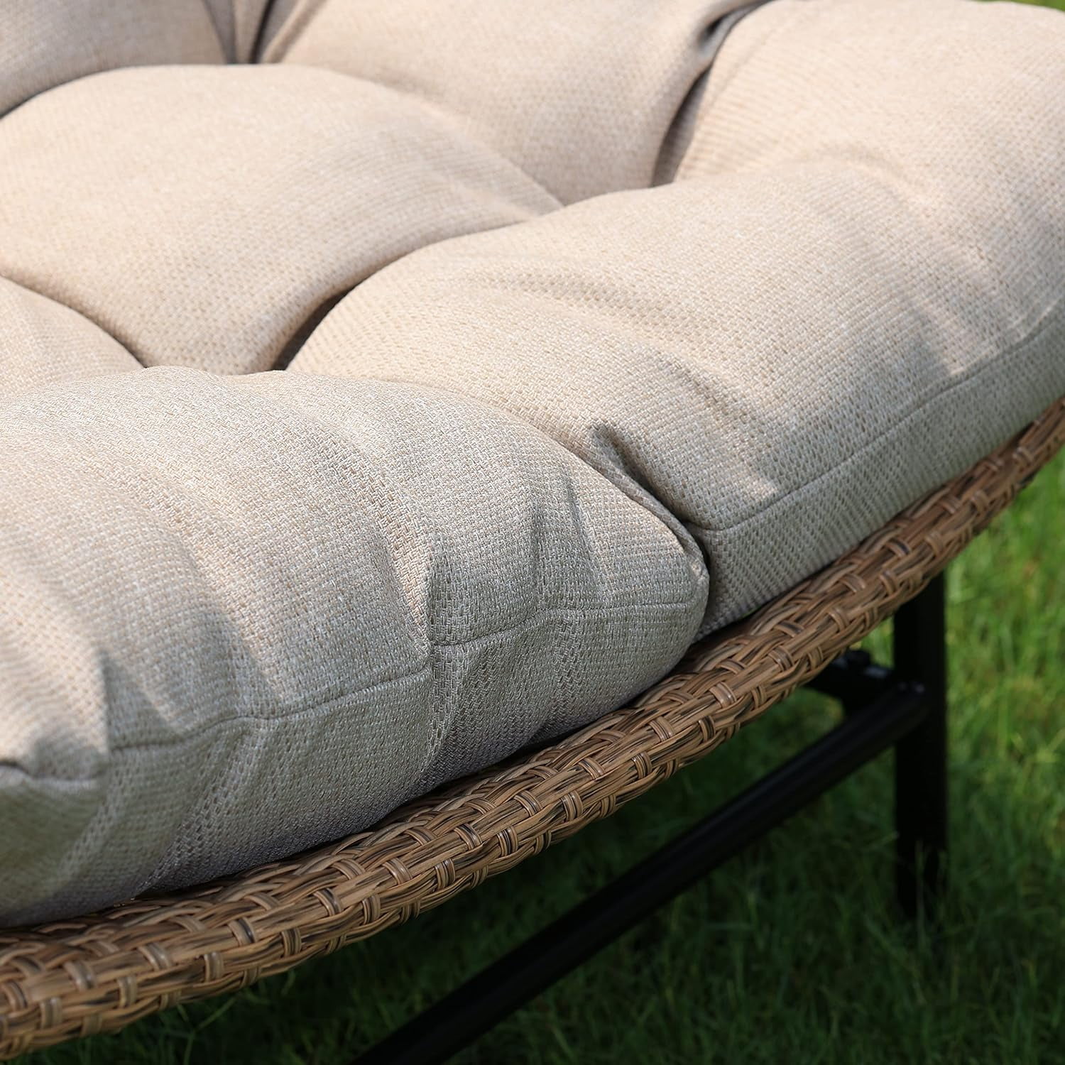 The generously-sized rattan papasan chairs are a perfect fit for any outdoor setting, whether it’s a quaint cottage garden or a modern urban patio. These oversized outdoor rattan chairs not only offer comfort but also boast a stylish and captivating design, making them a unique and eye-catching addition to your furniture collection. Transform your living space into a tranquil oasis with our patio double papasan chair complete with cushions and frames. About our product: Our oversized curved design effortlessly conforms to your body, delivering an unparalleled lounging experience. The large outdoor papasan chair is built to withstand the test of time and can support up to 500 pounds. Crafted from high-density Olefin cushion fabric, it resists water, wrinkles, stains, and the elements. Our cushion maintains its distinctive shape with diamond tufting, while added fibers provide a luxuriously soft and heavenly feel. Our wicker 2-person papasan chair set is engineered to endure 2000 hours of intense UV exposure, offering all-weather durability, colorfastness, and water resistance. This luxurious set comprises two oversized patio chairs, each adorned with a comfortable cushion. Blending traditional and modern styles, our rattan scoop chairs enhance any outdoor space with an attention-grabbing touch of elegance. Assembly of the two rattan chairs is quick and hassle-free, thanks to the included tools and instructions. Keeping your wicker oversize papasan chair set in top condition is a breeze; simply wipe it down with a damp cloth, and for added longevity, store the rattan chairs indoors when not in frequent use