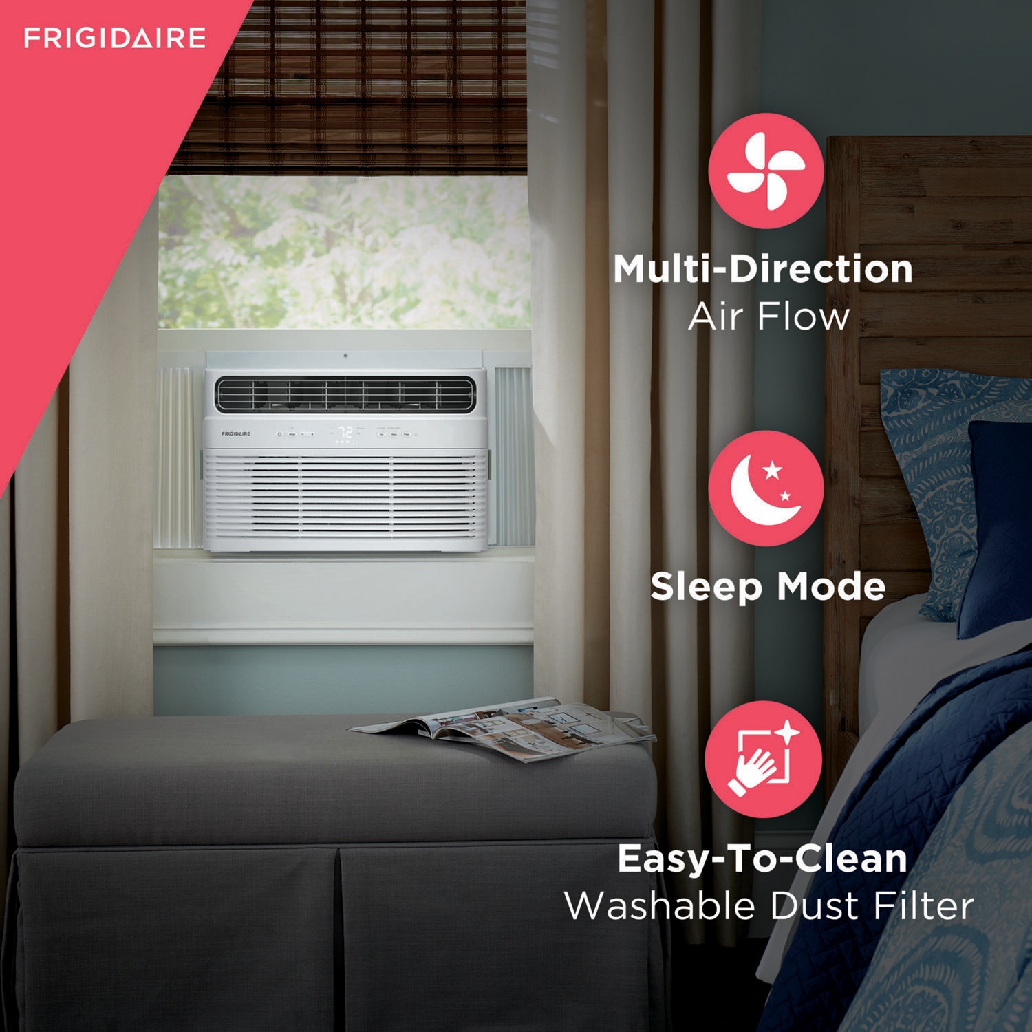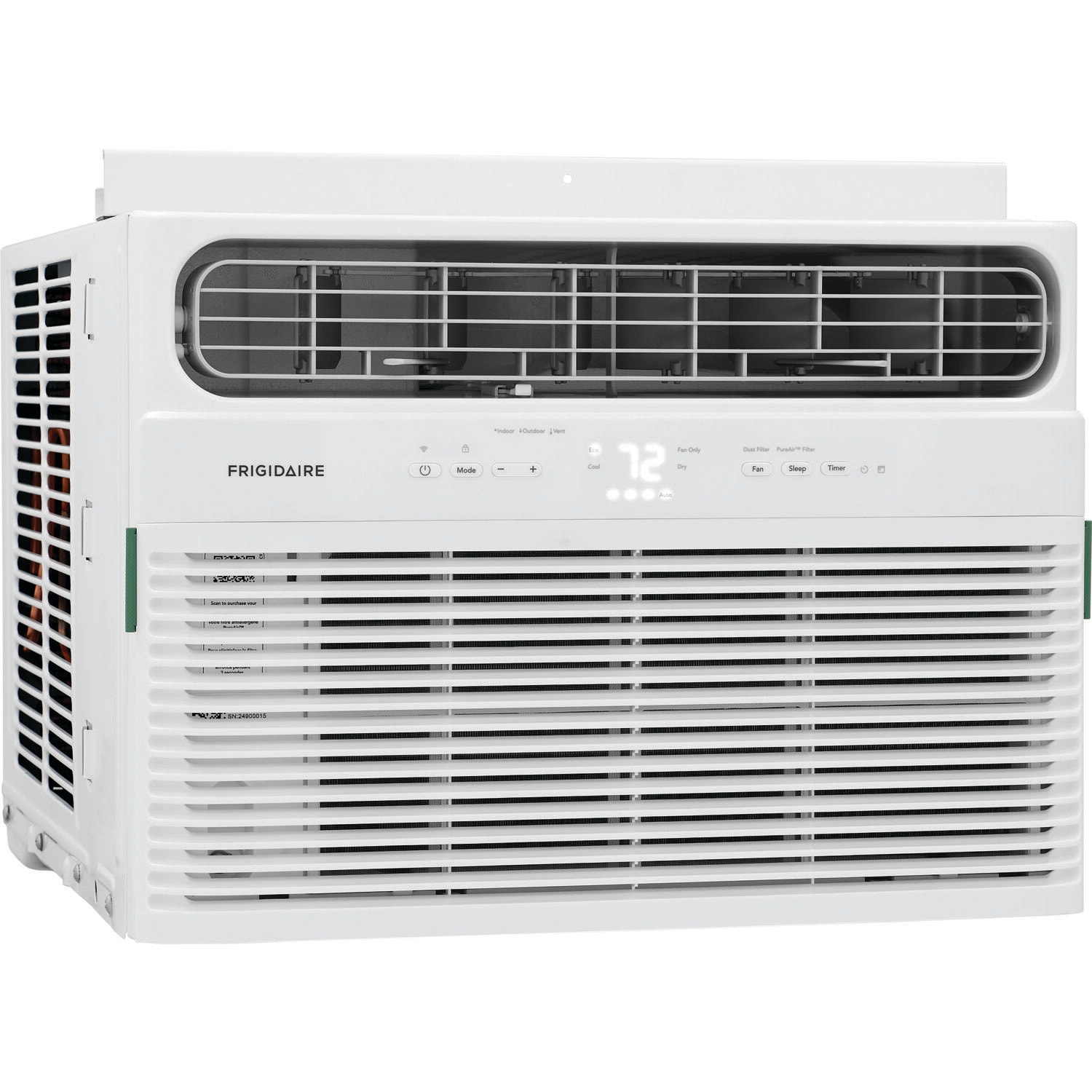 The Frigidaire 12,000 BTU window air conditioner allows you to enjoy optimum circulation and cooling with 6-way directional airflow and three different fan speeds. Designed for rooms up to 550 square feet, this unit is perfect for apartments, offices, bedrooms, or any medium sized space. Control your room’s temperature anywhere, anytime from your smart device with the Frigidaire app. At your convenience remotely turn the unit on or off, change temperatures, control modes, create custom schedules, and adapt fan speeds to best meet your comfort. Enjoy maximum comfort and quiet operation throughout the evening hours with sleep mode, where the temperature gradually increases a few degrees over the course of the evening. Our easy-to-clean washable dust filter captures dust from the air and helps keep your air conditioner working efficiently, and you’ll know when it’s time to clean with the Clean Filter Alert. Precisely control the temperature and fan speed from across the room and remain comfortable at all times with your air conditioner’s remote control. These convenient features combine to give you a dependable air conditioner that will keep your home cool and comfortable.