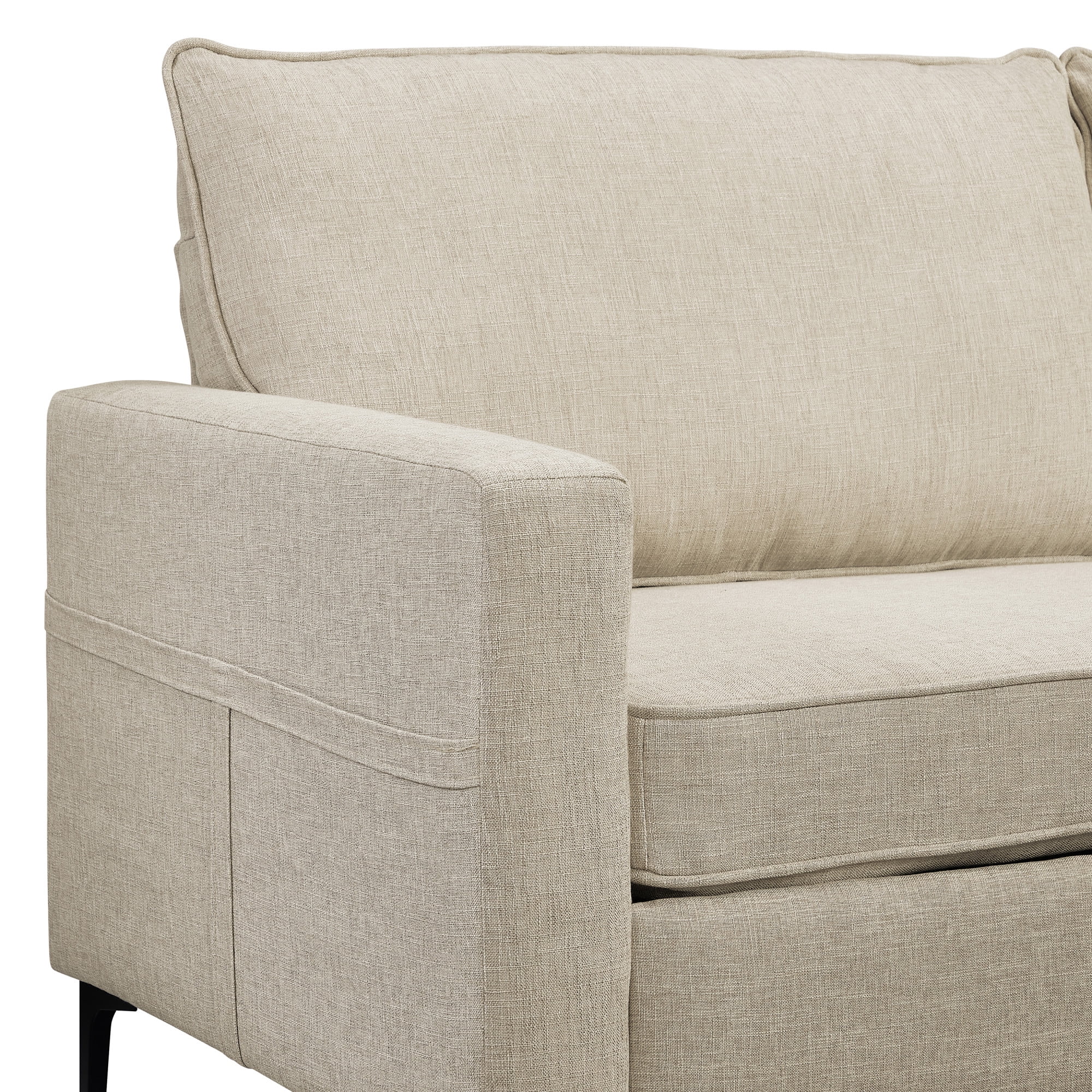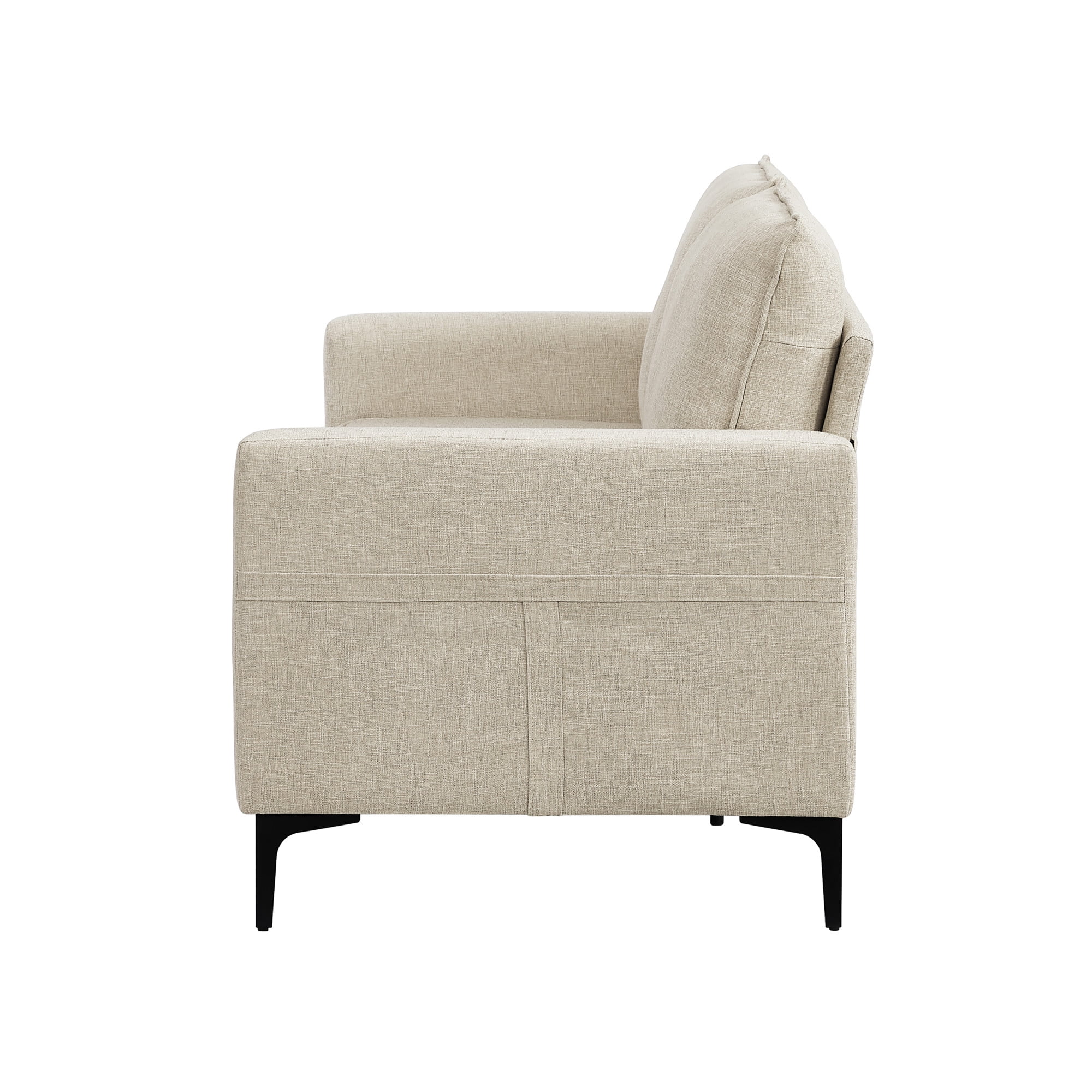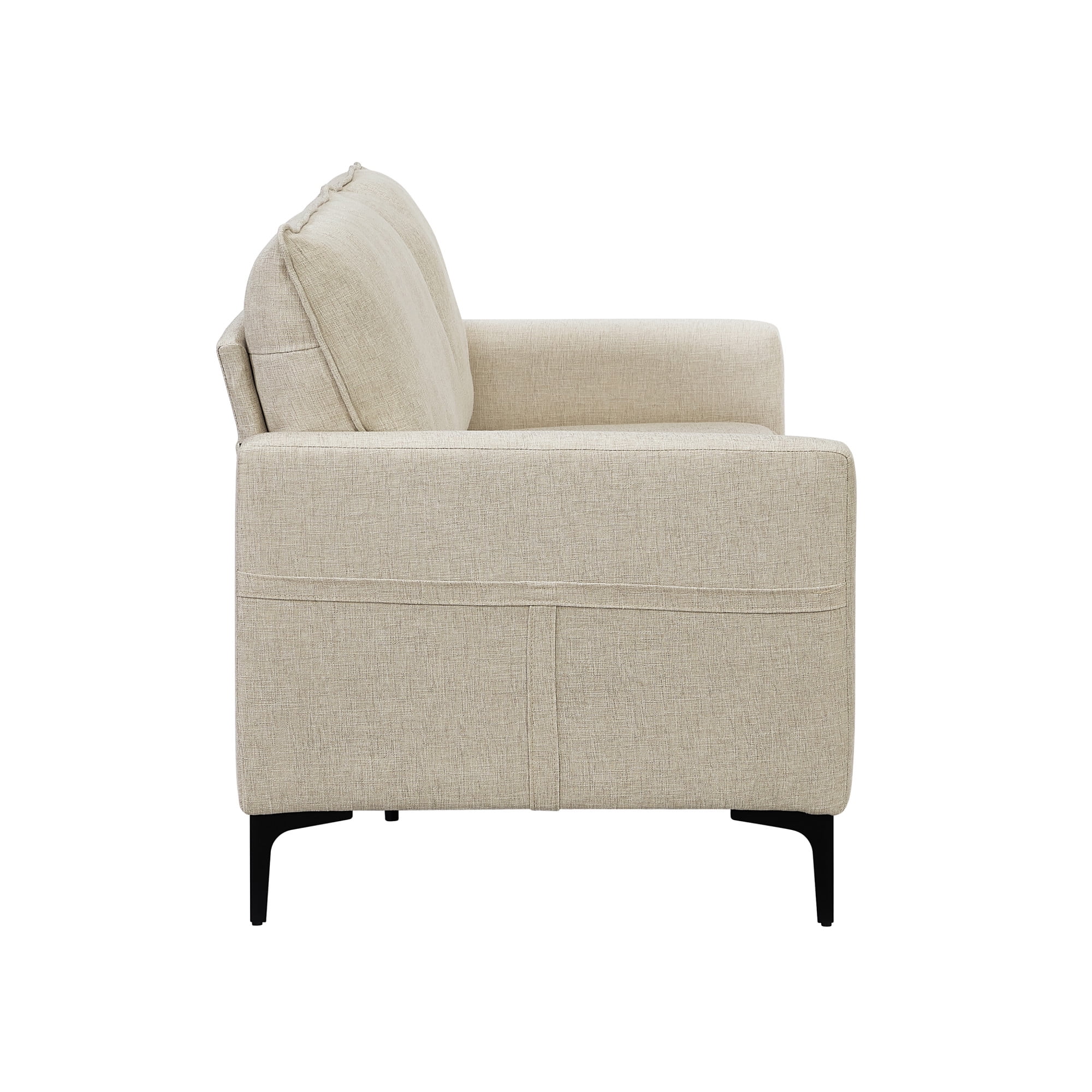 You work hard for relaxing nights on the couch, and once they come, you want everything you need within reach. With this Gray Modern Sofa with dual USB ports and side pockets for device charging and storage, stay connected and relaxed without ever getting up. Covered in a beige linen upholstery that blends into any design scheme, this 2-cushion sofa with matte black metal legs has a contemporary-meets-farmhouse styling that makes it a timeless piece. Plus, since it’s perfectly sized and easy to assemble and disassemble, moving it from room to room or house to house is a breeze. Assembly required.