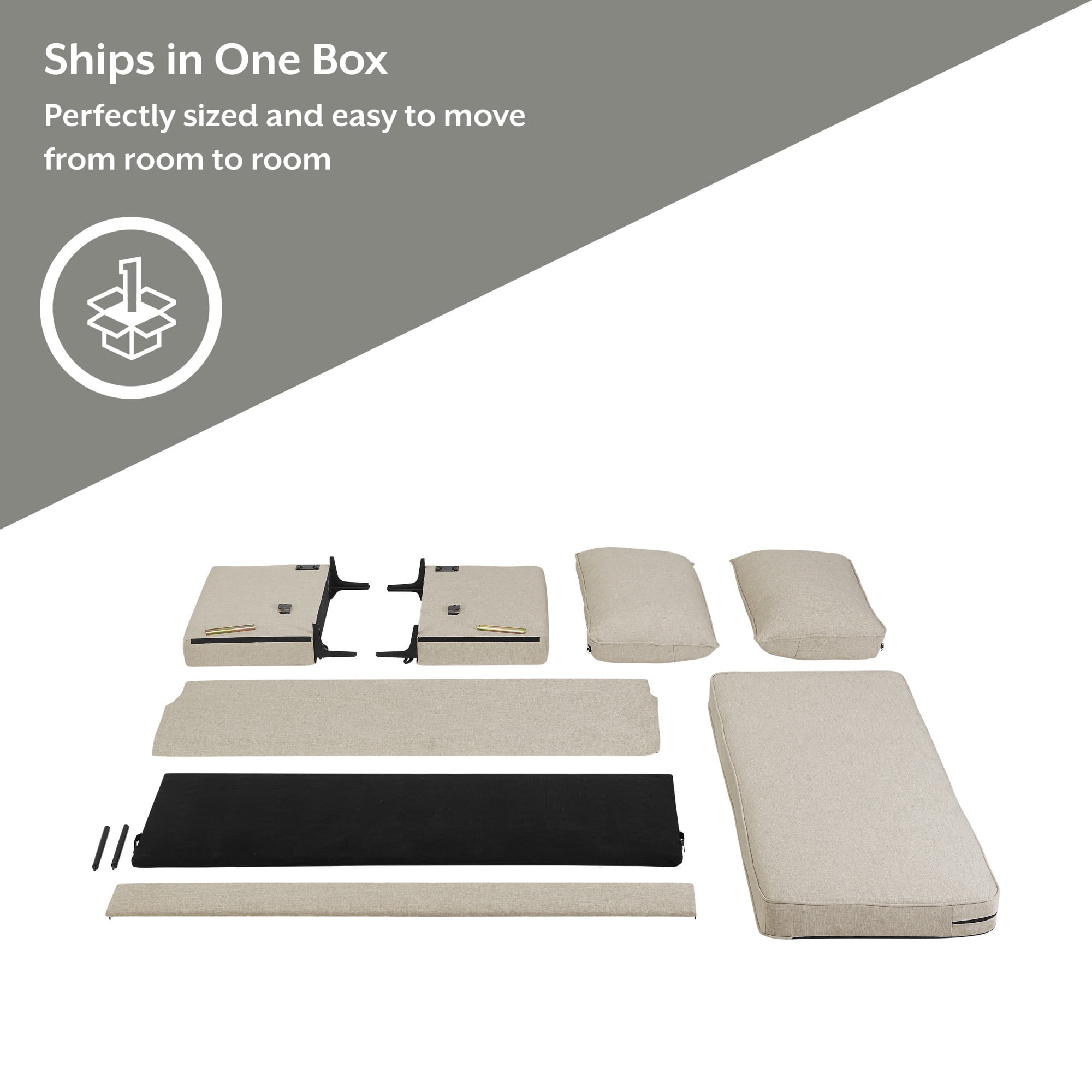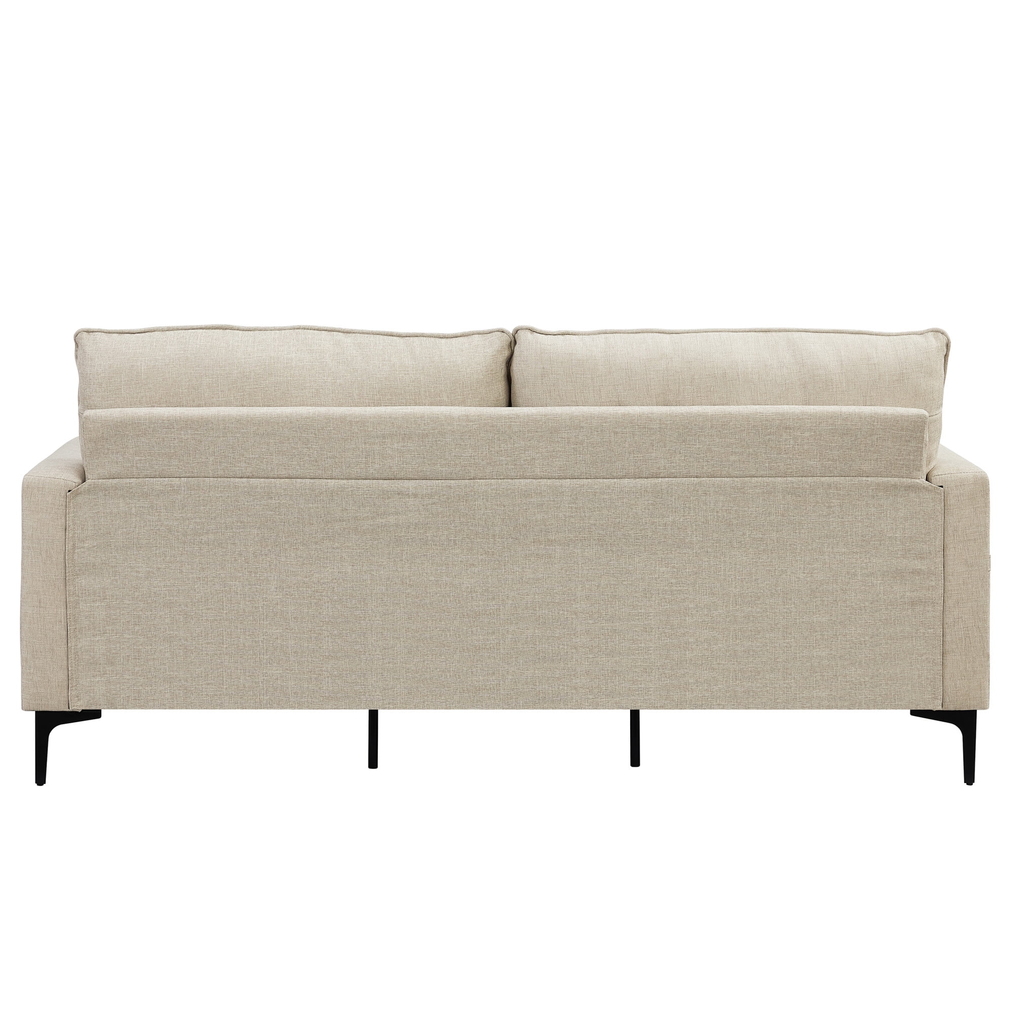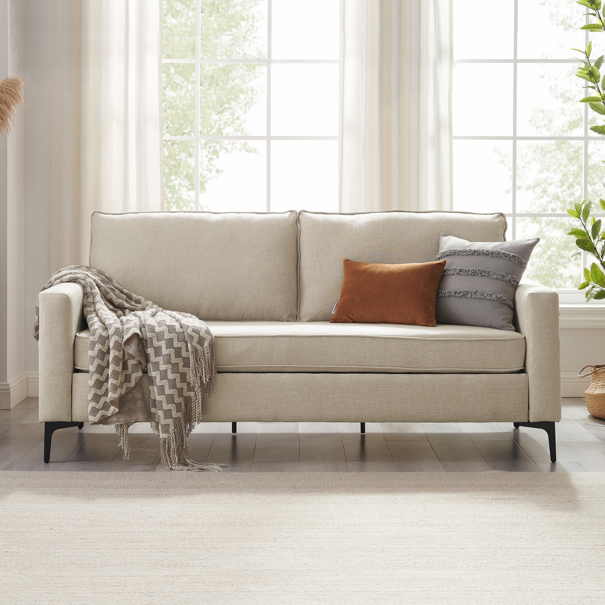 You work hard for relaxing nights on the couch, and once they come, you want everything you need within reach. With this Gray Modern Sofa with dual USB ports and side pockets for device charging and storage, stay connected and relaxed without ever getting up. Covered in a beige linen upholstery that blends into any design scheme, this 2-cushion sofa with matte black metal legs has a contemporary-meets-farmhouse styling that makes it a timeless piece. Plus, since it’s perfectly sized and easy to assemble and disassemble, moving it from room to room or house to house is a breeze. Assembly required.
