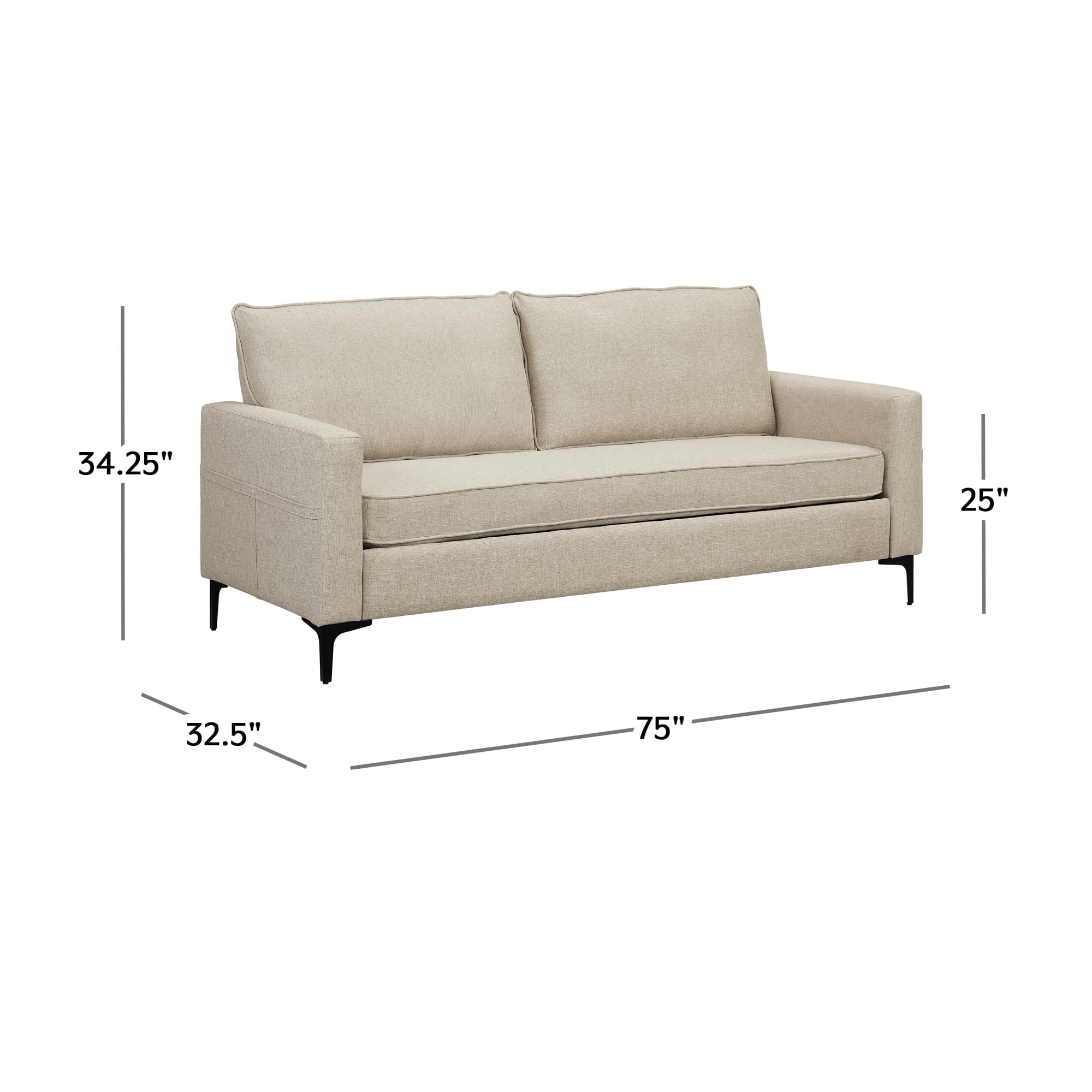 Modern farmhouse 3-seater sofa in durable 100% beige polyester linen Metal legs, full seat cushion, and 2 non-reversible back cushions 2 USB ports under each arm, with corresponding storage pockets Overall Dimensions: 34.25H x 75W x 32.5D; Seat Cushion Thickness: 6.5″; Arm Height: 25H Easy assembly; no tools required; recommend two people for assembly Sofa ships in one box; Perfectly sized and easy to move from room to room Pocketed coil high density wrapped seat cushions Durable and easy to clean polyester fabric makes this sofa perfect for an active household; Spot clean with a damp cloth or sponge Recommended Maximum Weight Capacity: 750lbs For residential usage only Patent Pending